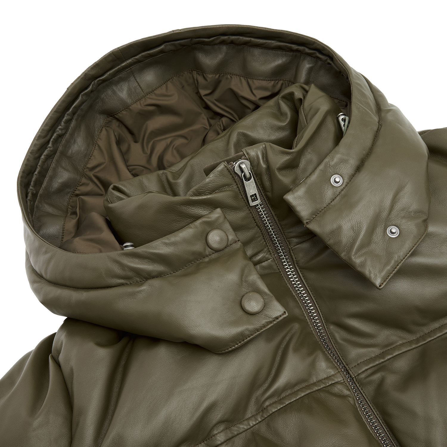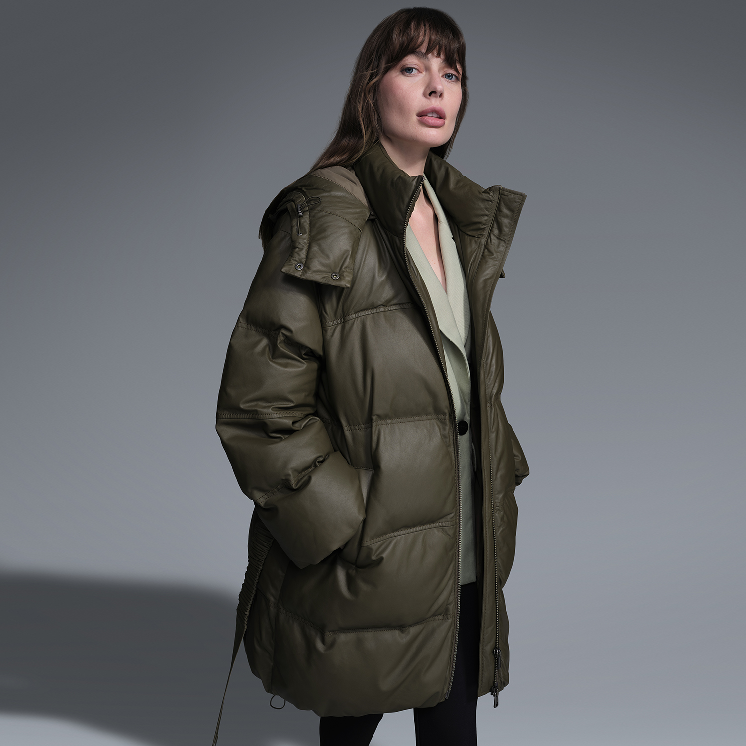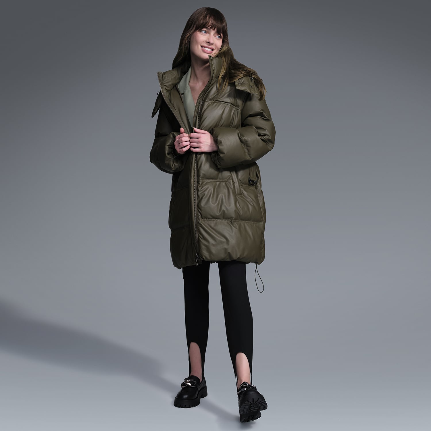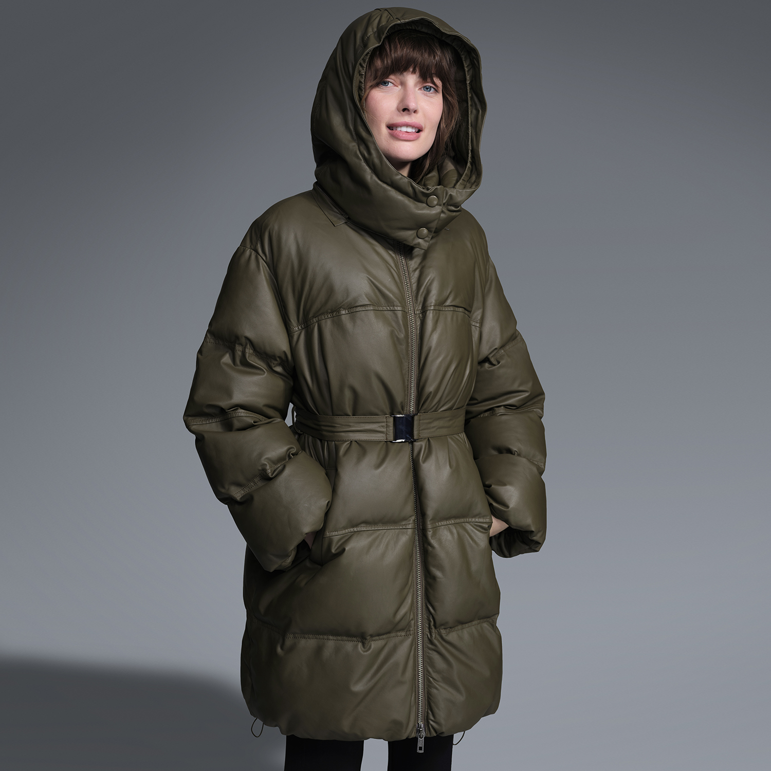 Kadın çıkma kapüşonlu puffer kaban, hakim yakalıdır.