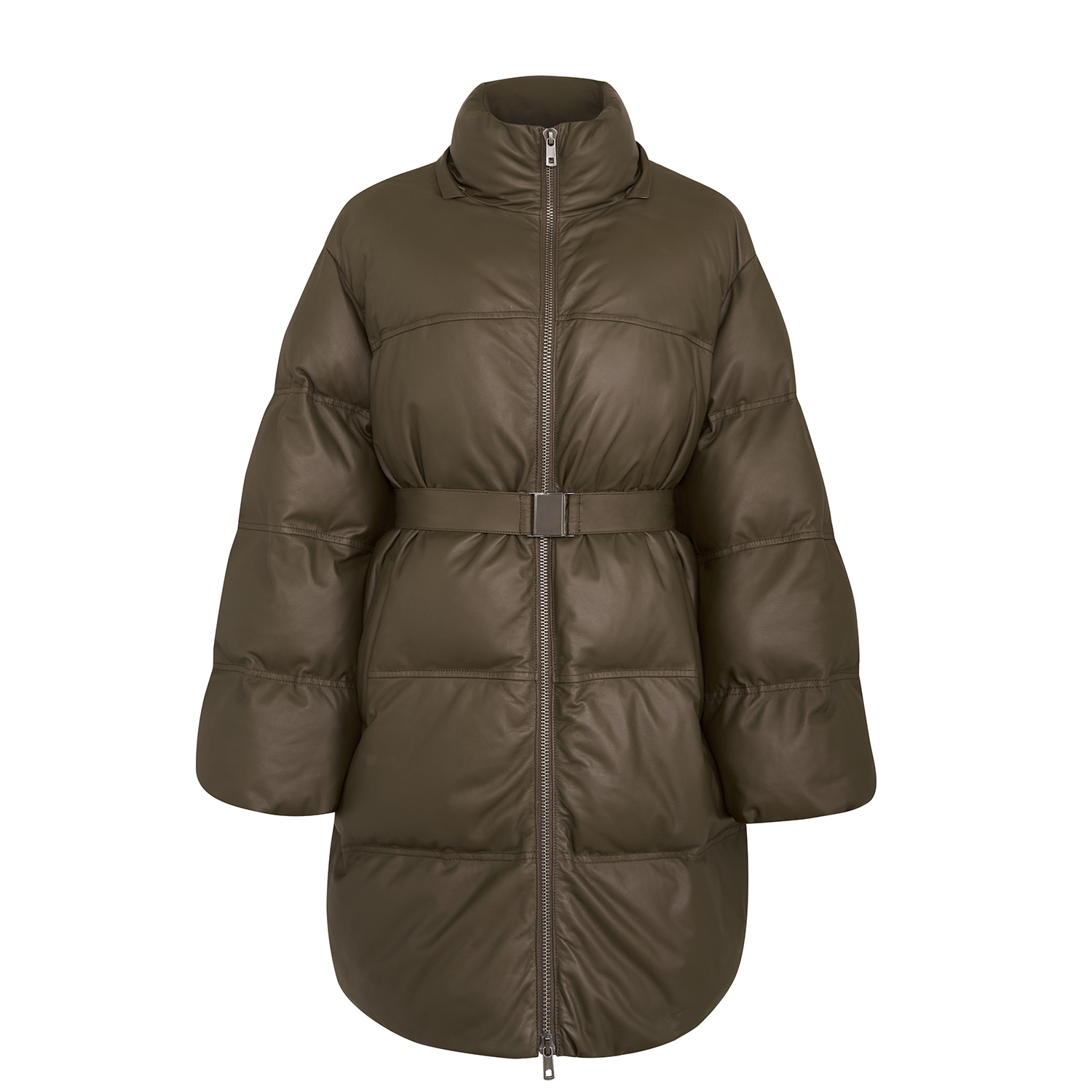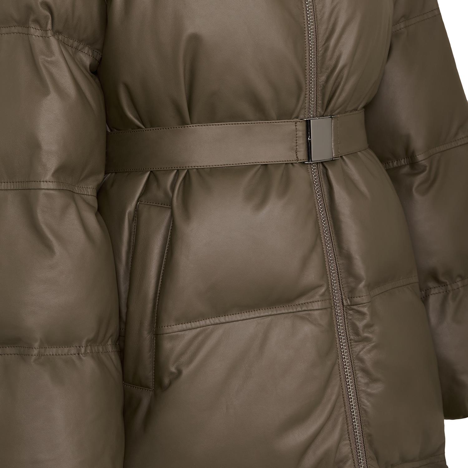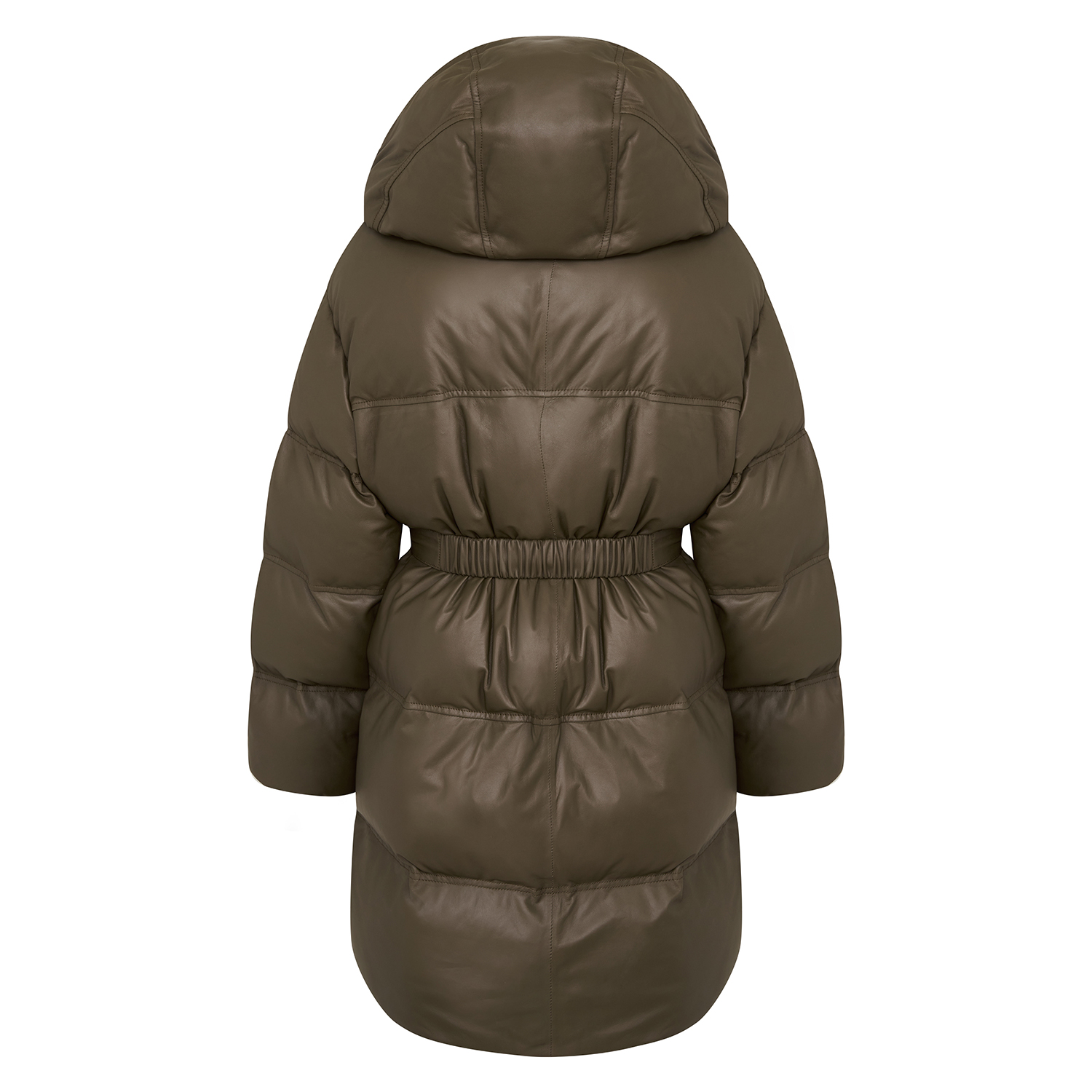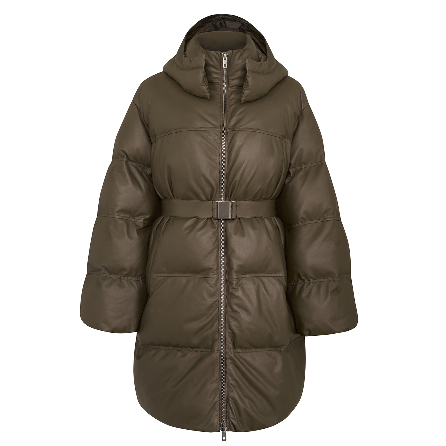 Kadın çıkma kapüşonlu puffer kaban, hakim yakalıdır.