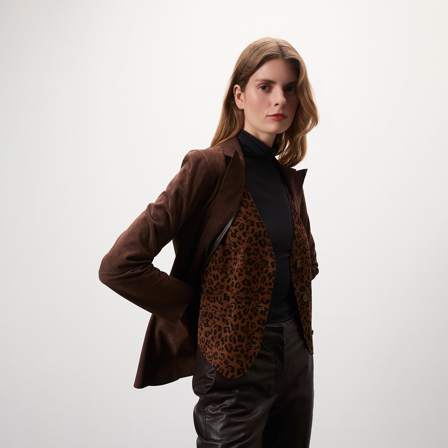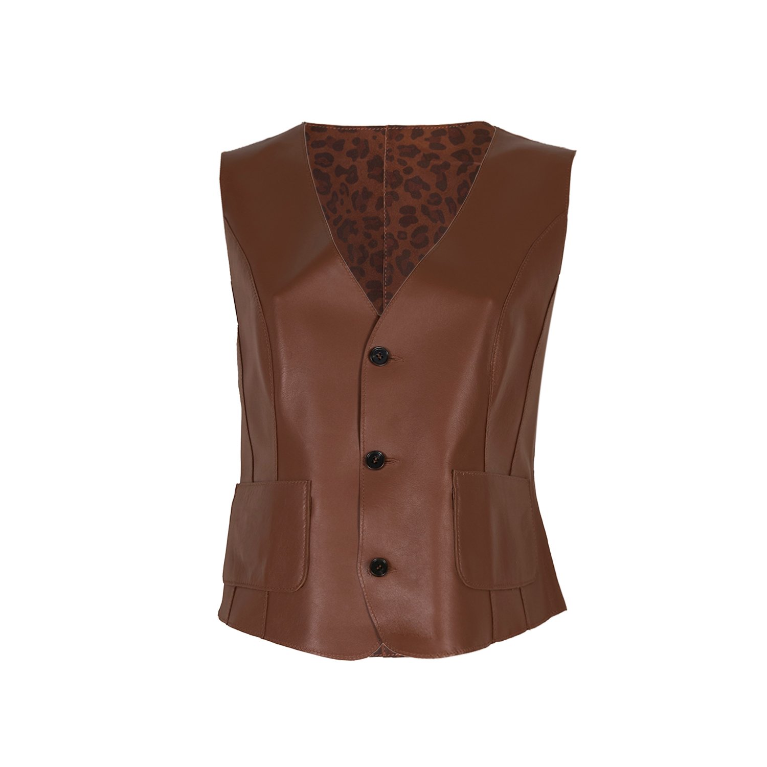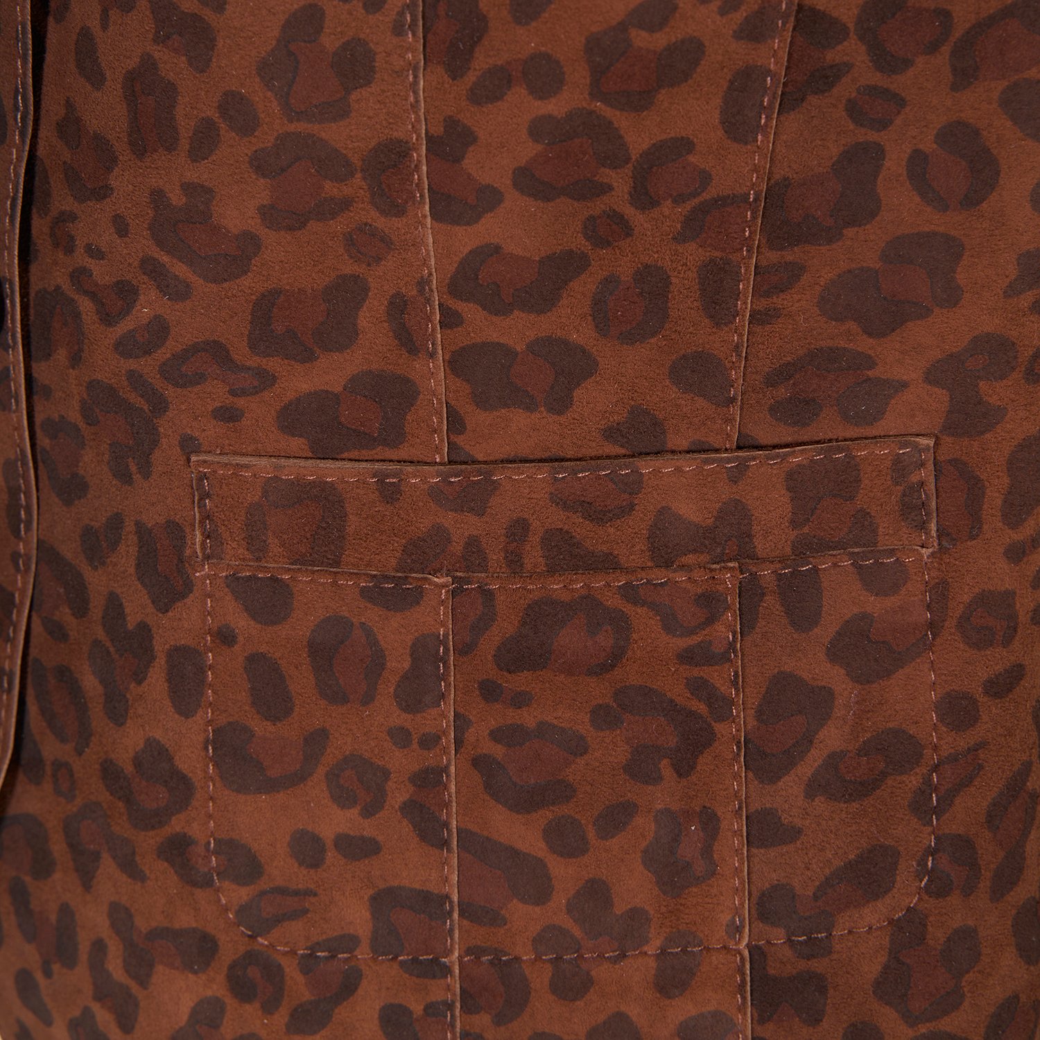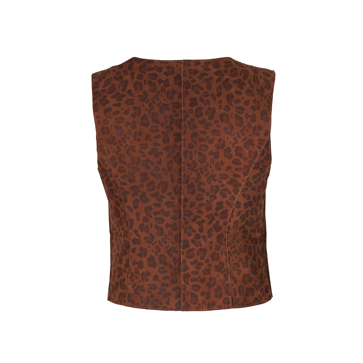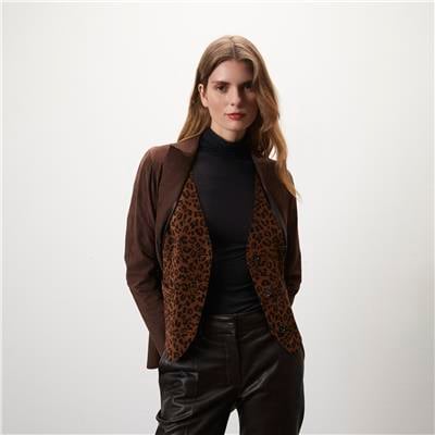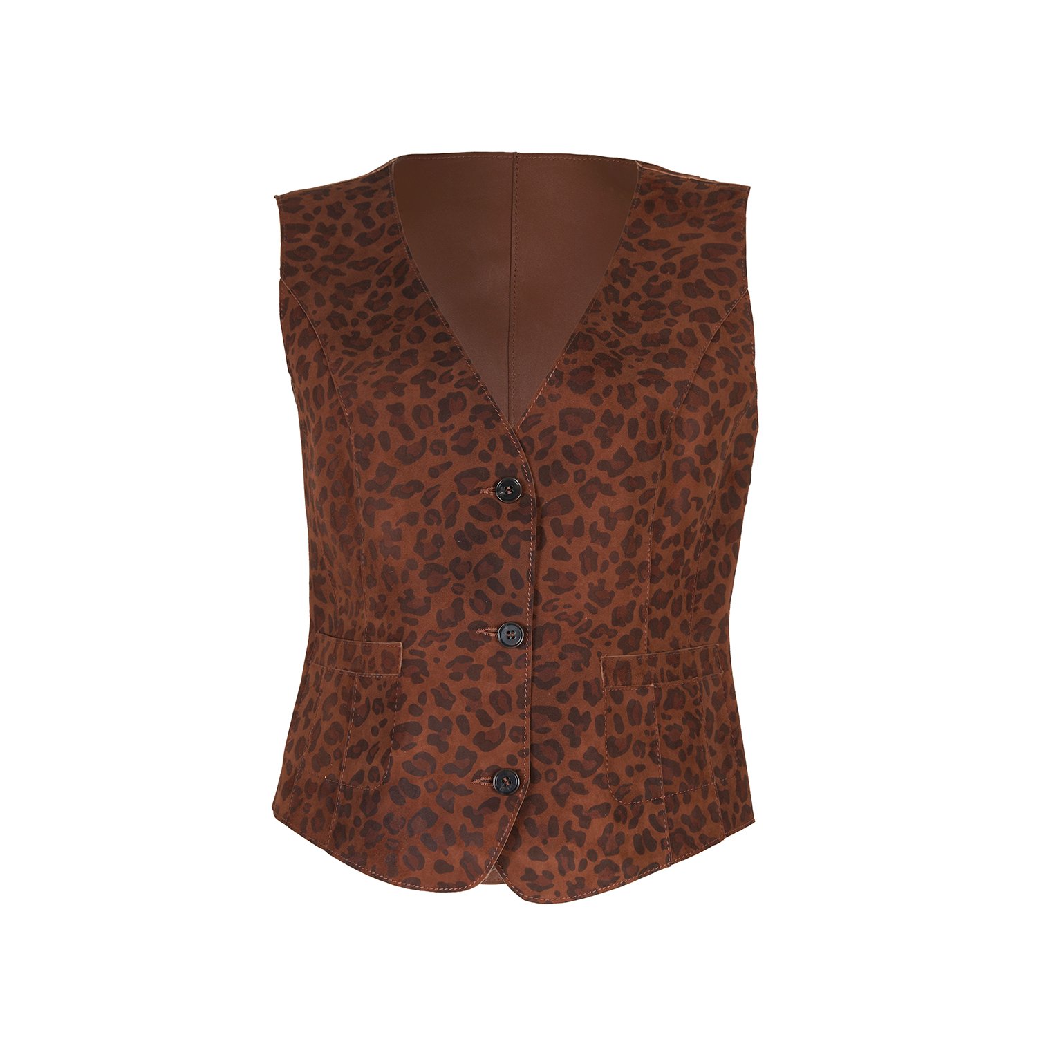 Kadın çift taraflı leopar desenli süet yelek, önden düğme kapamalıdır.