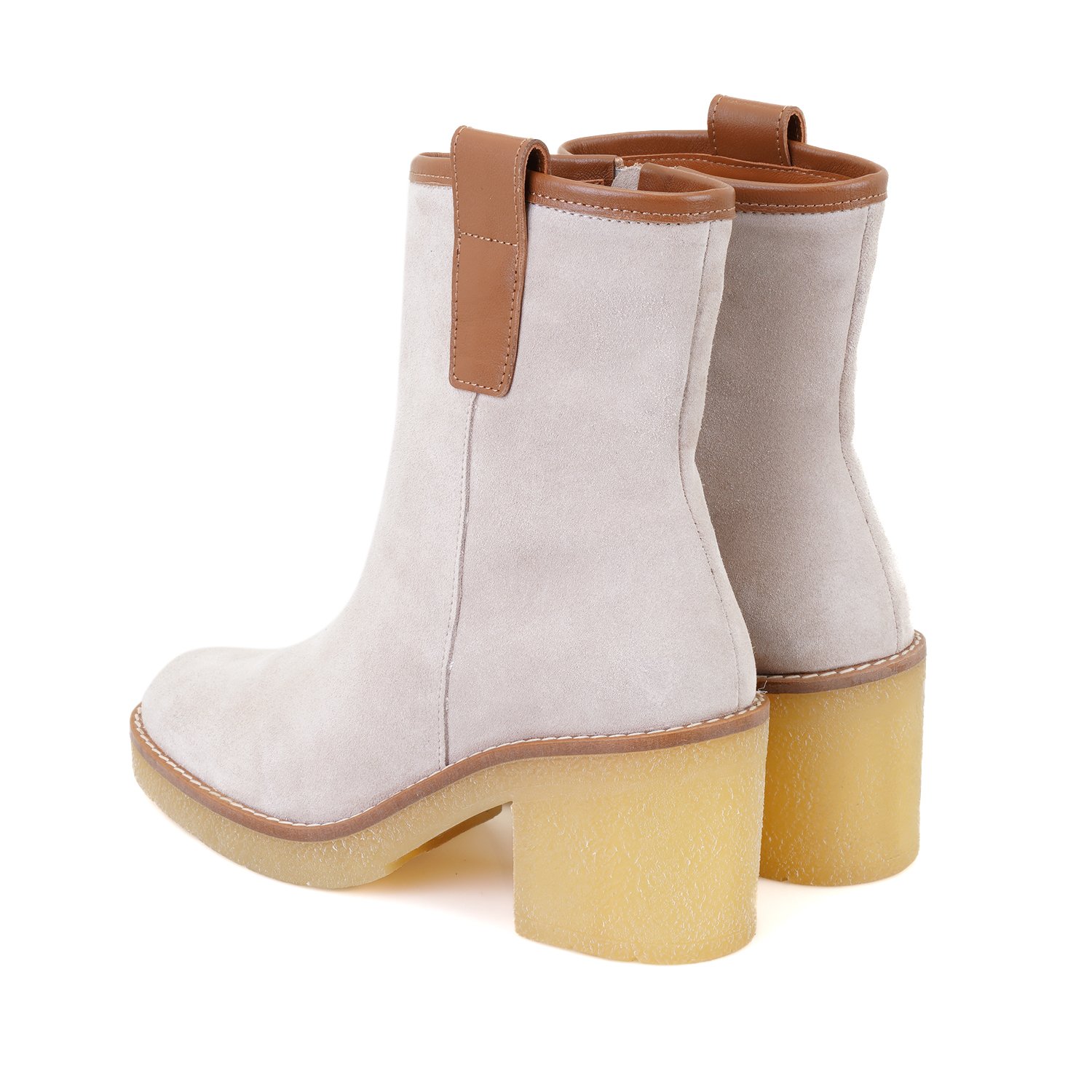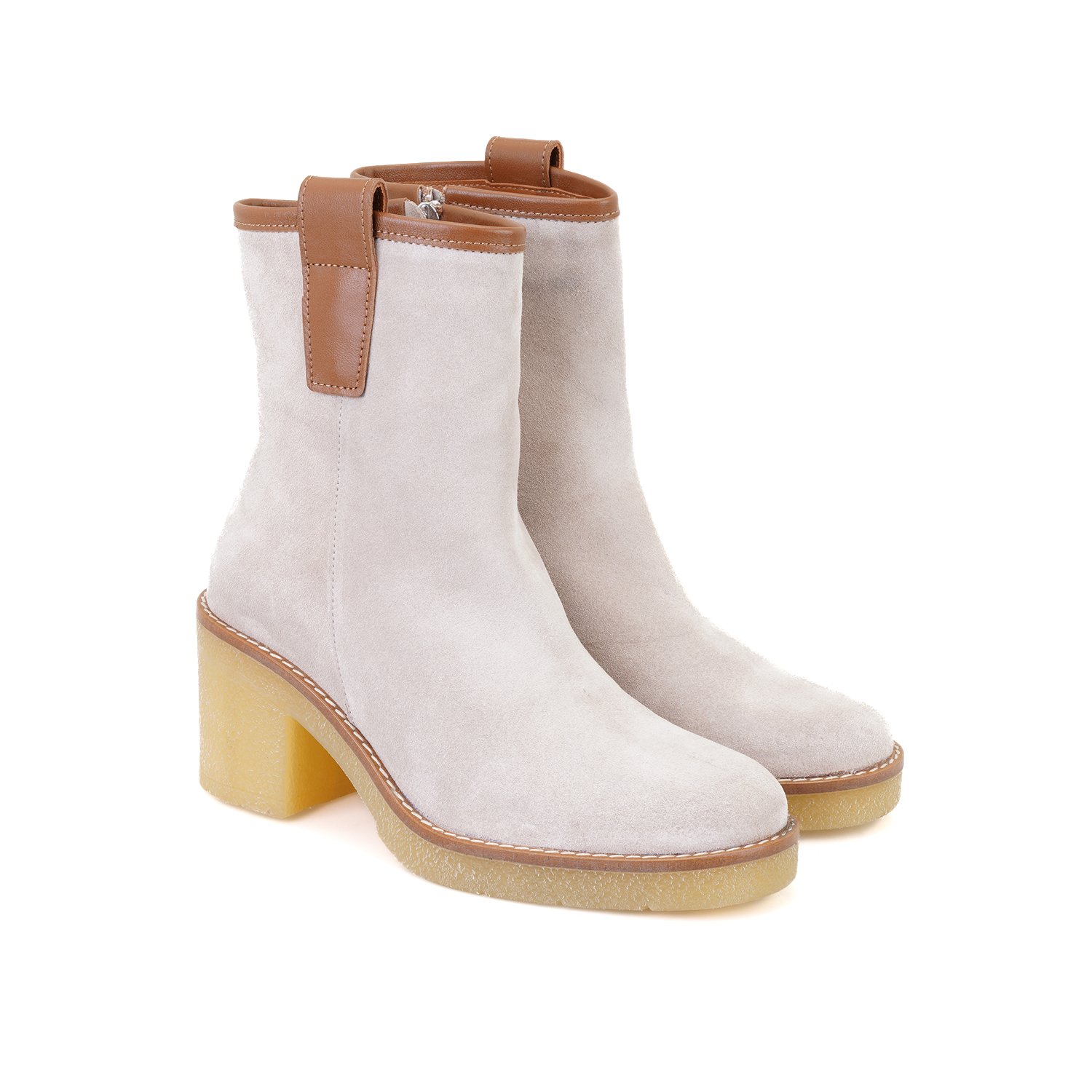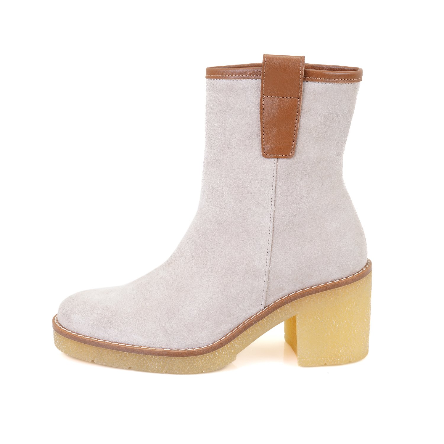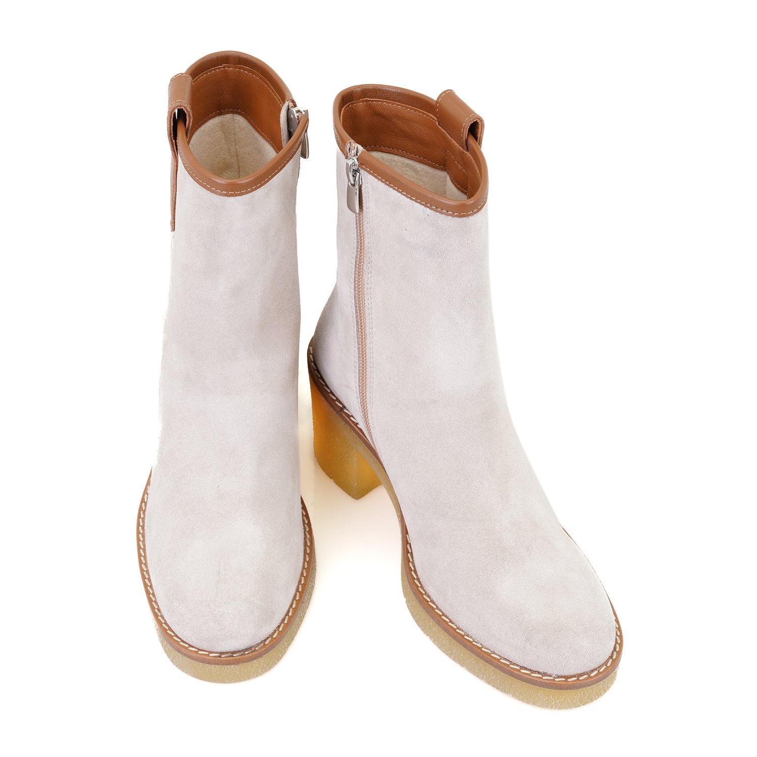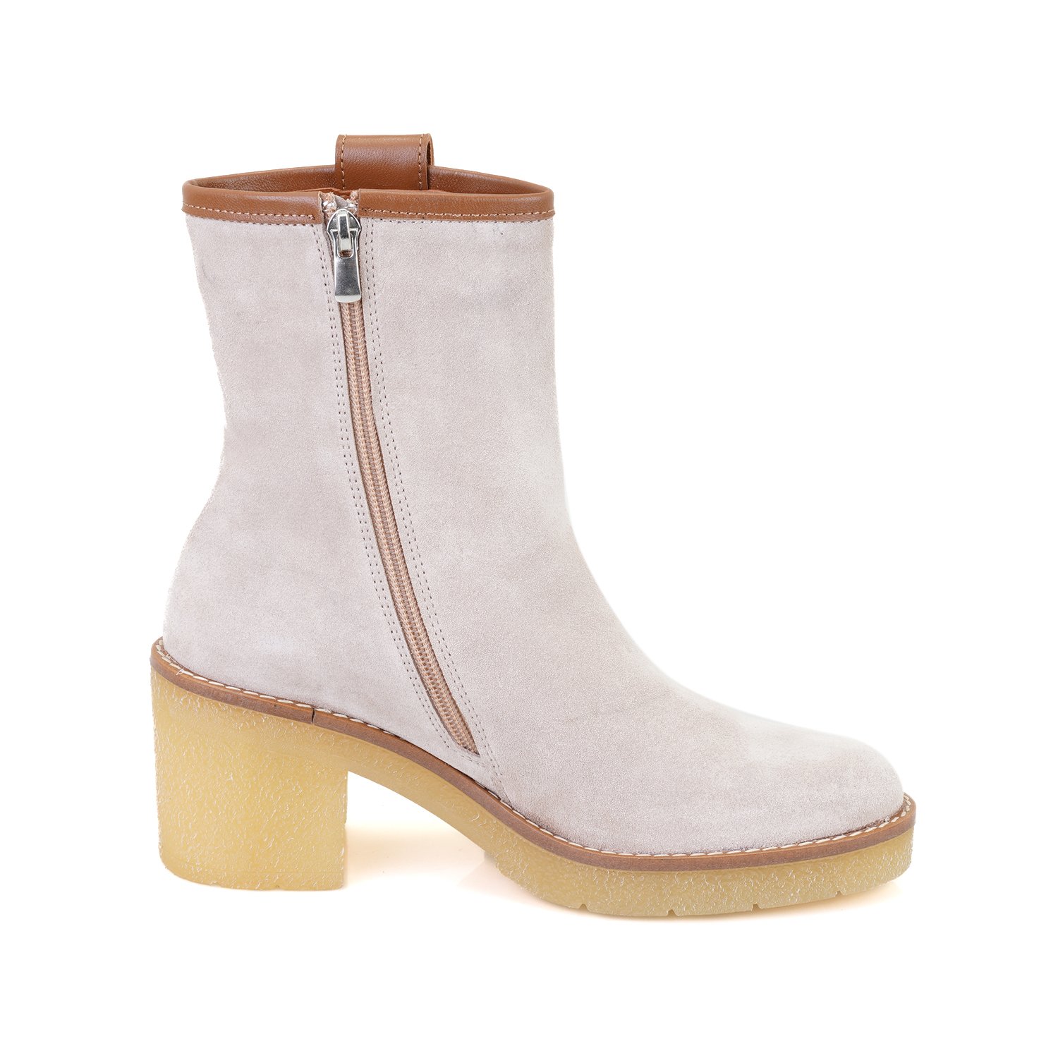 %100 süet deri, deri iç tabanlı, tekstil iç astarlı, içten fermuarlı, kauçuk tabanlı, kadın topuklu bot.