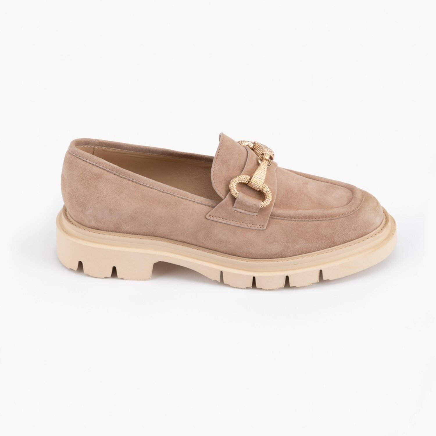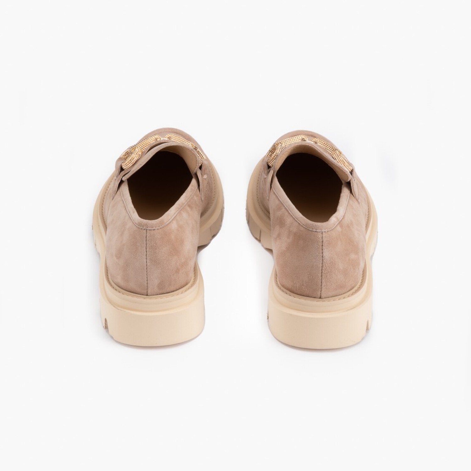 Altın aksesuarlarla süslenmiş bej rengi süet üst kısım, kauçuk taban ve deri astar.