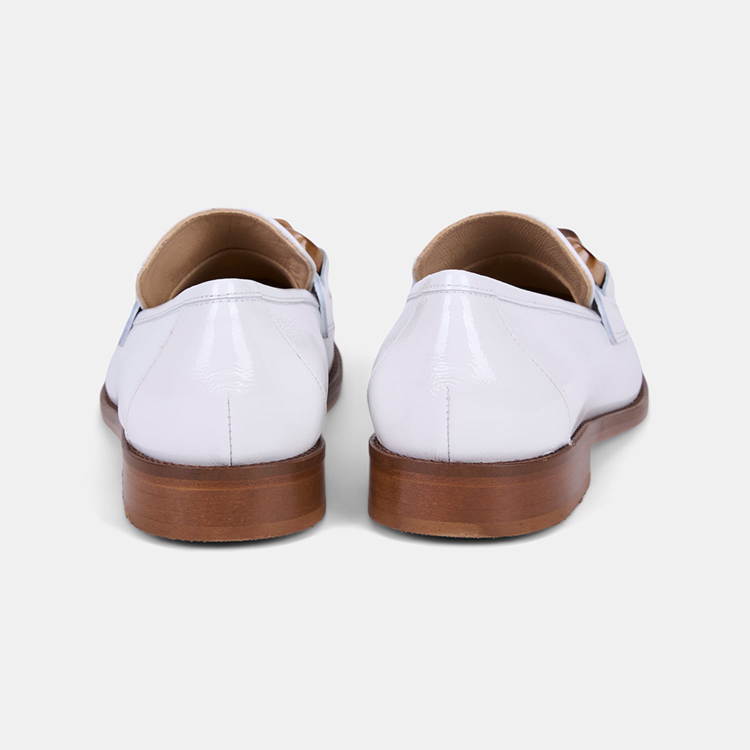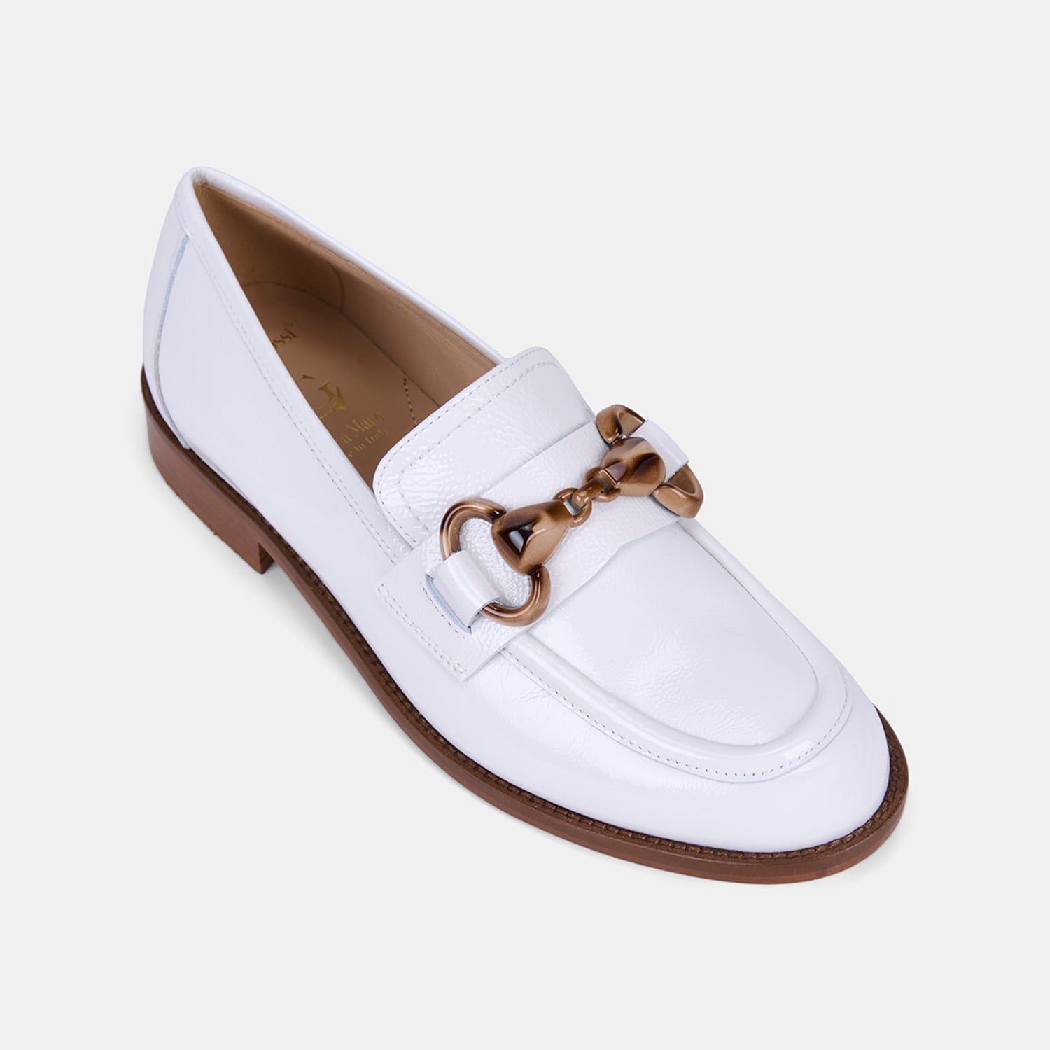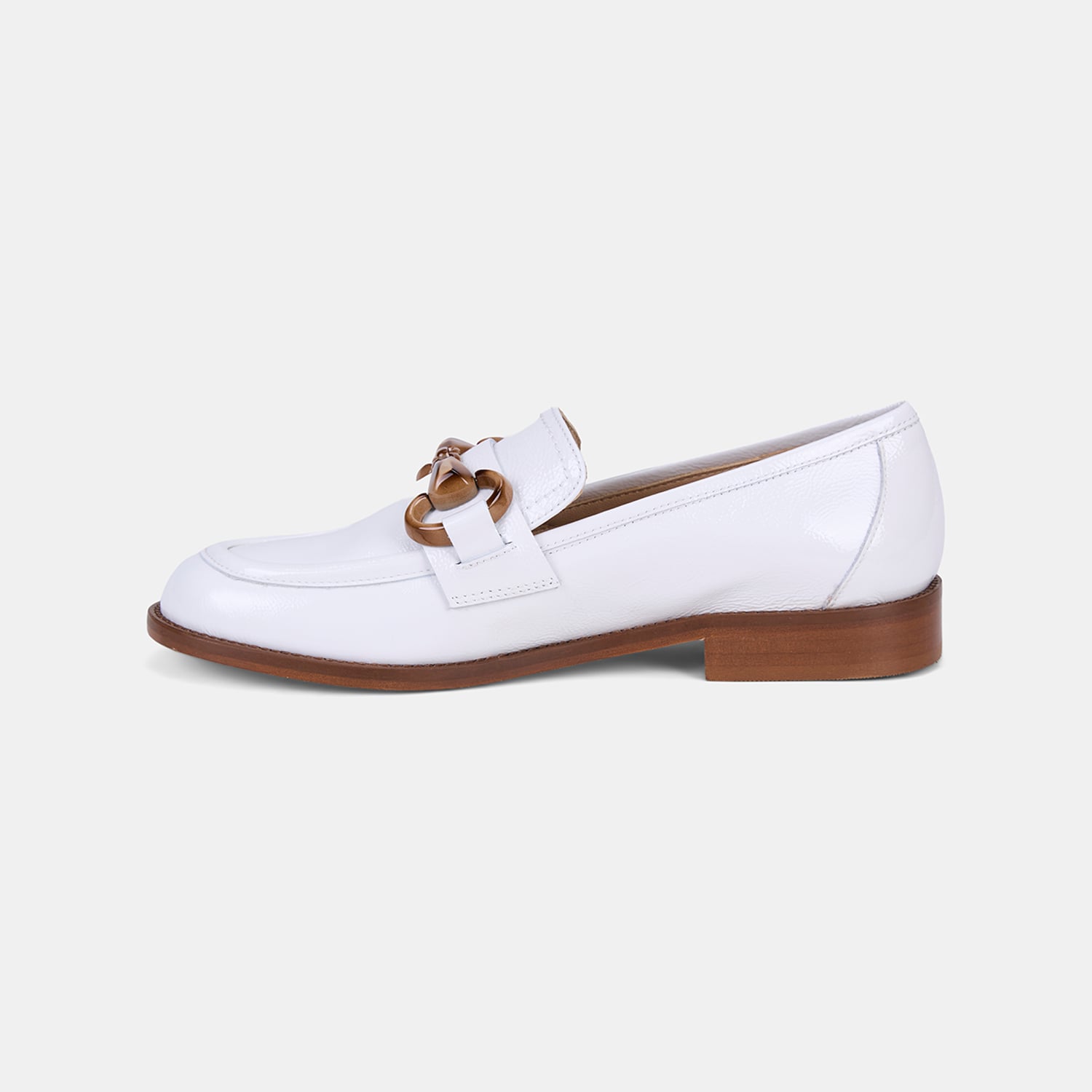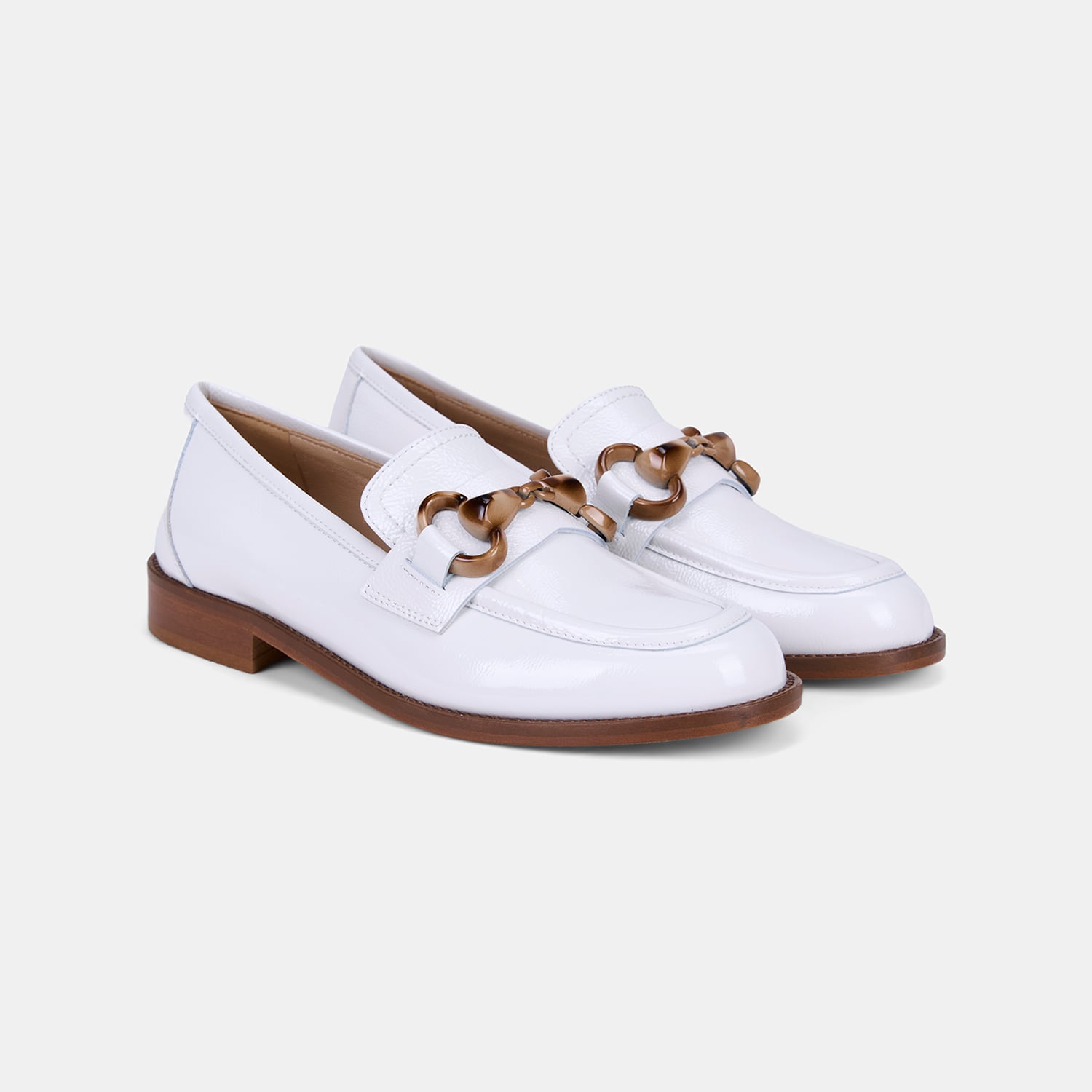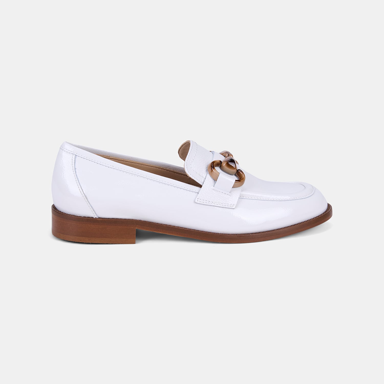 Kadın rugan deri loafer, parlak yüzeyi ve kemik zincir aksesuar detayıyla klasik formu modern bir dokunuşla yeniden yorumlayan şık bir tasarımdır.