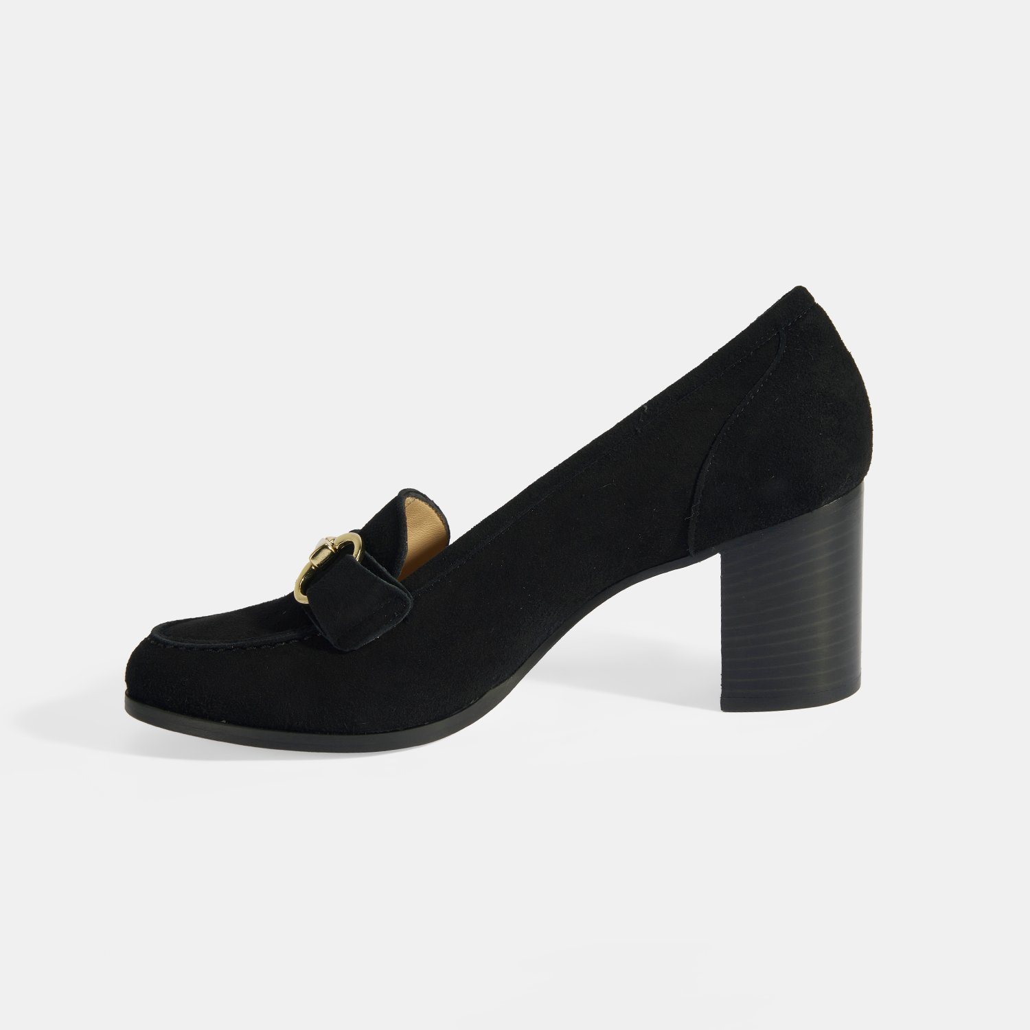 %100 süet deri, deri iç tabanlı, deri astarlı, metal toka aksesuar detaylı, kösele tabanlı, topuklu kadın loafer.