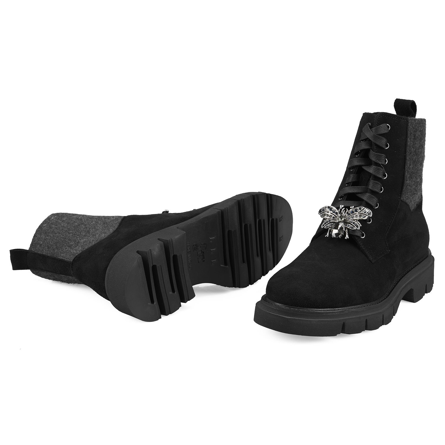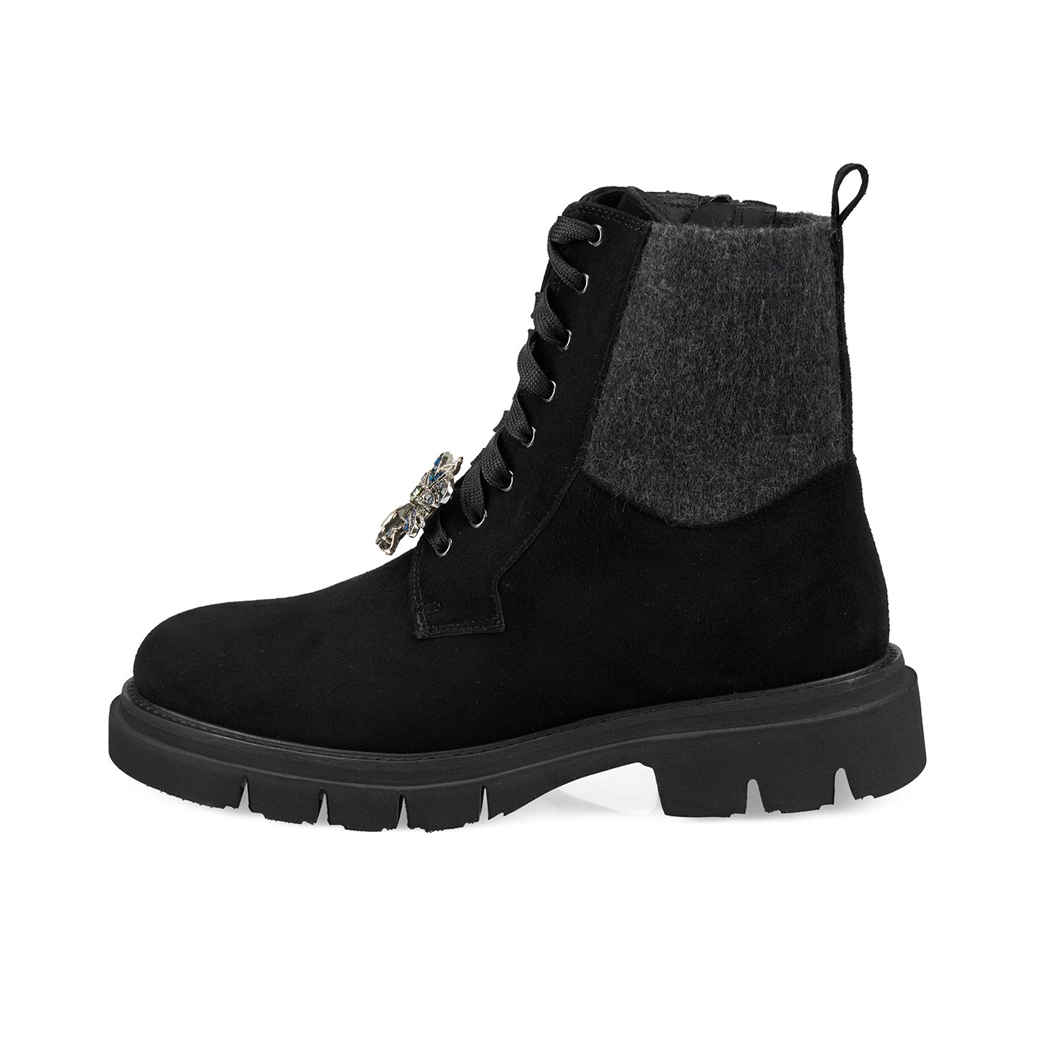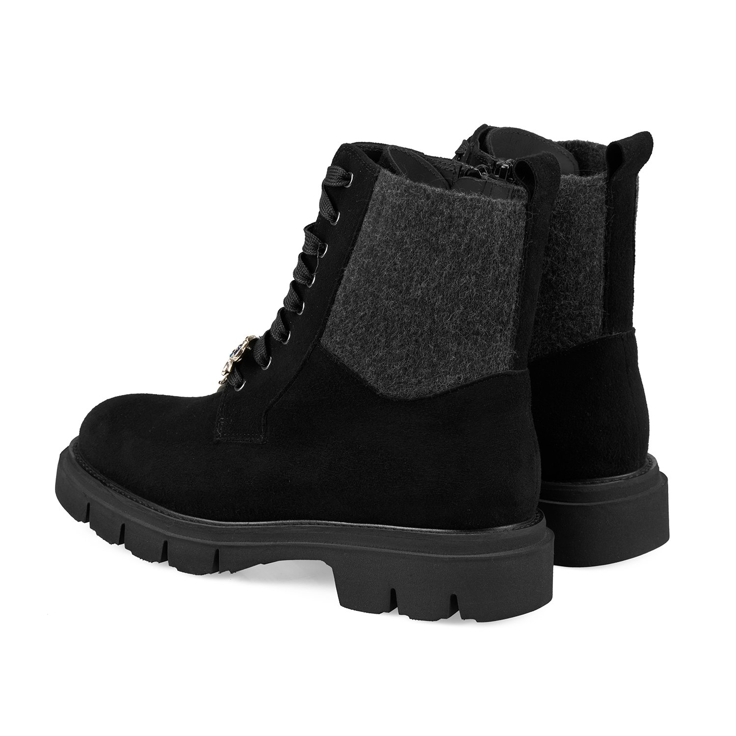 Siyah süet sayalı ve ton sür ton fermuarlı Edith bot. Gri yün, elastik ve siyah bağcıklarla süslenmiştir.