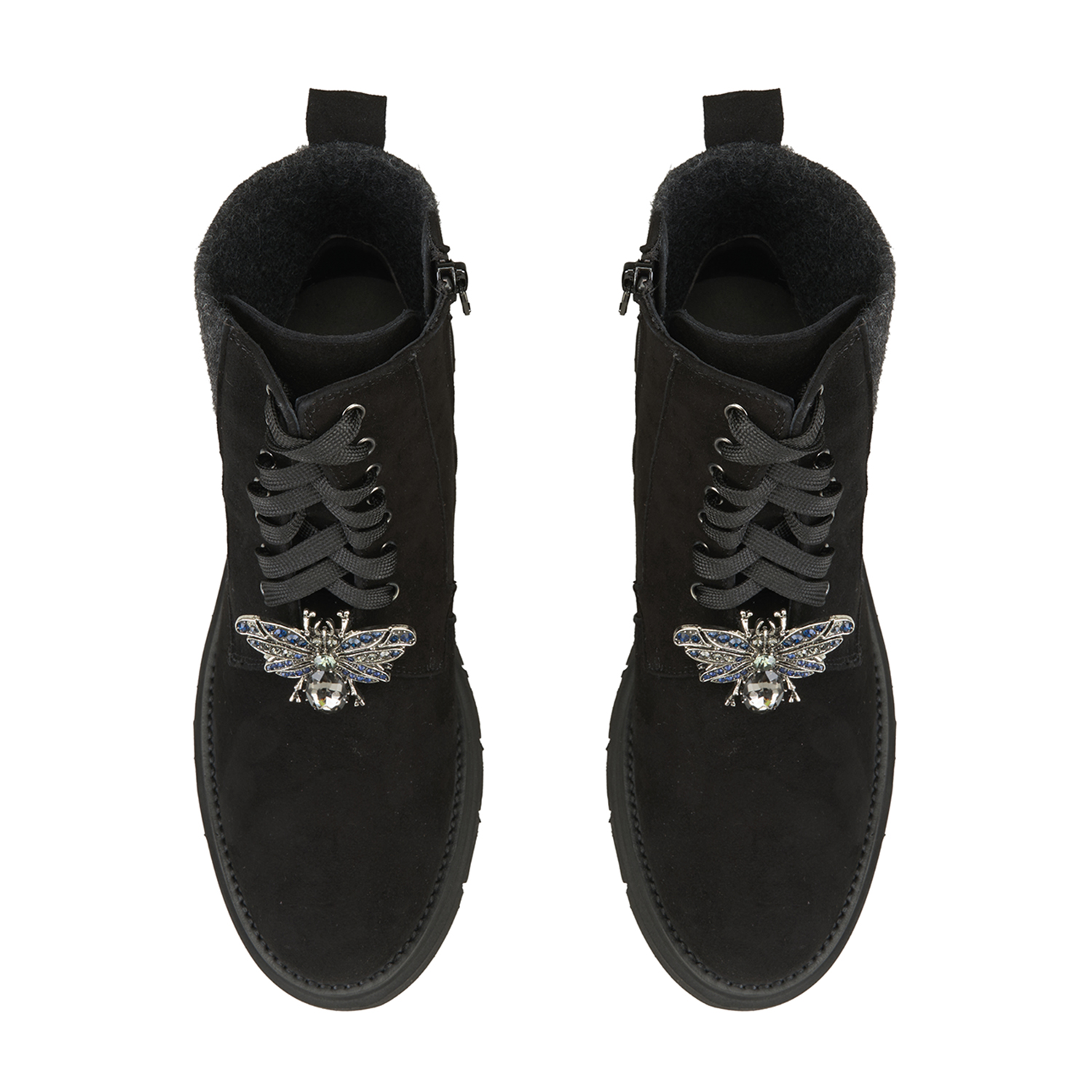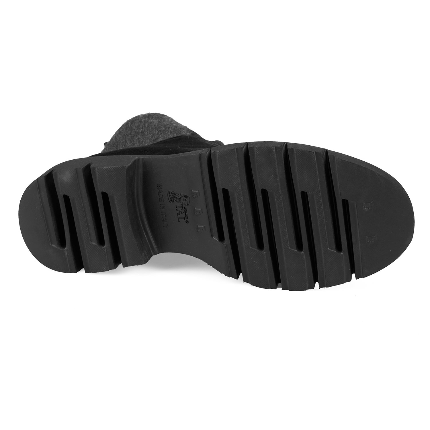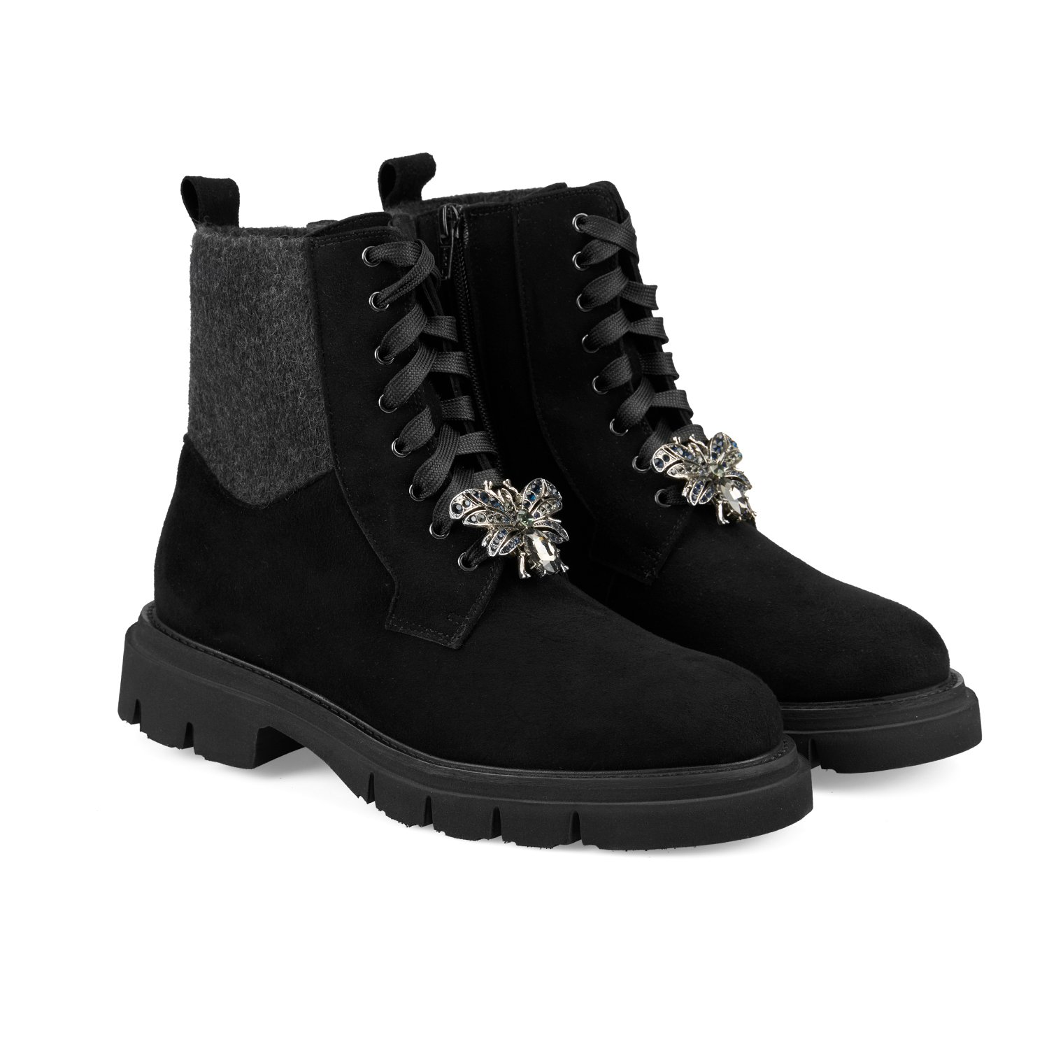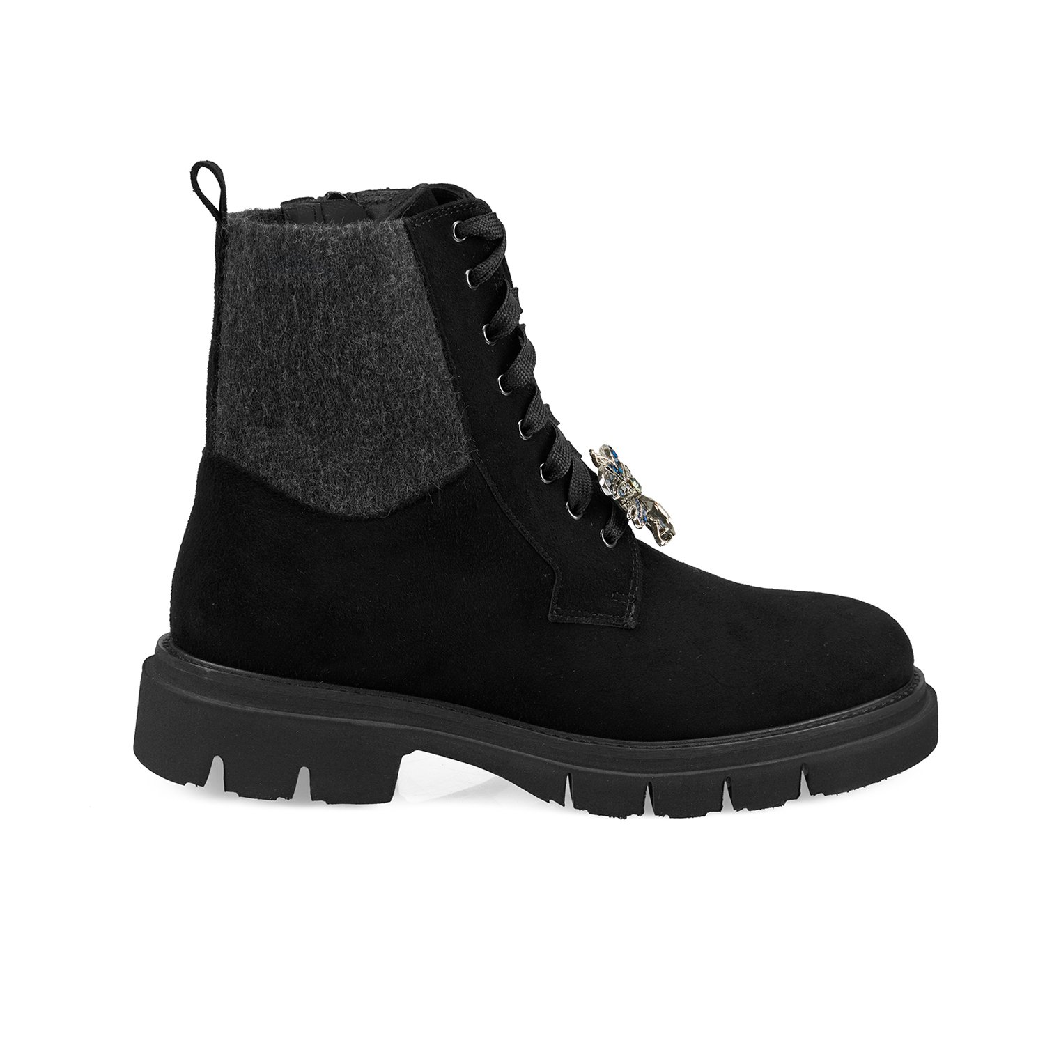 Siyah süet sayalı ve ton sür ton fermuarlı Edith bot. Gri yün, elastik ve siyah bağcıklarla süslenmiştir.