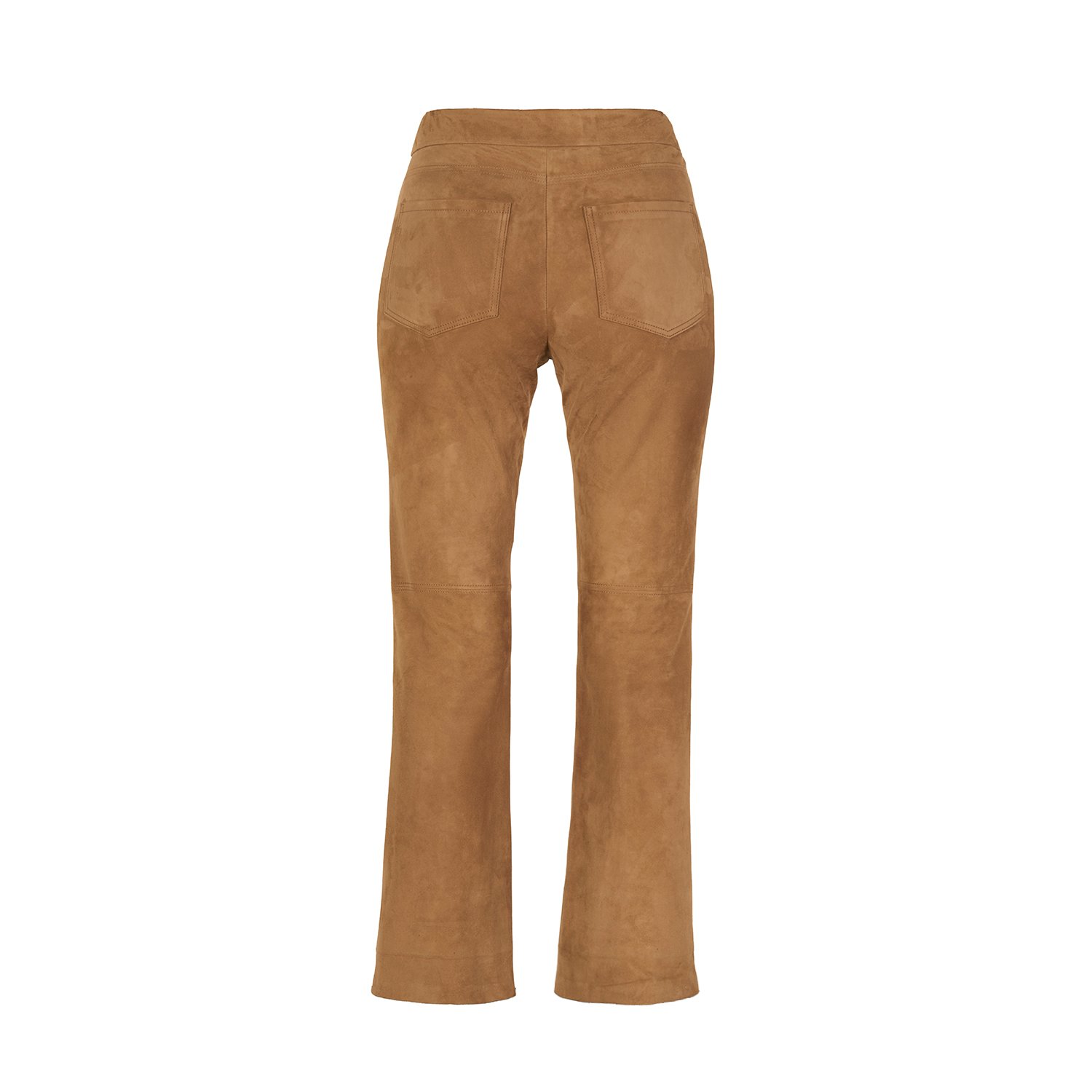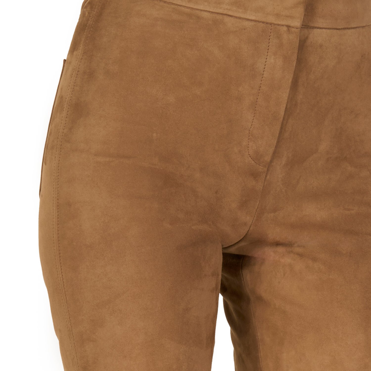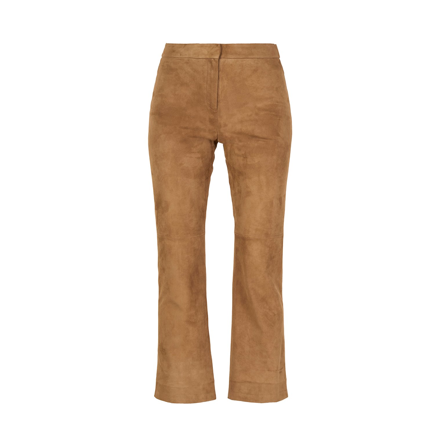 Kadın orta bel, crop süet pantolon, önden metal fermuar ve kanca kapamalıdır.