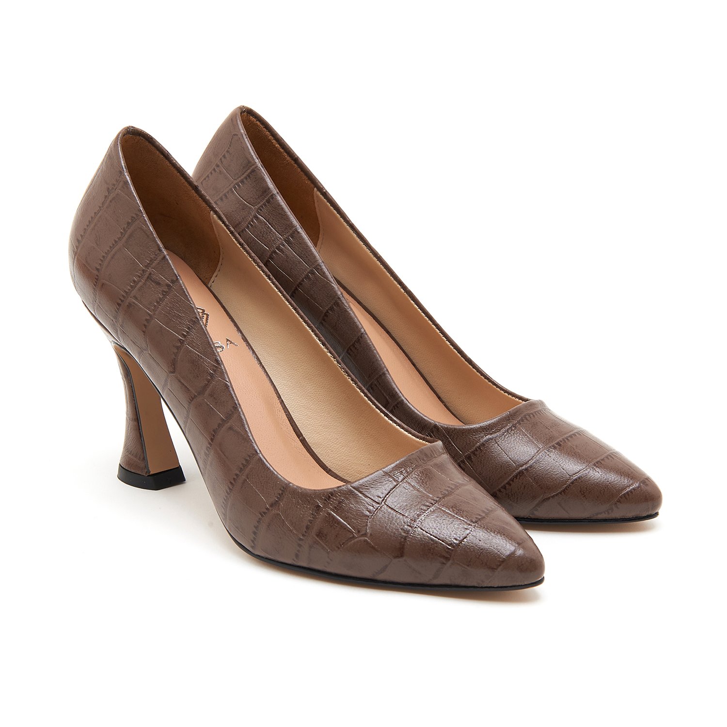 %100 Deri, kroko baskılı kadın topuklu ayakkabı.