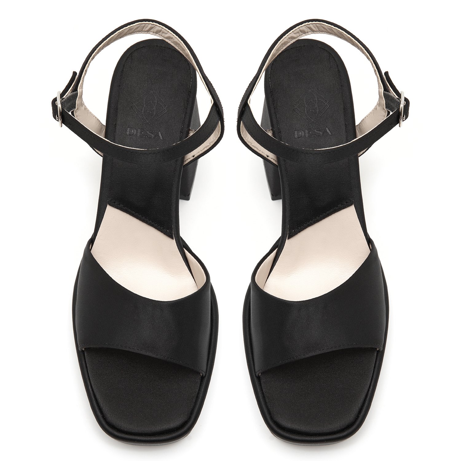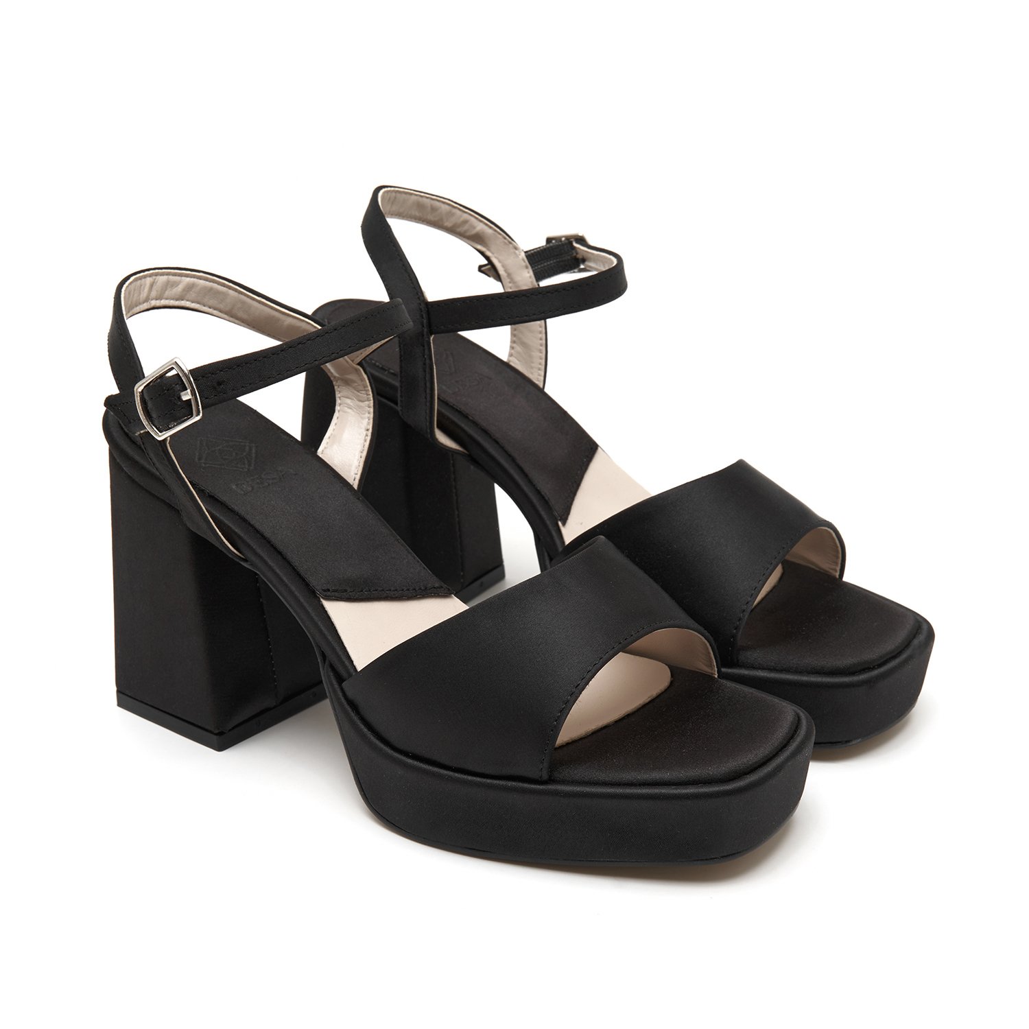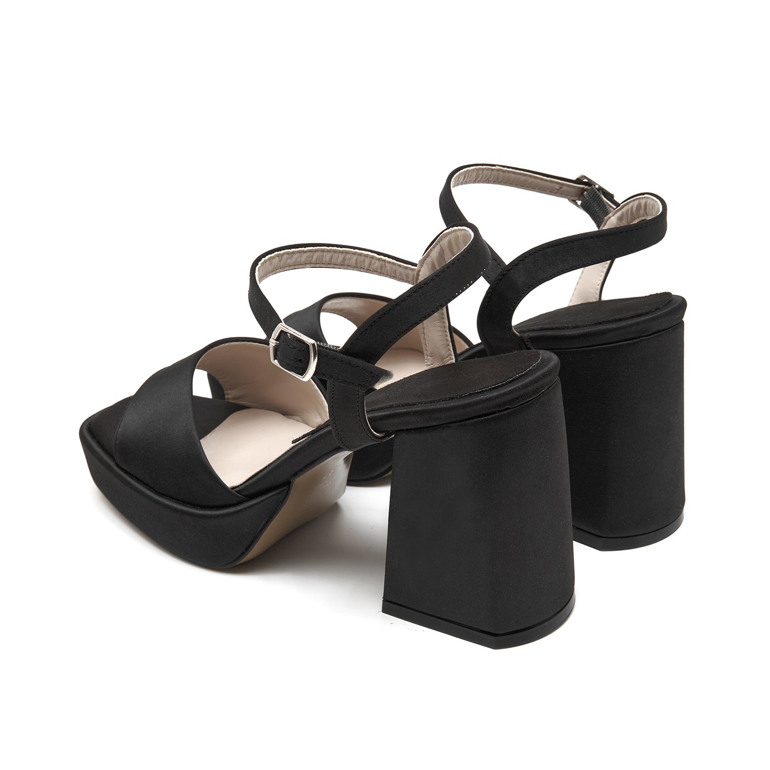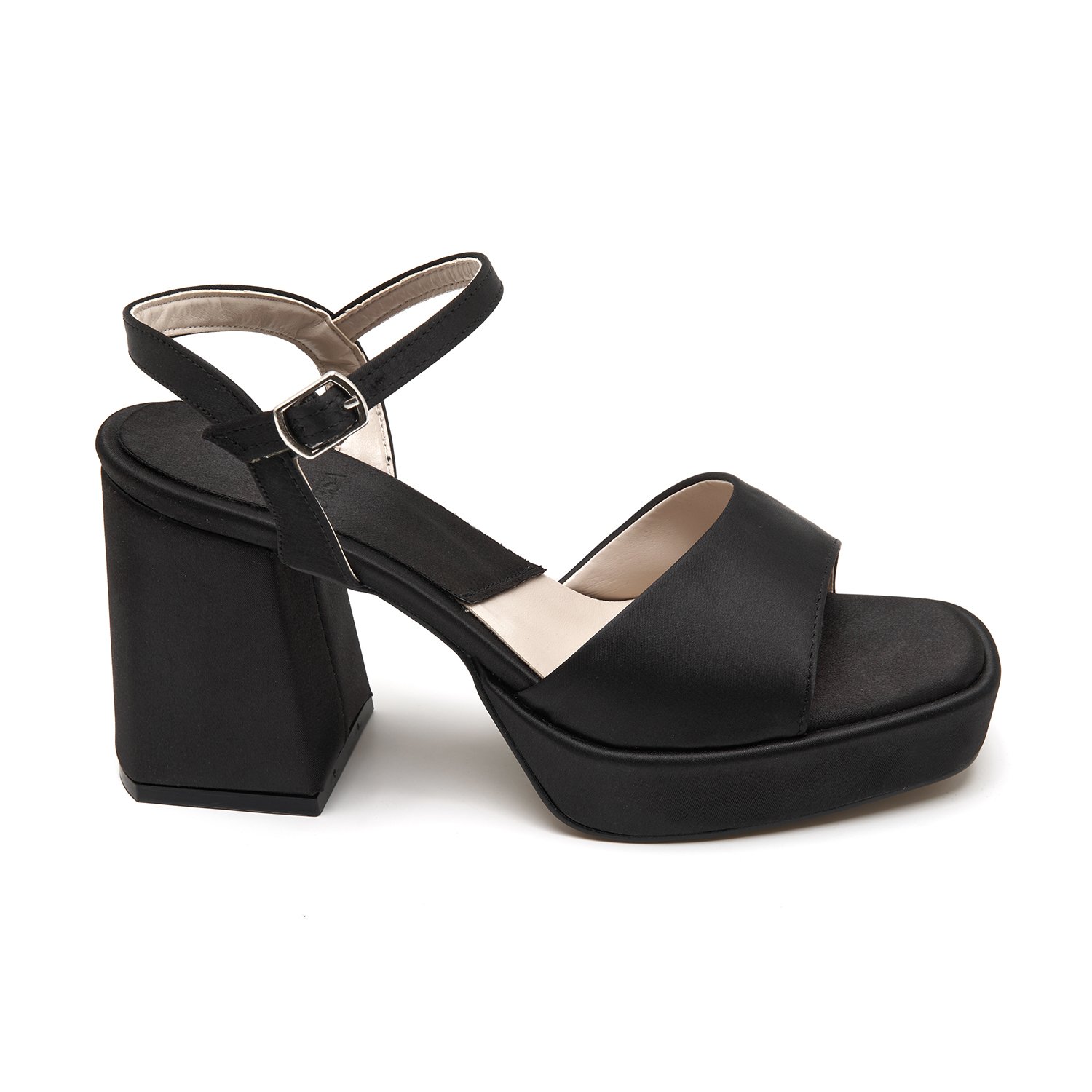 Tek bant detaylı, ayarlanabilir metal tokalı, platform tabanlı, saten topuklu sandalet.