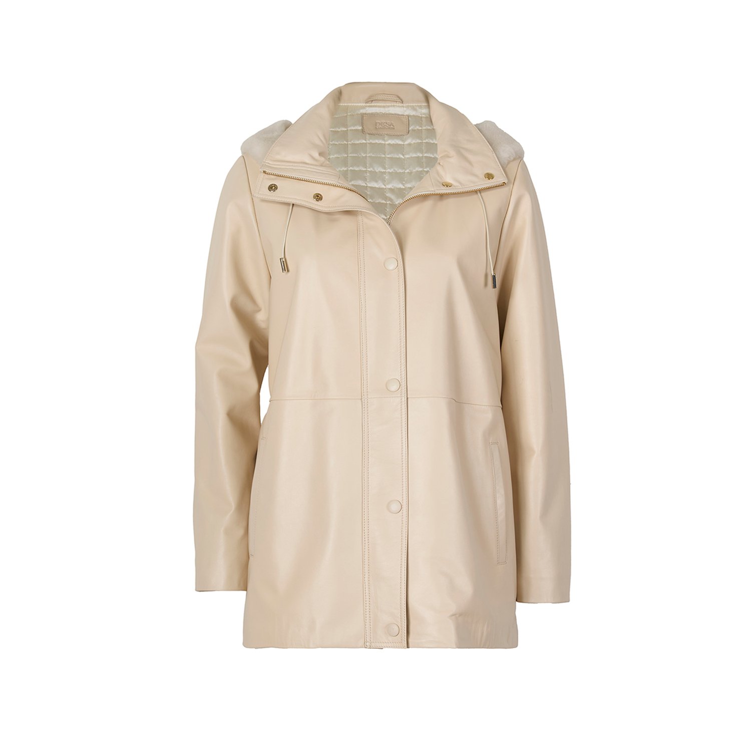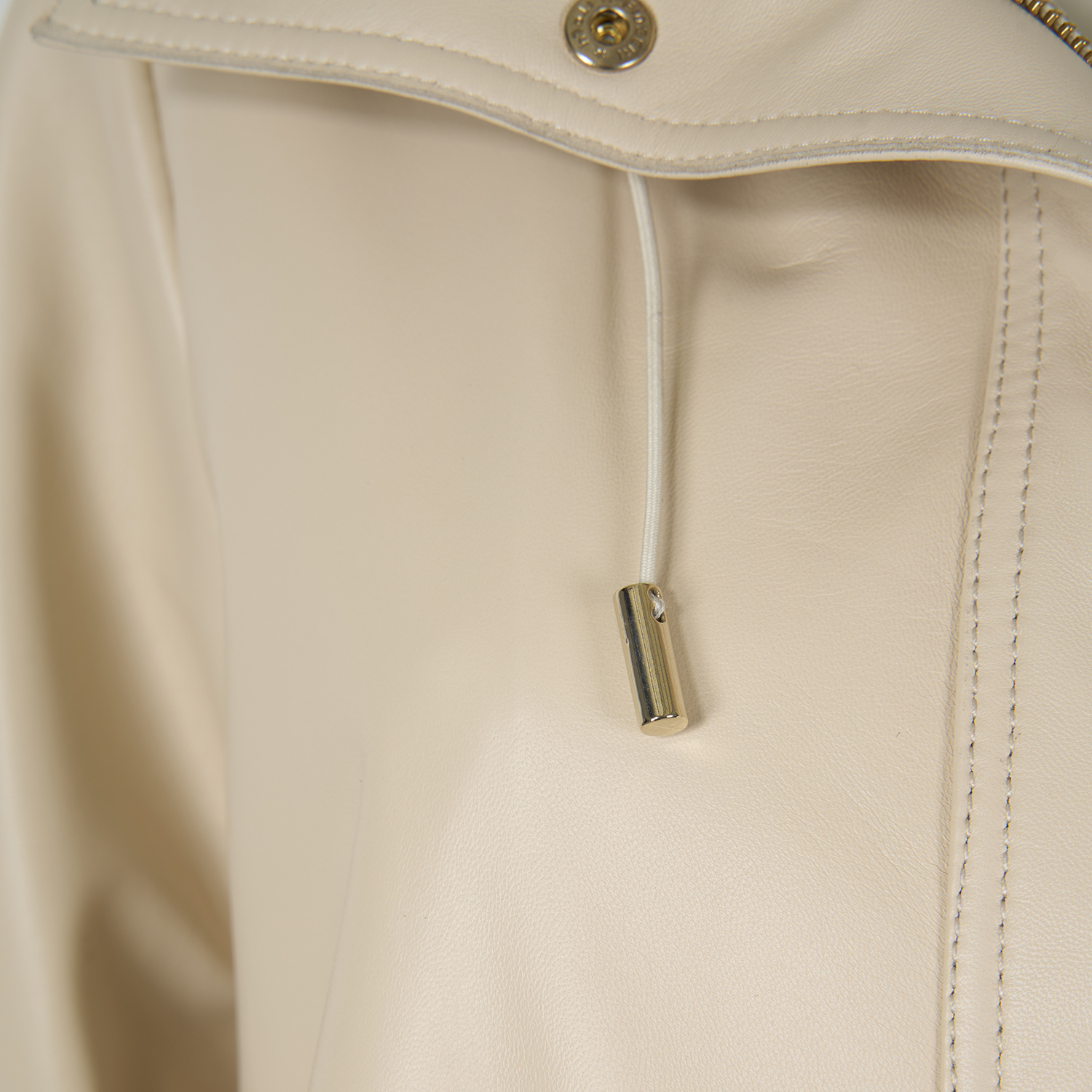 Kadın çıkma kapüşonlu yüksek hakim yakalı hafif dolgulu deri kaban.