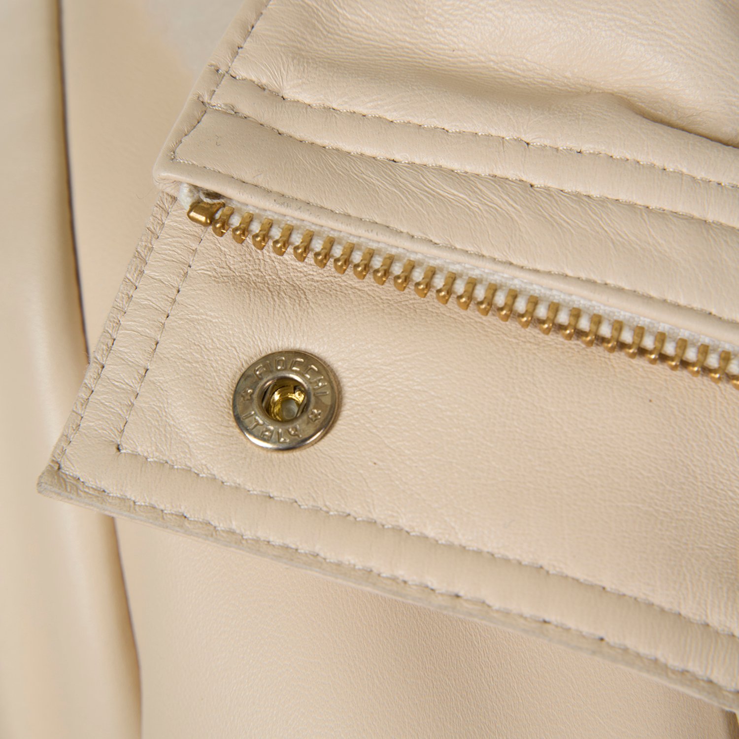 Önden metal fermuar ve kendi derisinden özel kaplamalı çıtçıt kapamalıdır.