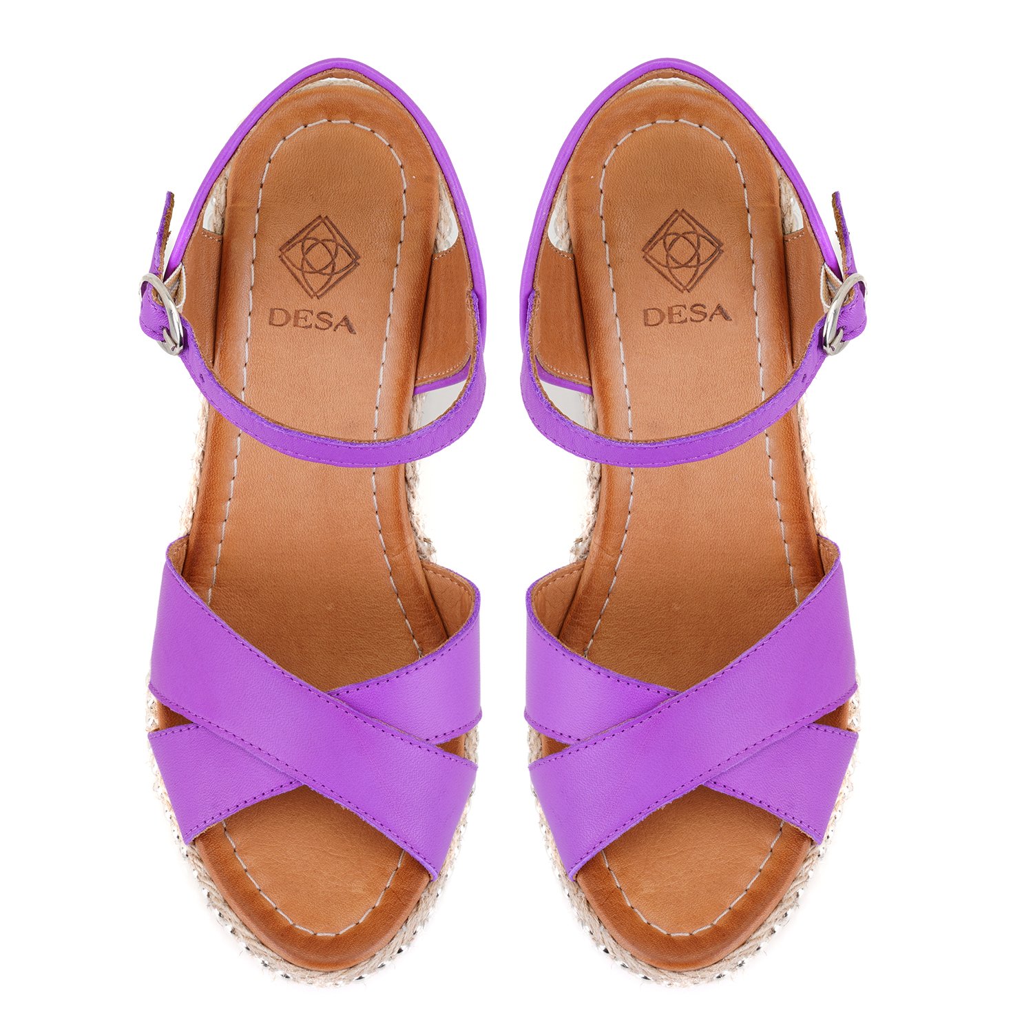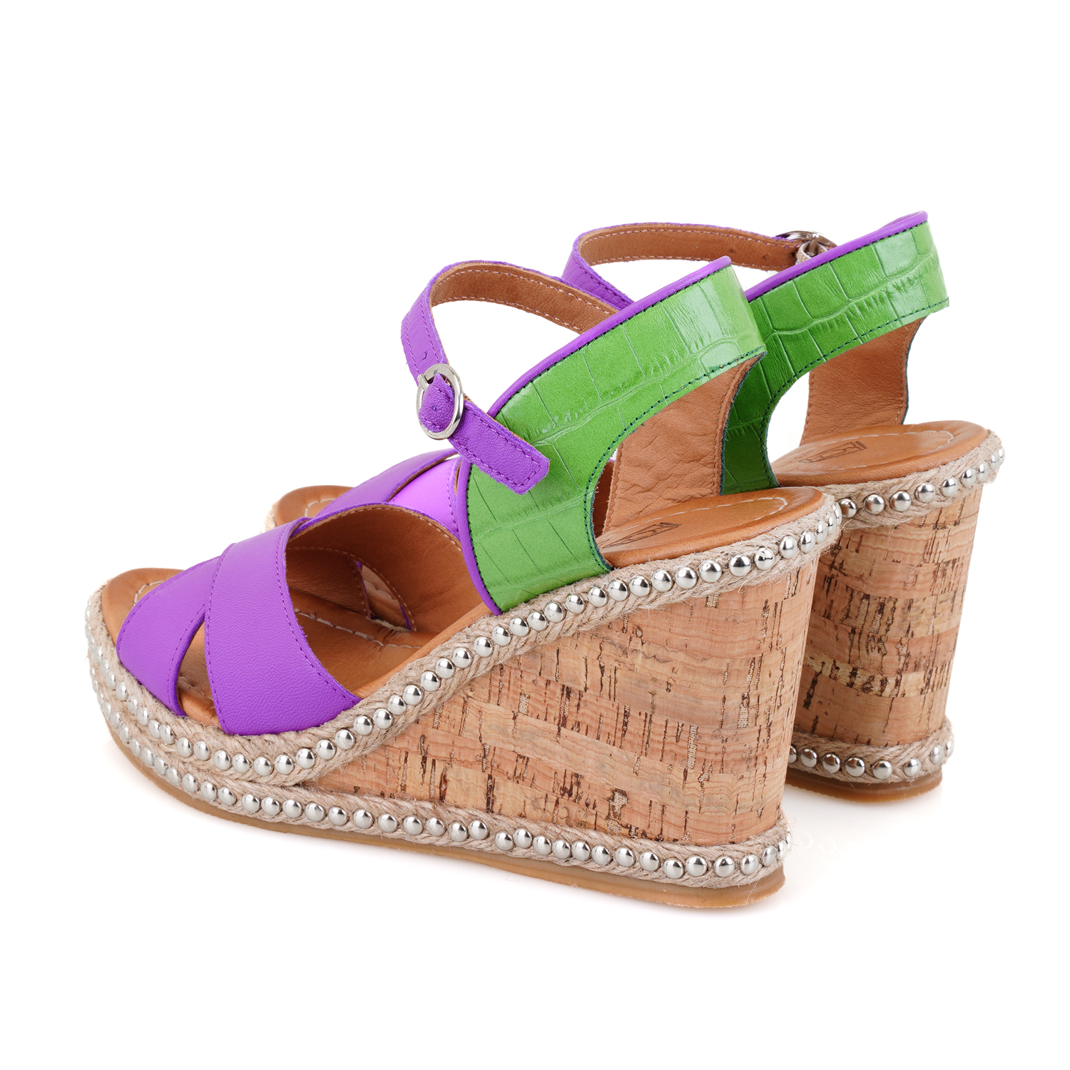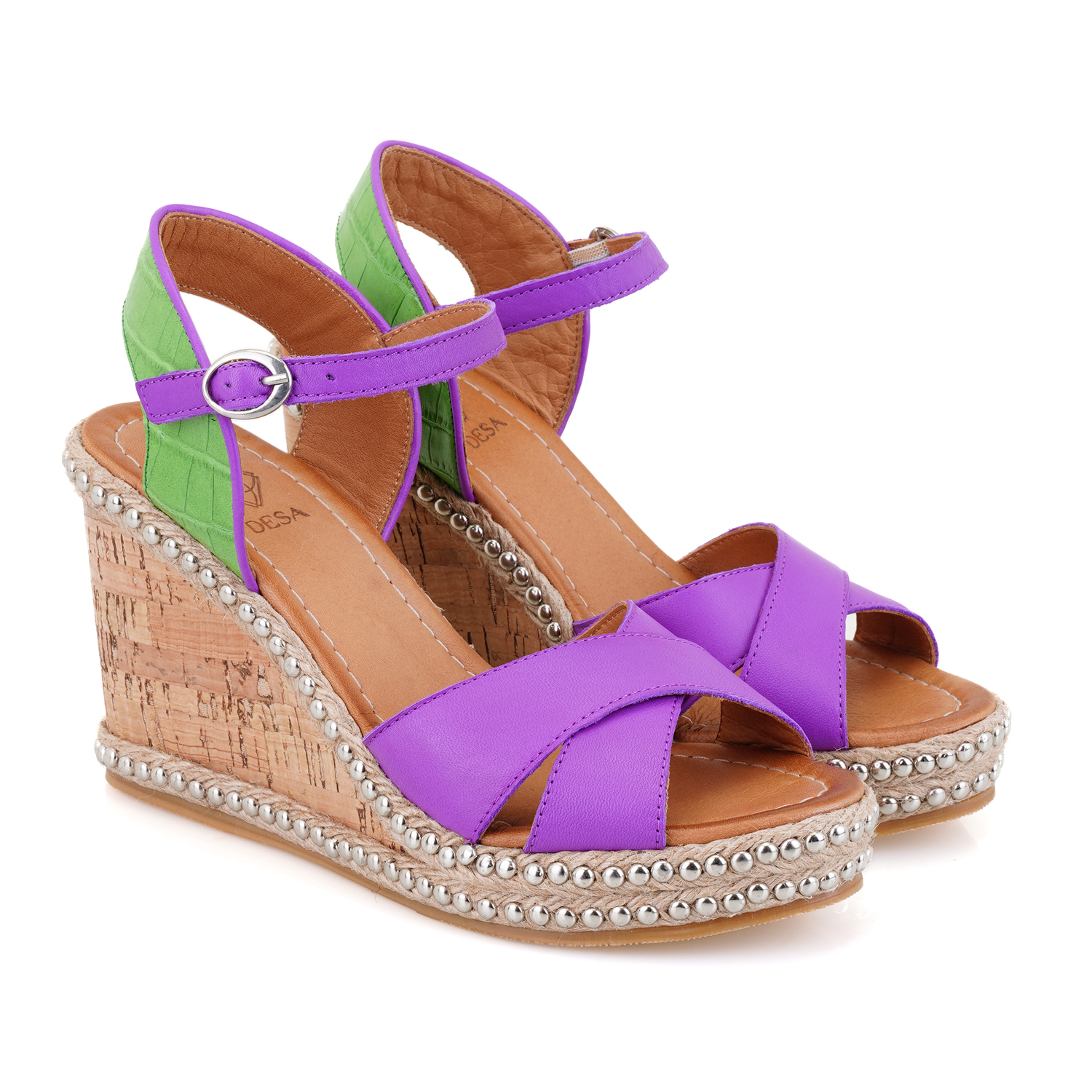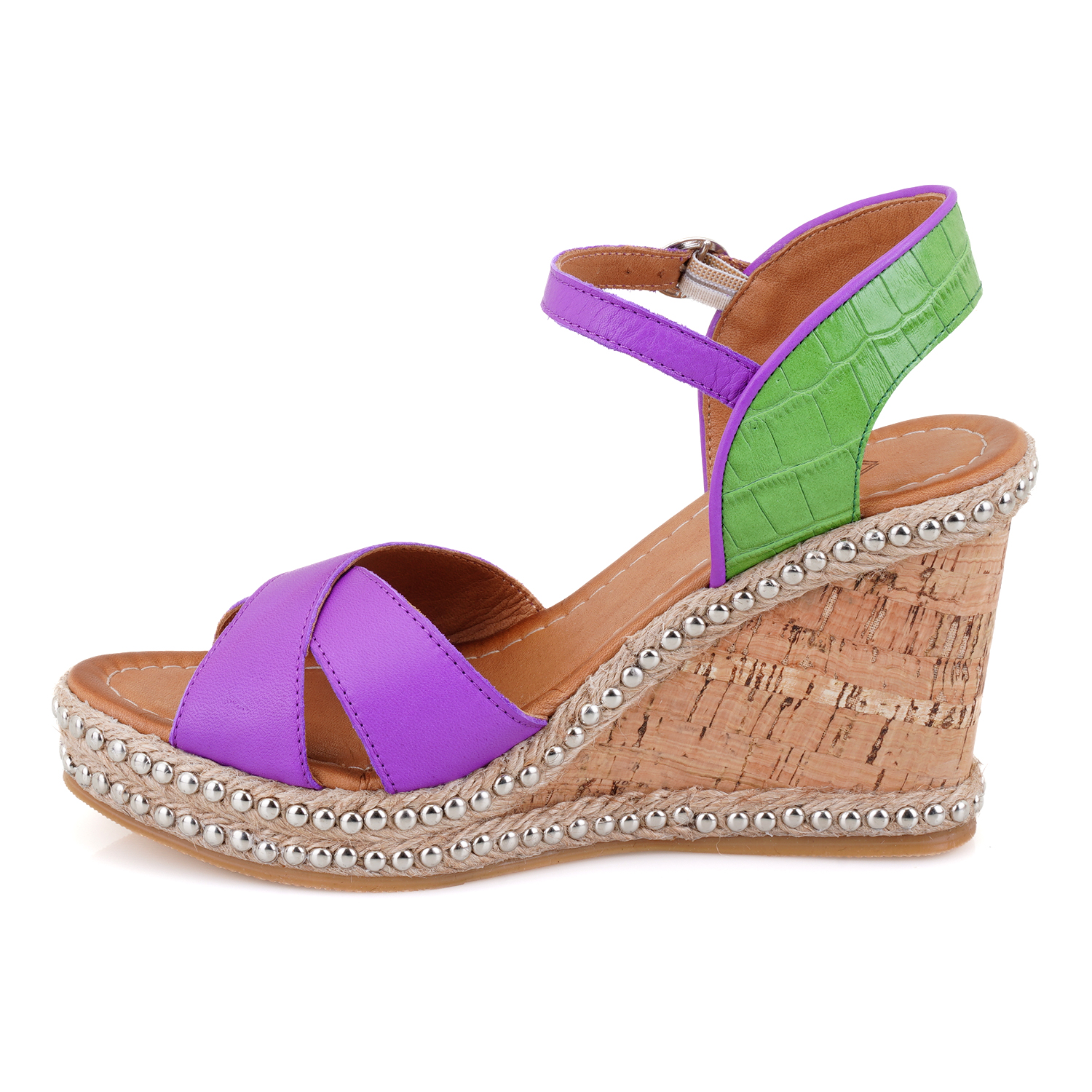 %100 deri, deri iç astarlı, deri iç tabanlı, ayarlanabilir matal tokalı, mantar ve hasır kaplamalı metal pim detaylı pu tabanlı, dolgu topuklu kadın sandalet.
