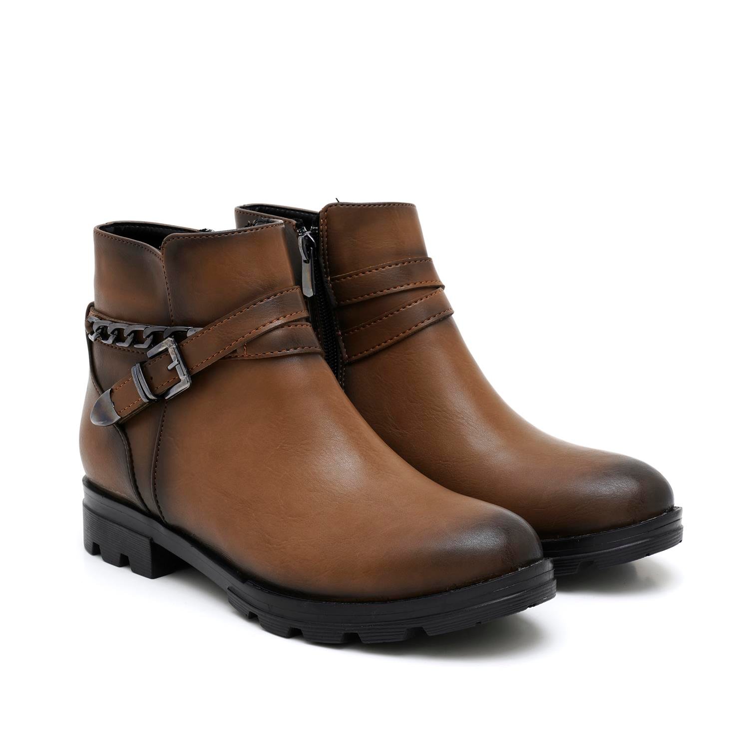 Tekstil iç tabanlı, tekstil astarlı, ayarlanabilir metal toka detaylı, kauçuk tabanlı, içten fermuarlı kadın bot.