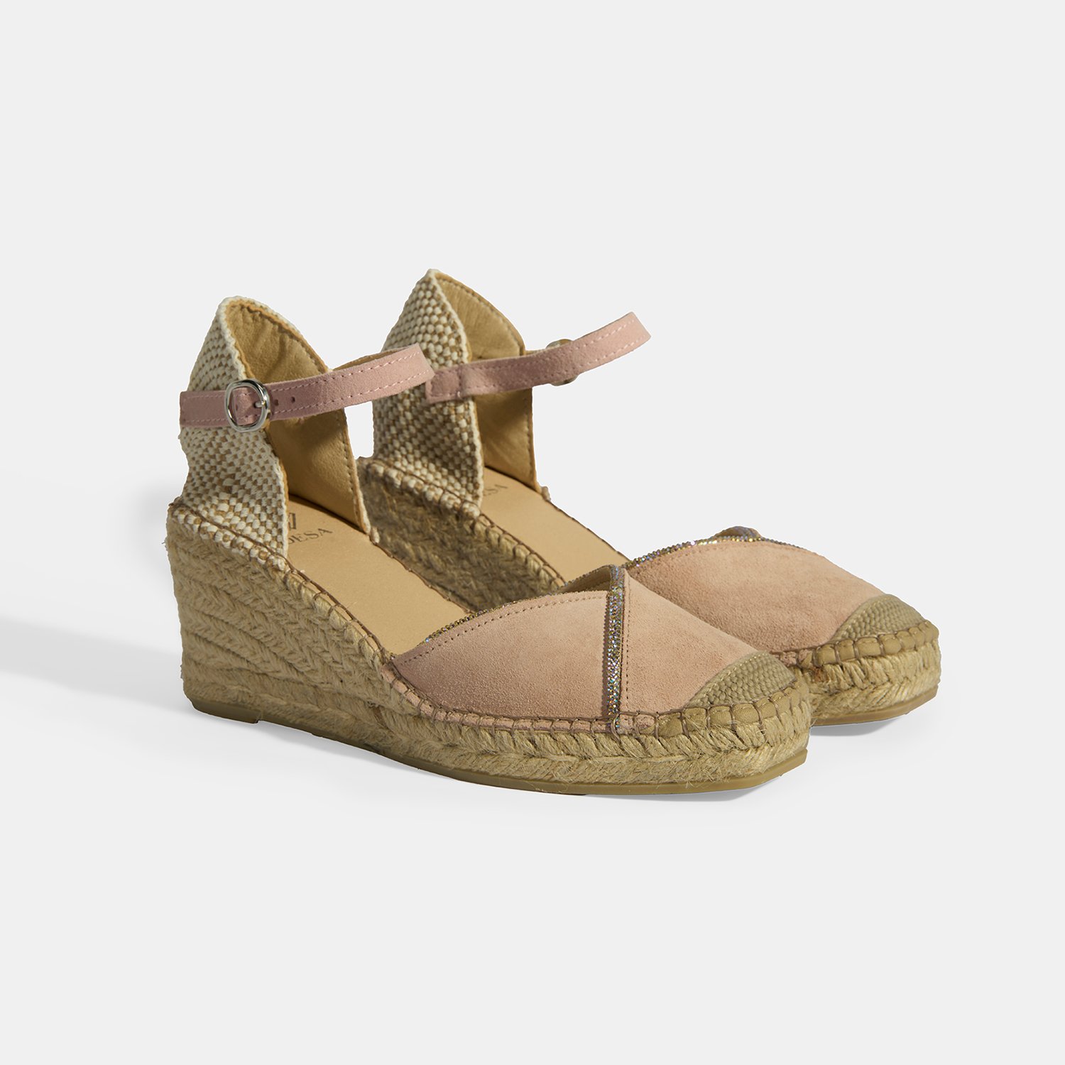 %100 süet deri, deri iç tabanlı, deri astarlı, parlak taşlı şerit detaylı, ayarlanabilir metal tokalı, jüt sargılı tpu tabanlı, kadın dolgu topuklu espadril.
