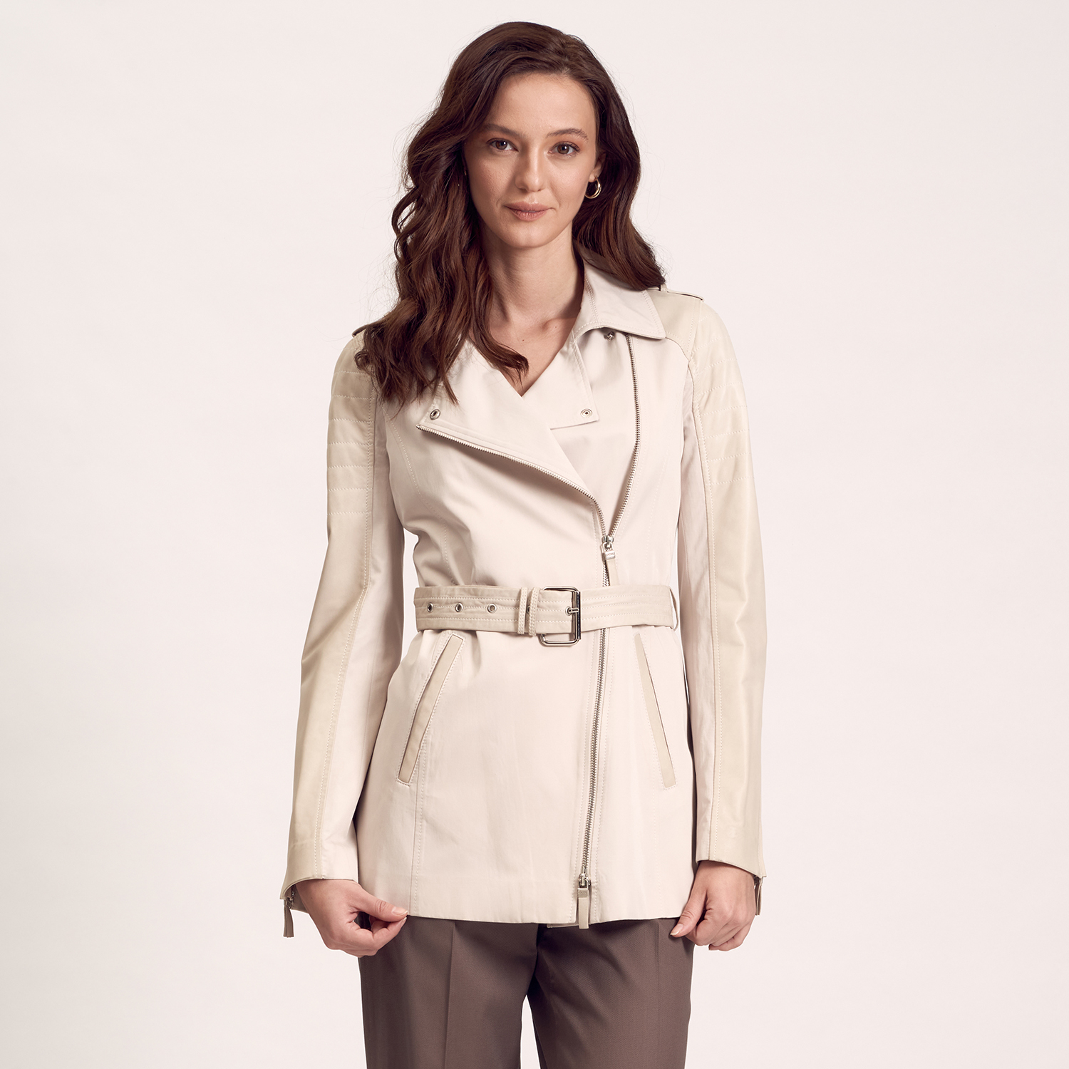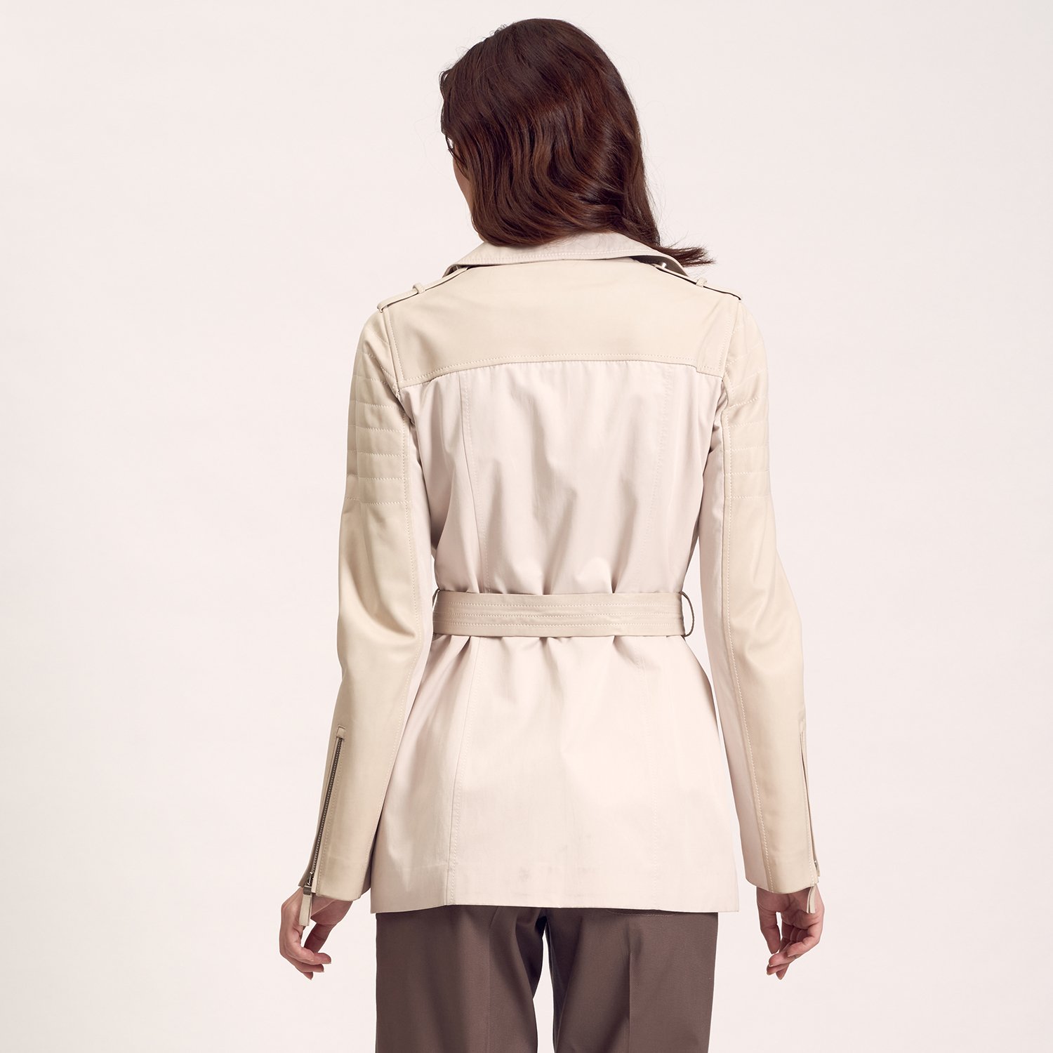 Kemerli, koton karışımlı kısa kadın trençkot.