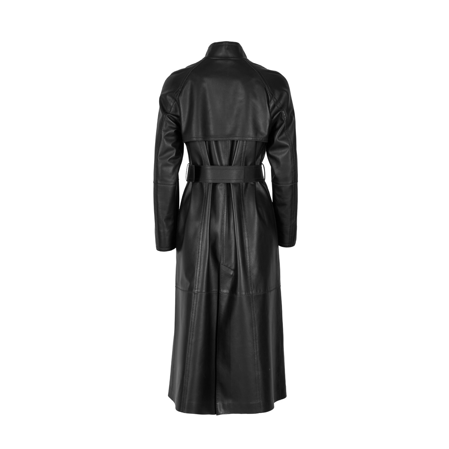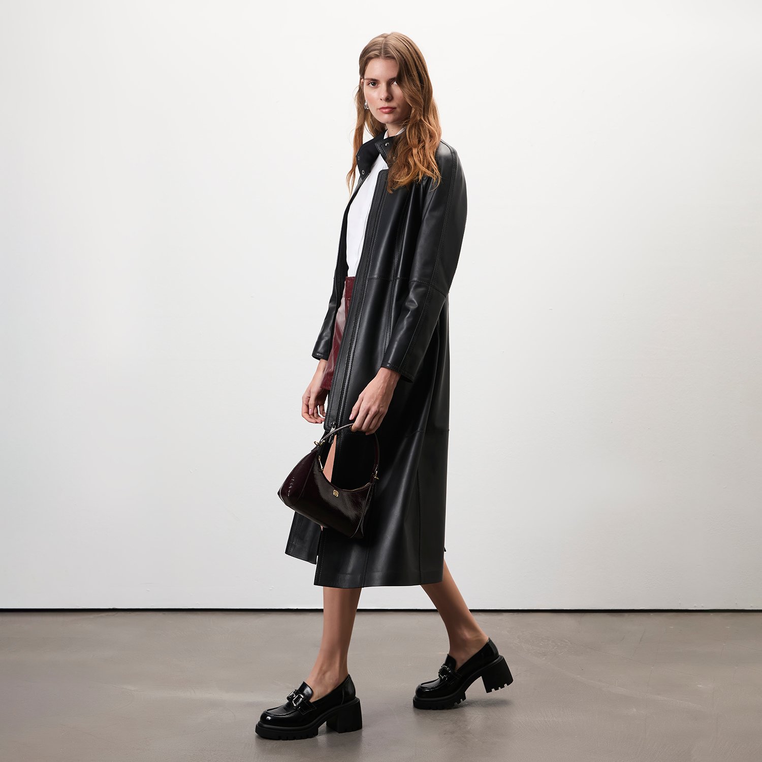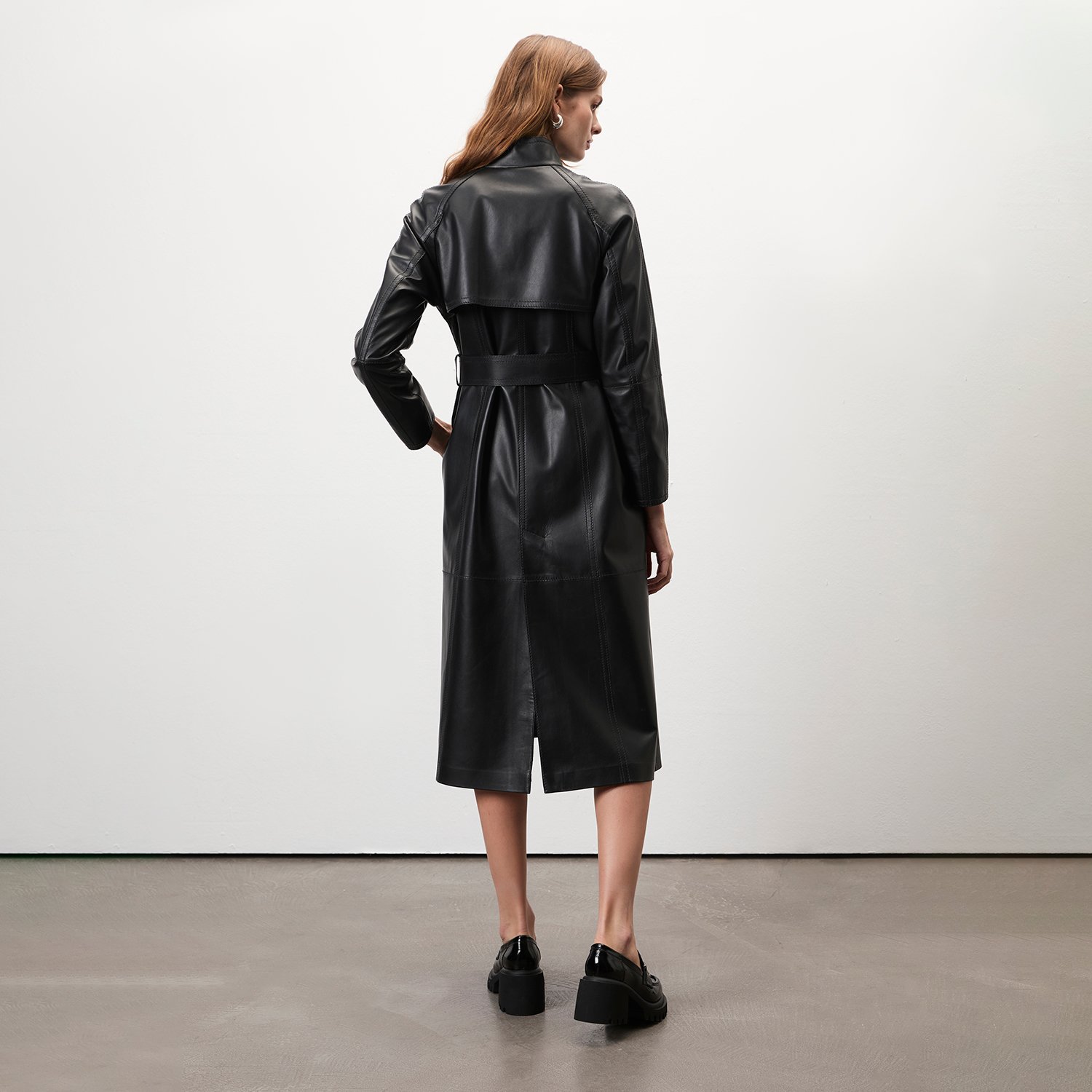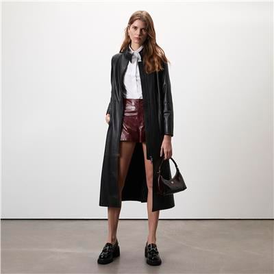 Kadın hakim yakalı, uzun deri trençkot.