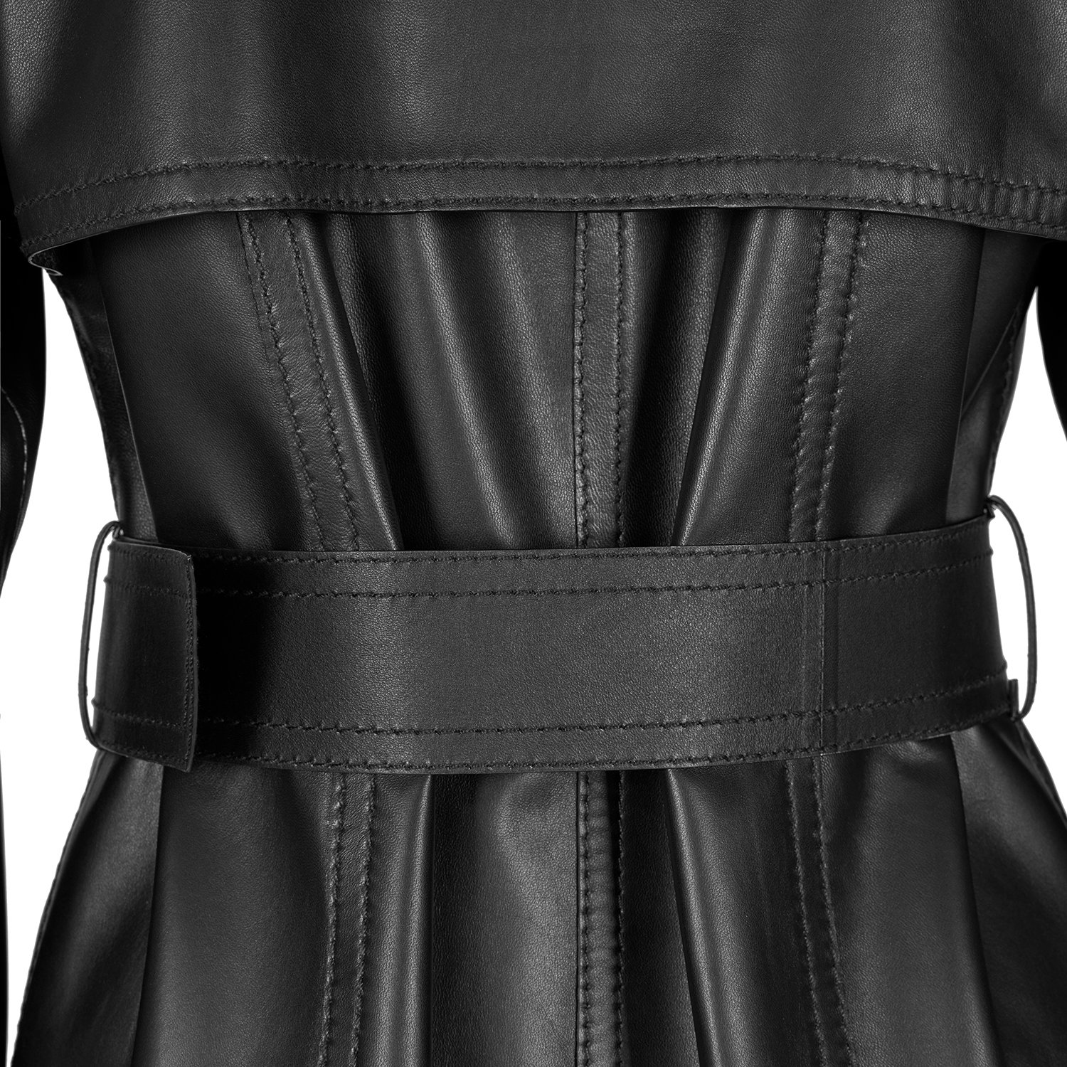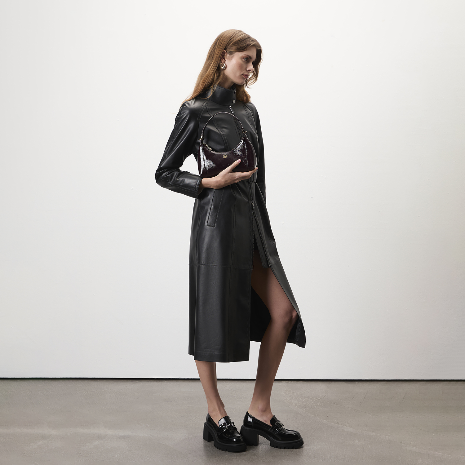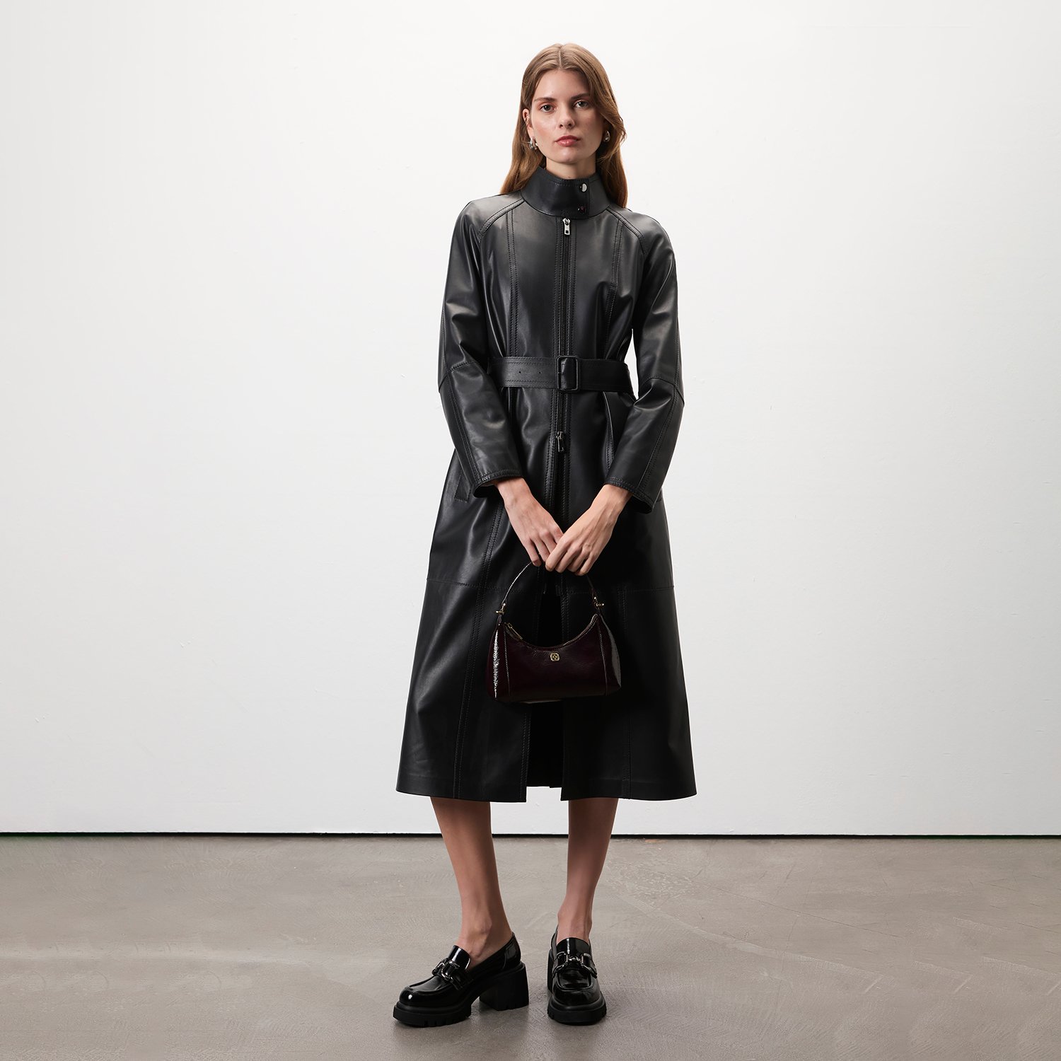 Kadın hakim yakalı, uzun deri trençkot.
