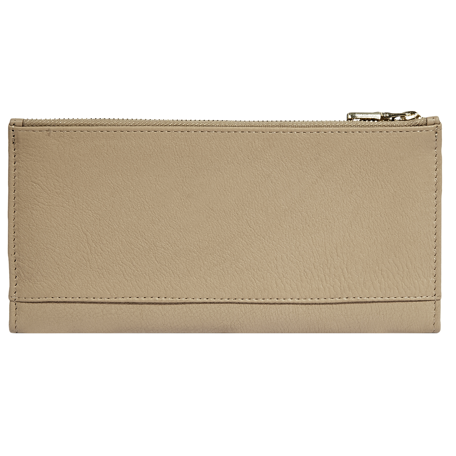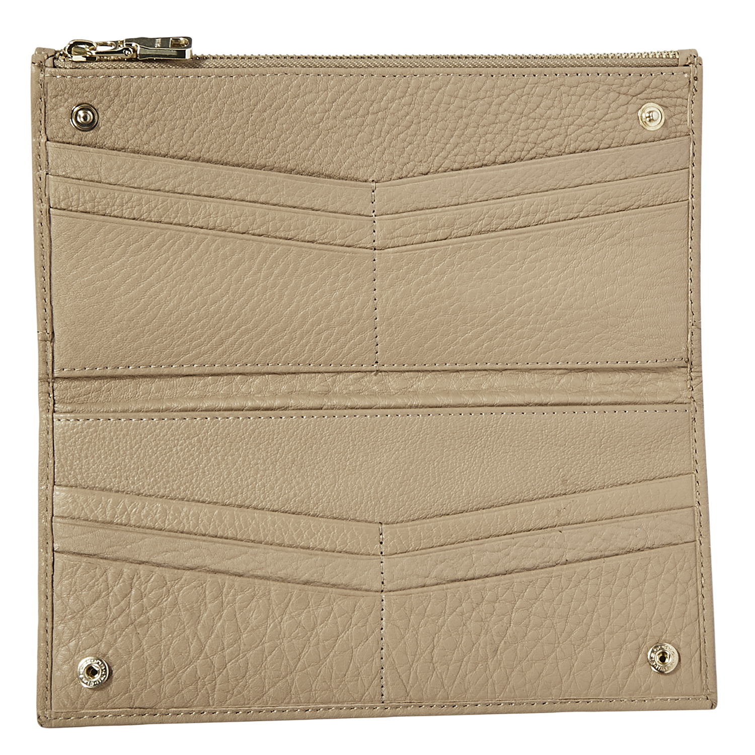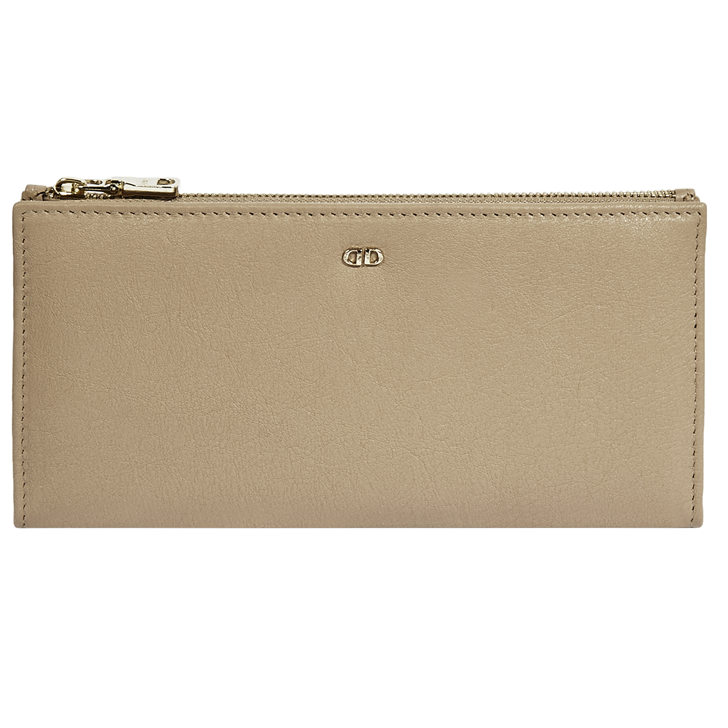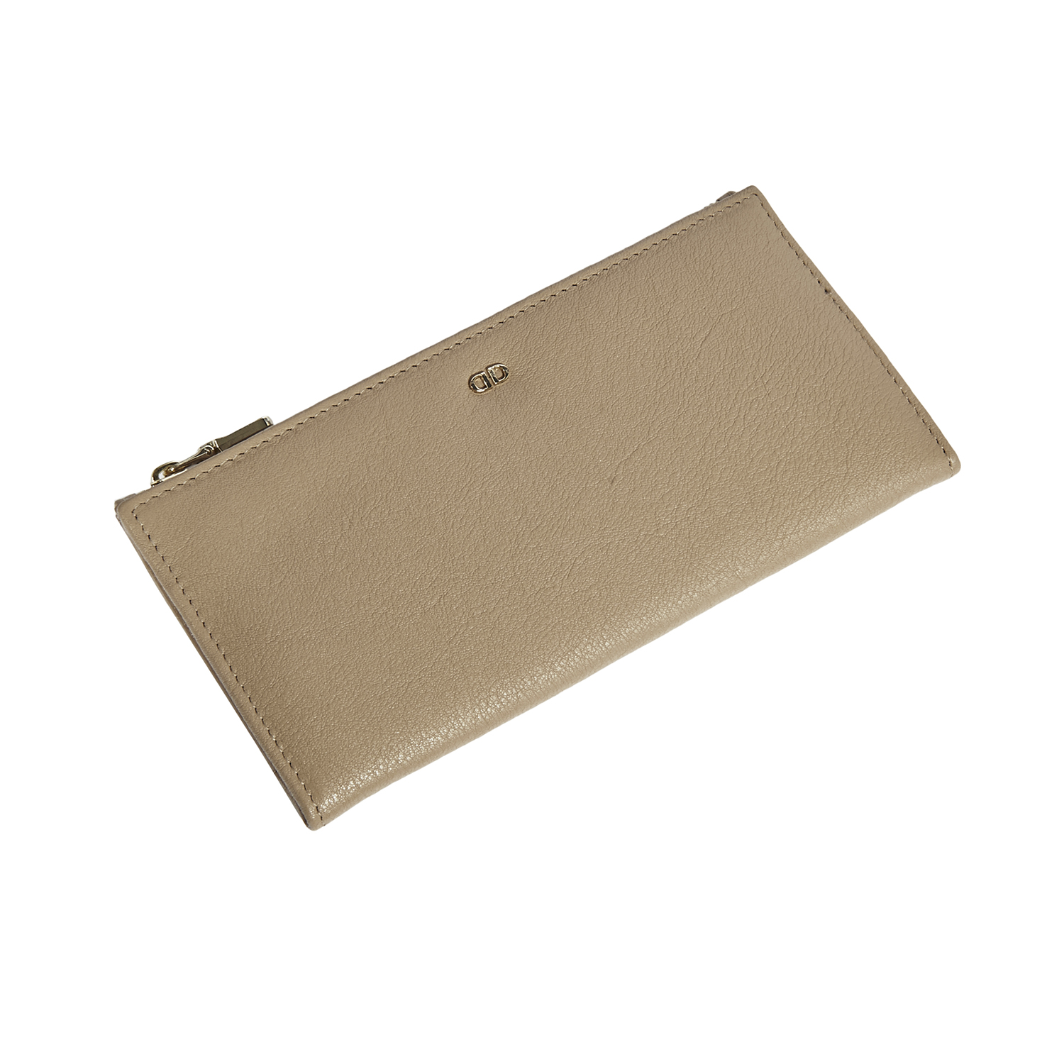 Modern çizgilerle tasarlanmış, 12 adet kart bölmesi ve biri fermuarlı 2 adet bölmesi bulunan deri kadın cüzdan.