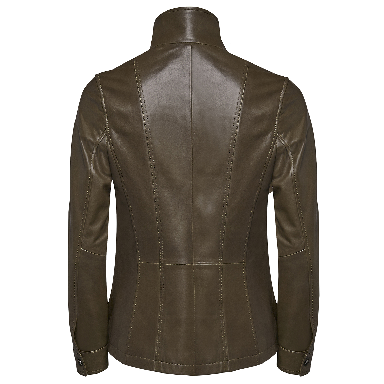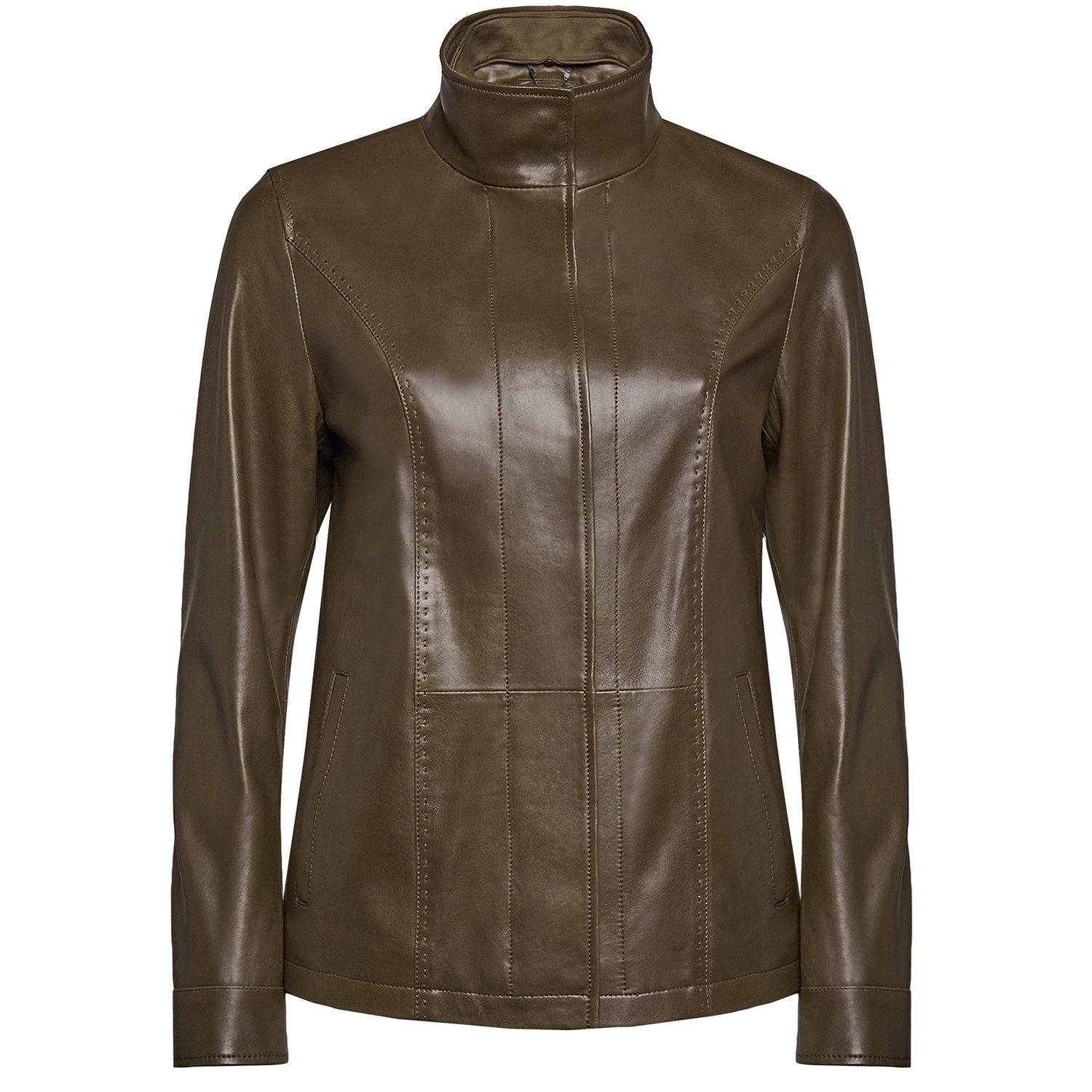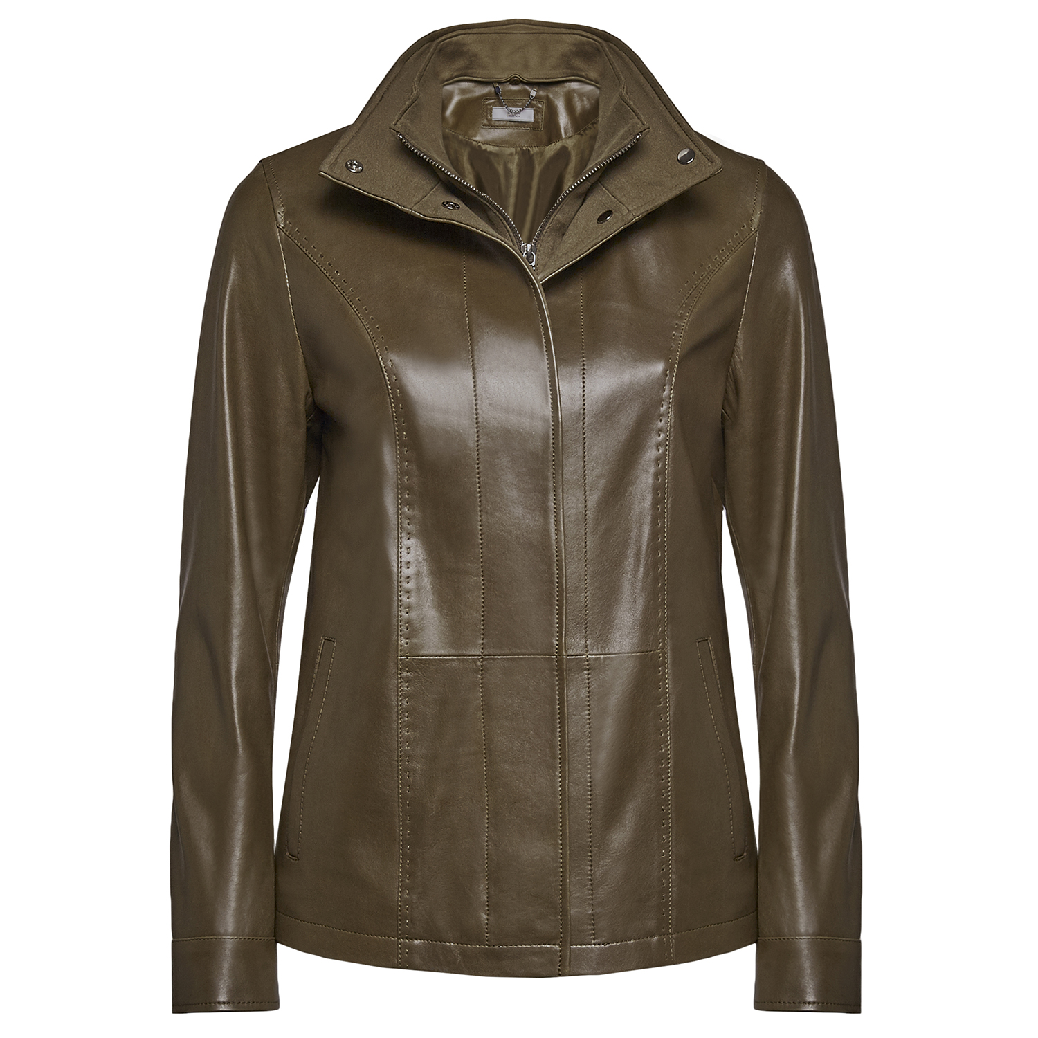Hakim yakalı, önden metal fermuar ve çıtçıt kapama detaylıdır.