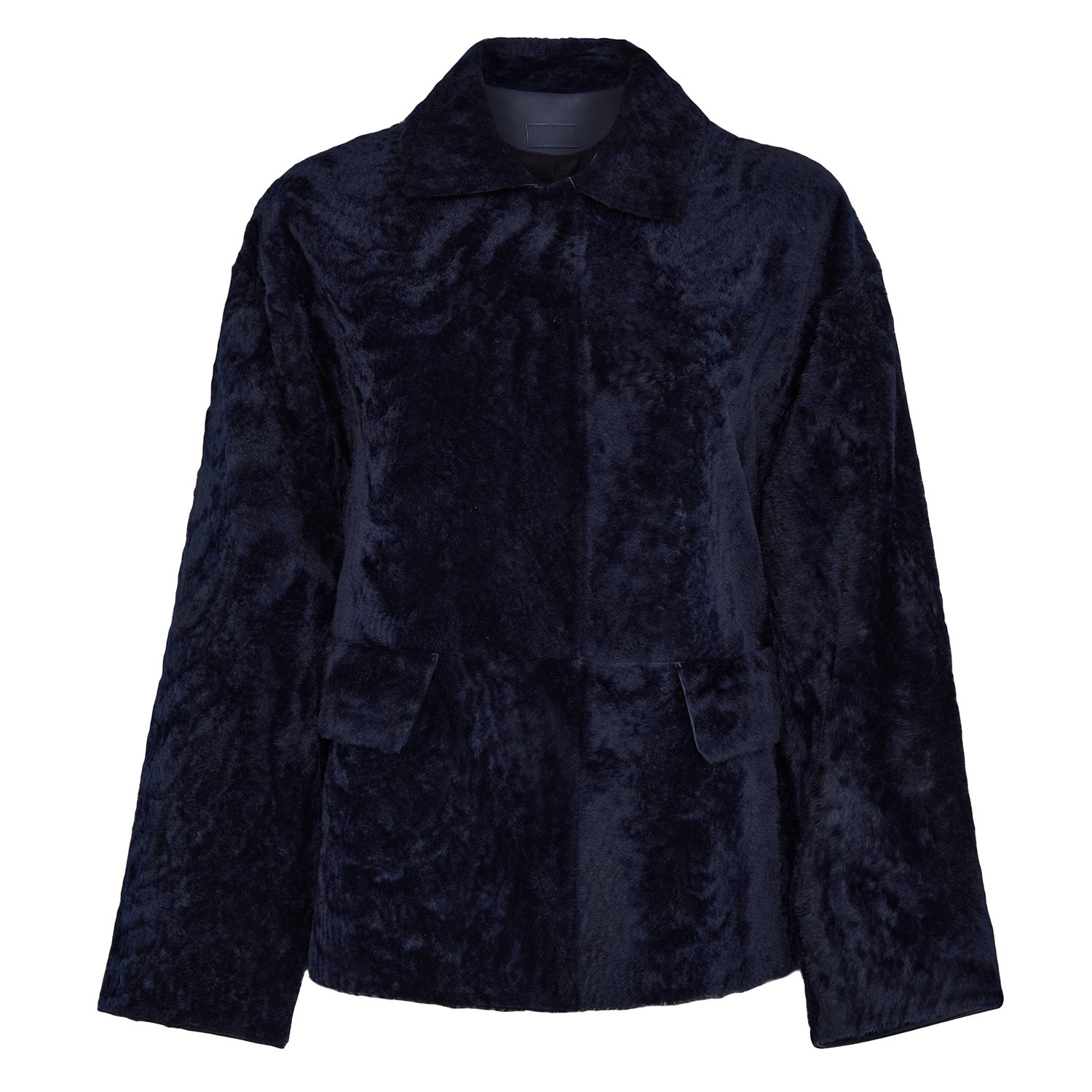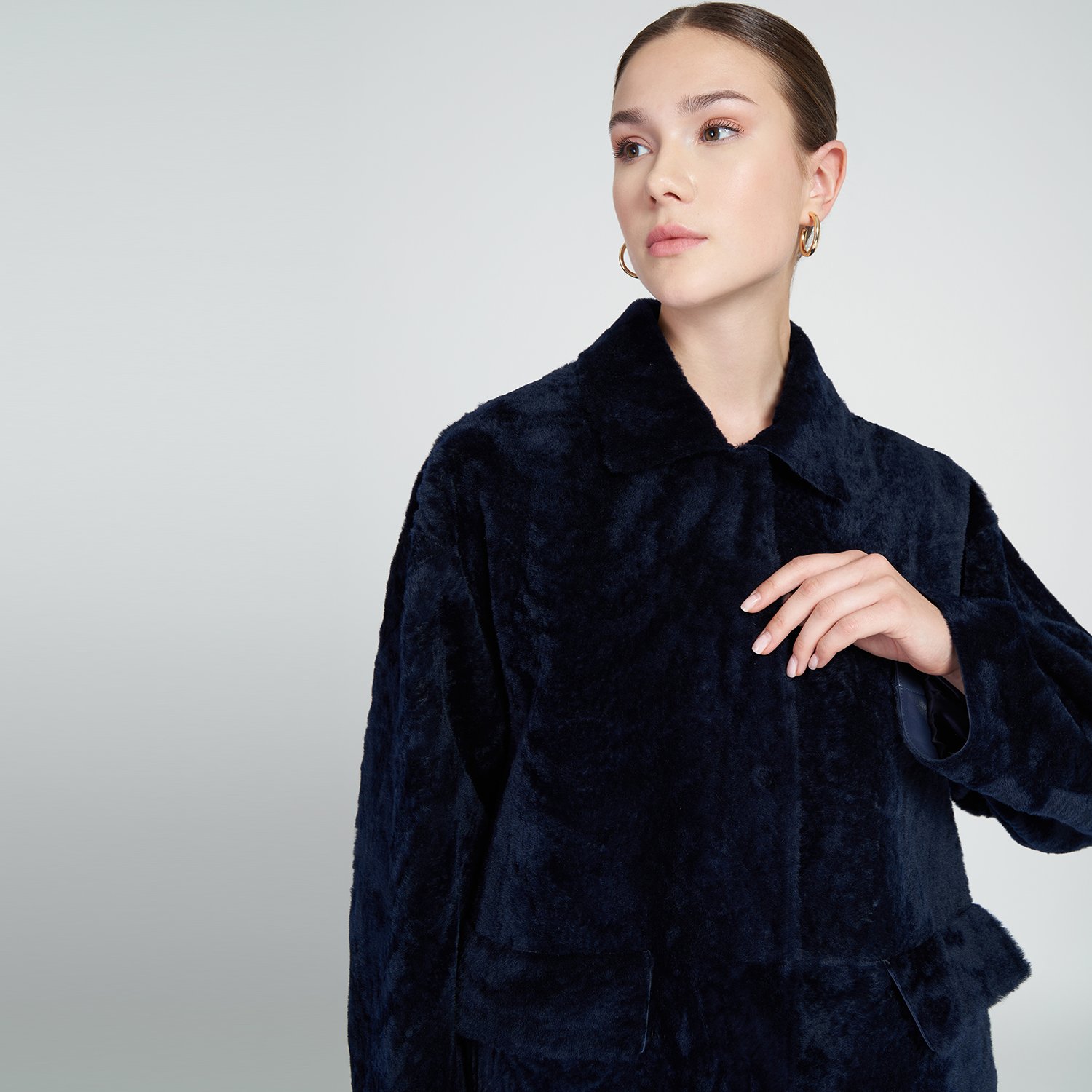 Yuvarlak yakalı önden gizli çıt çıt kapamalı kadın kürk kaban.