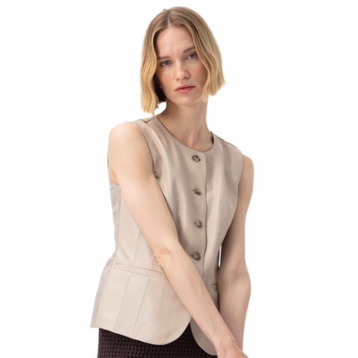 Kadın yuvarlak yakalı deri yelek.