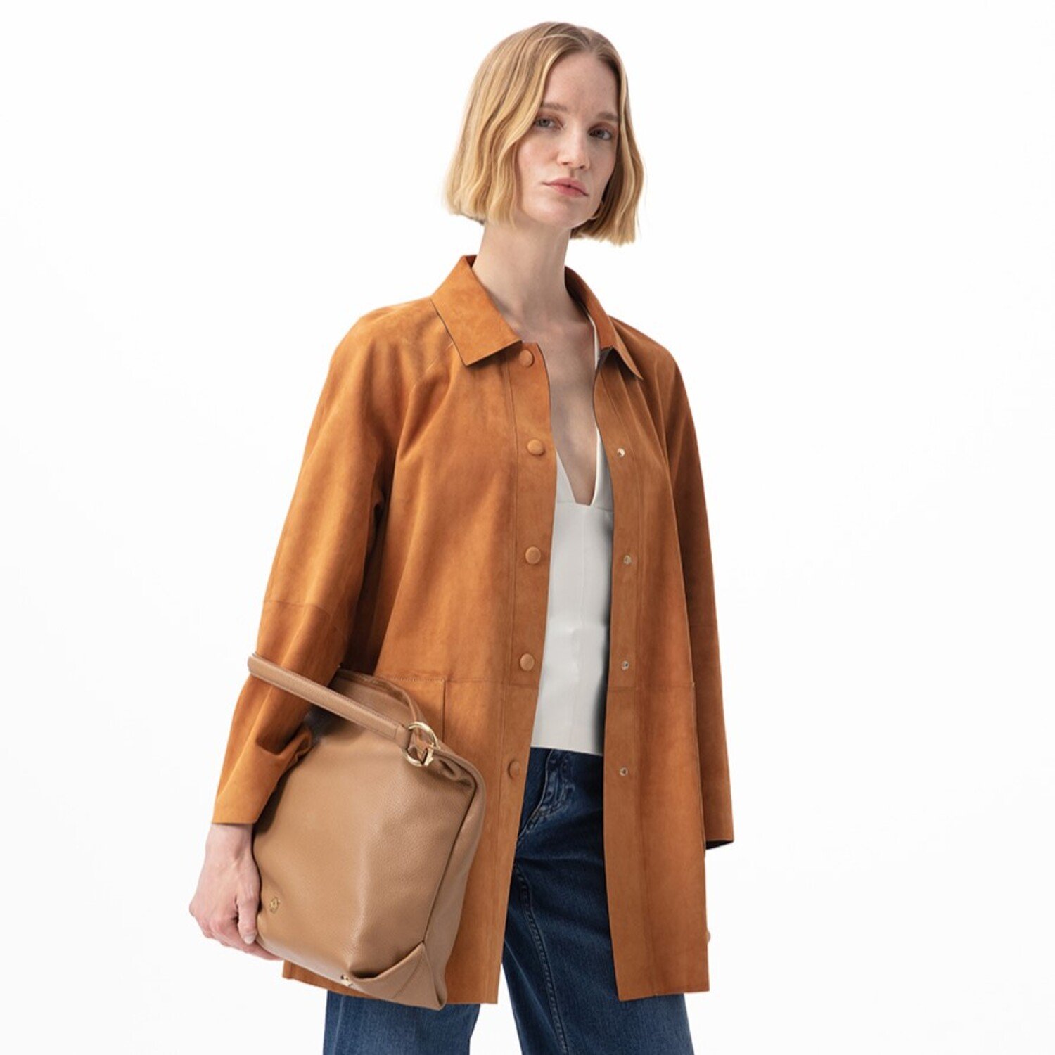 Kadın gömlek yakalı çift taraflı süet pardösü.