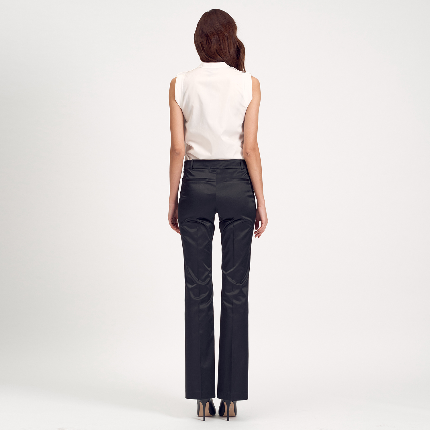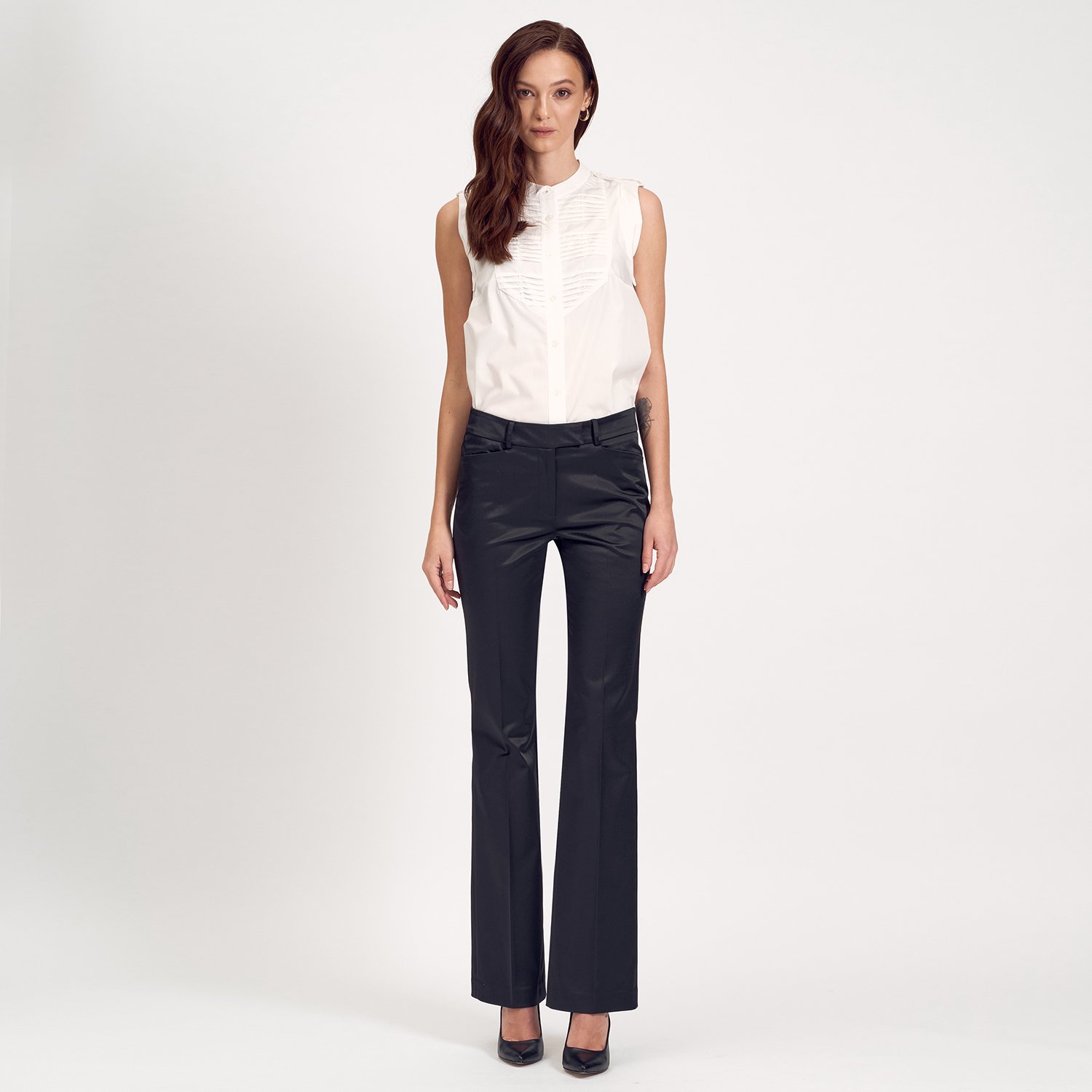 Düz kesim, orta bel, hafif geniş kemerli kadın pantolon.
