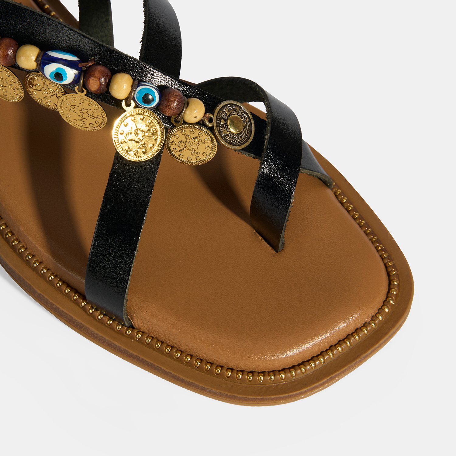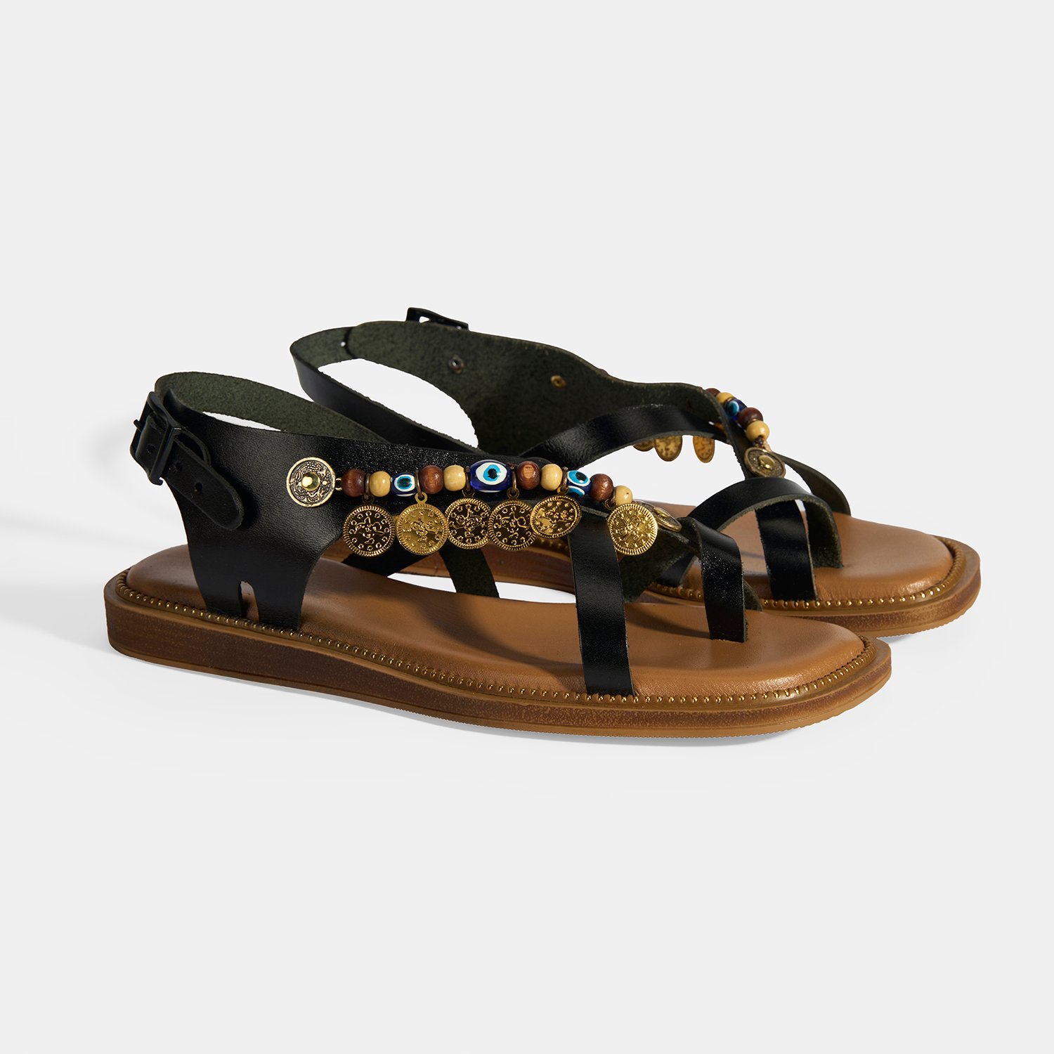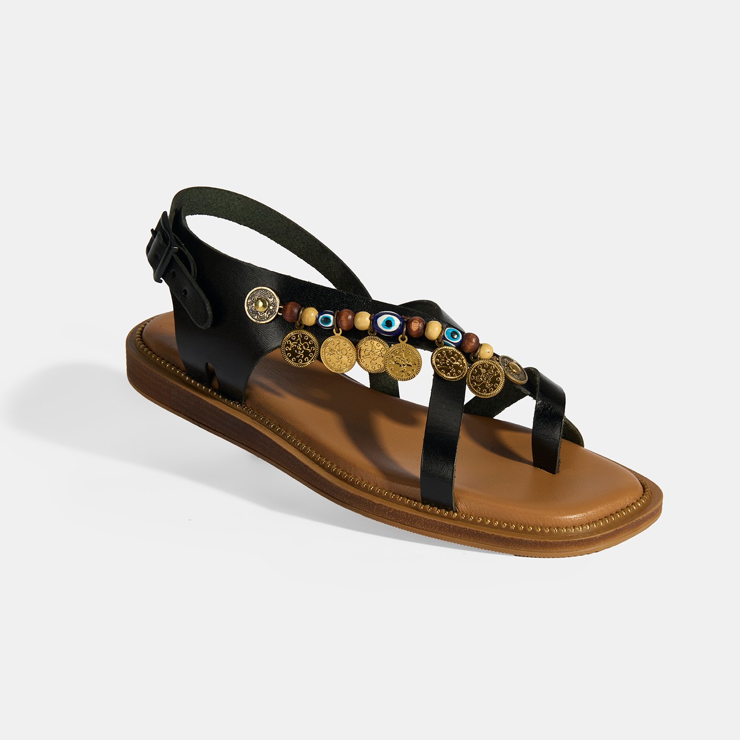 Siyah Kadın Toka Detaylı Aksesuarlı Deri Sandalet