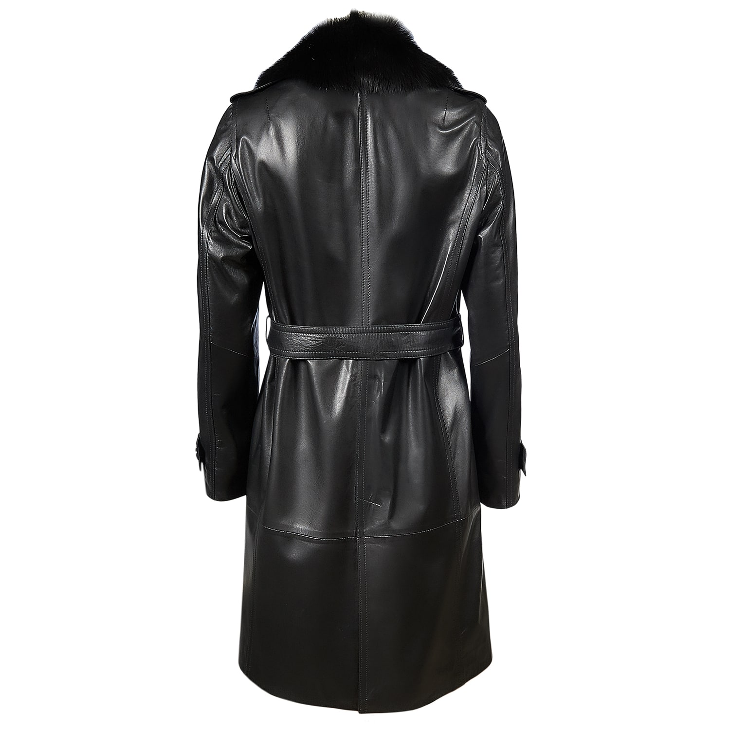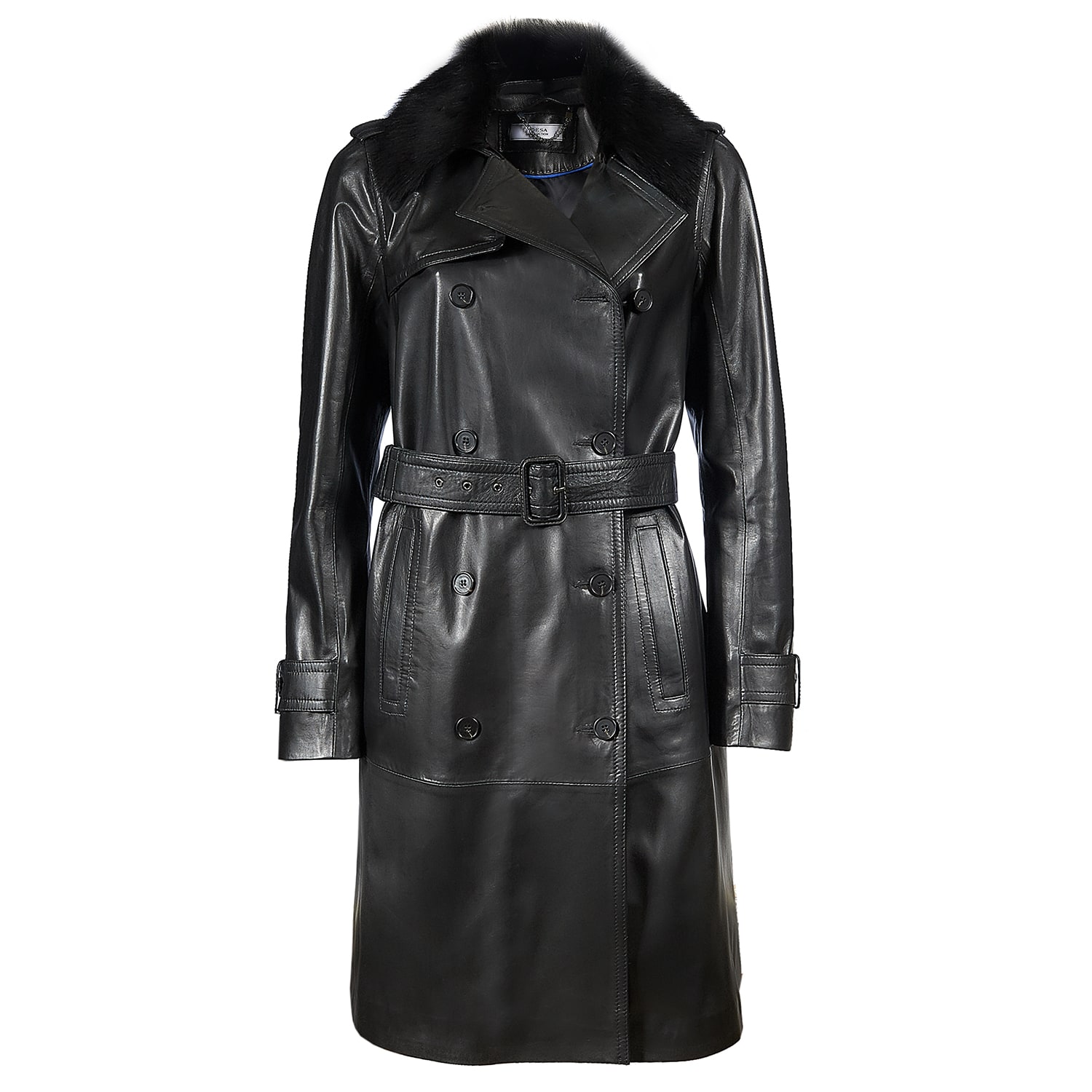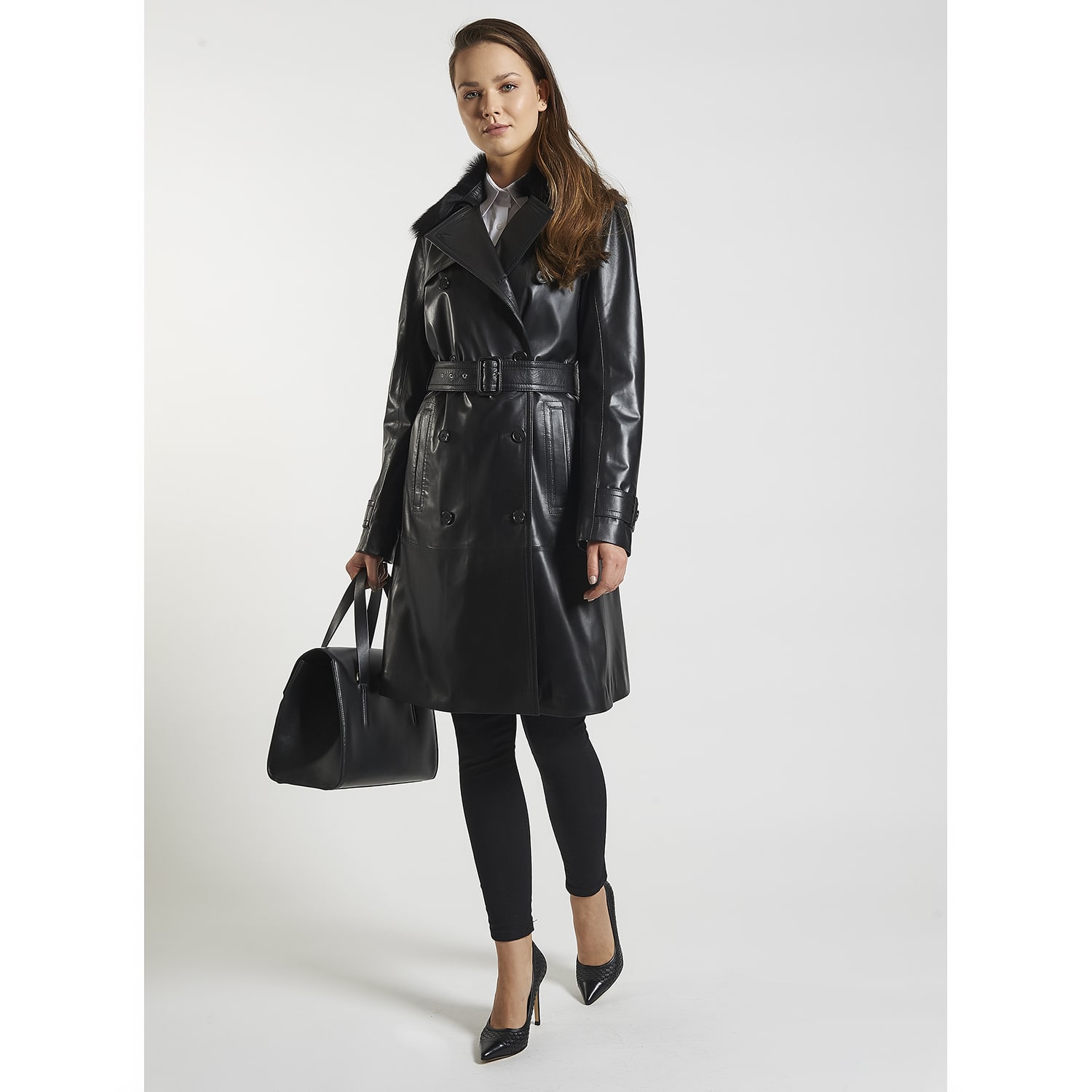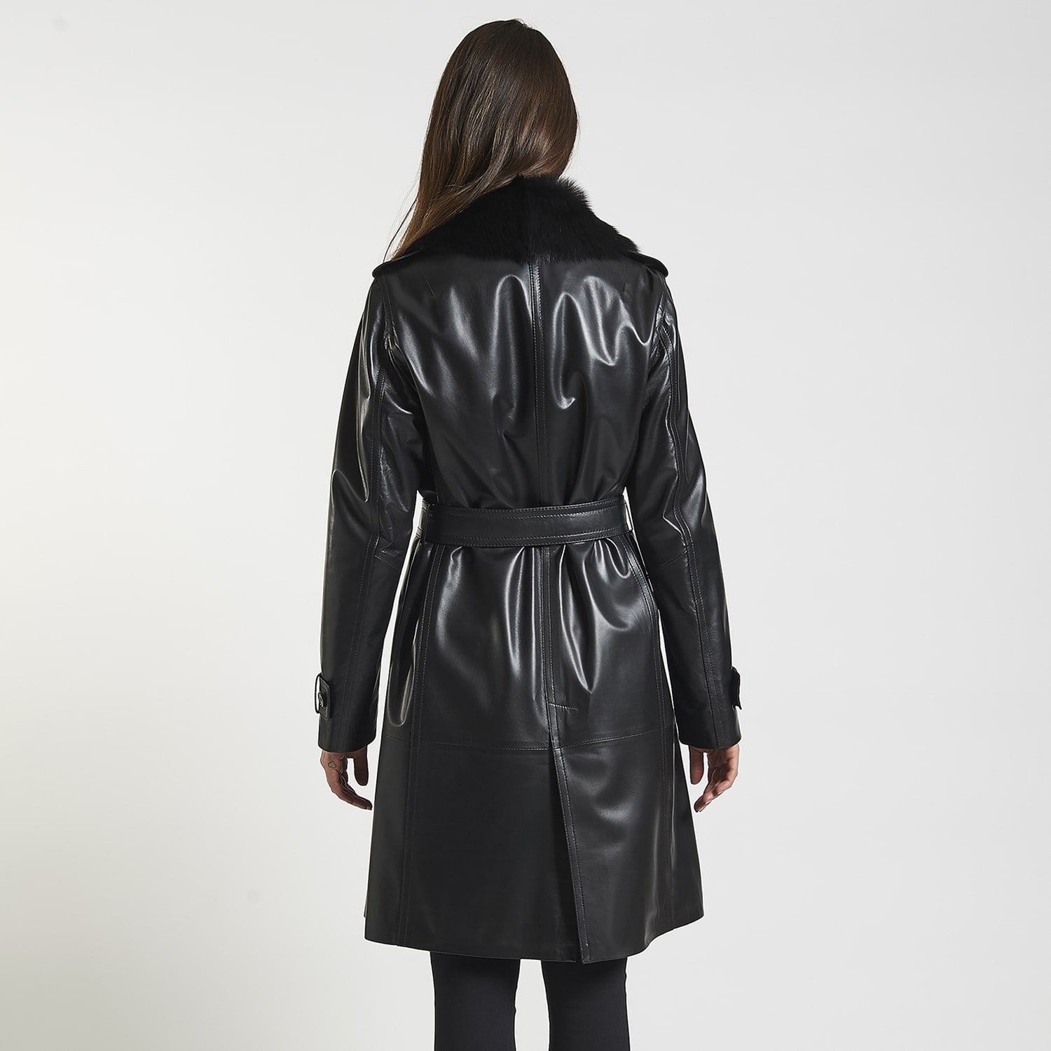 Çıkma kürk yakalı, önden kruvaze düğme kapamalı kadın trench.