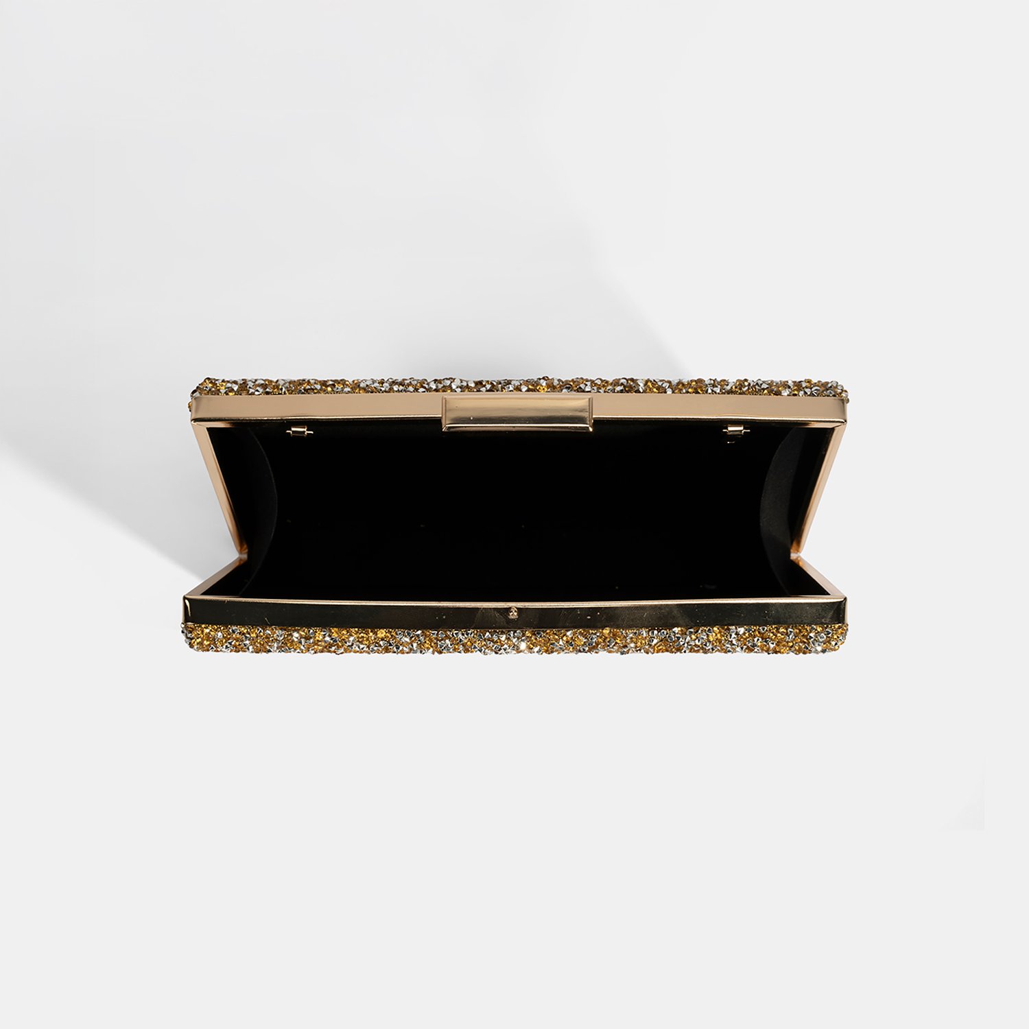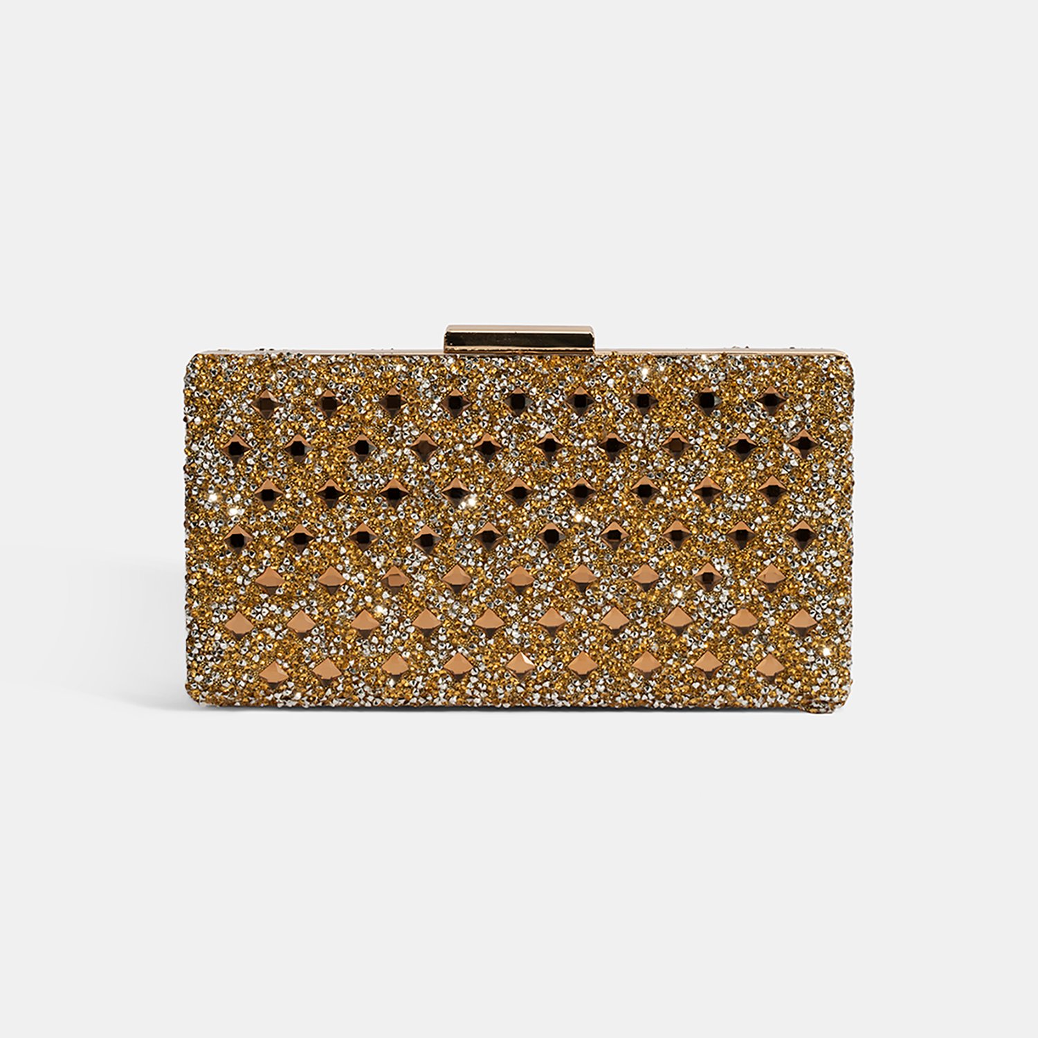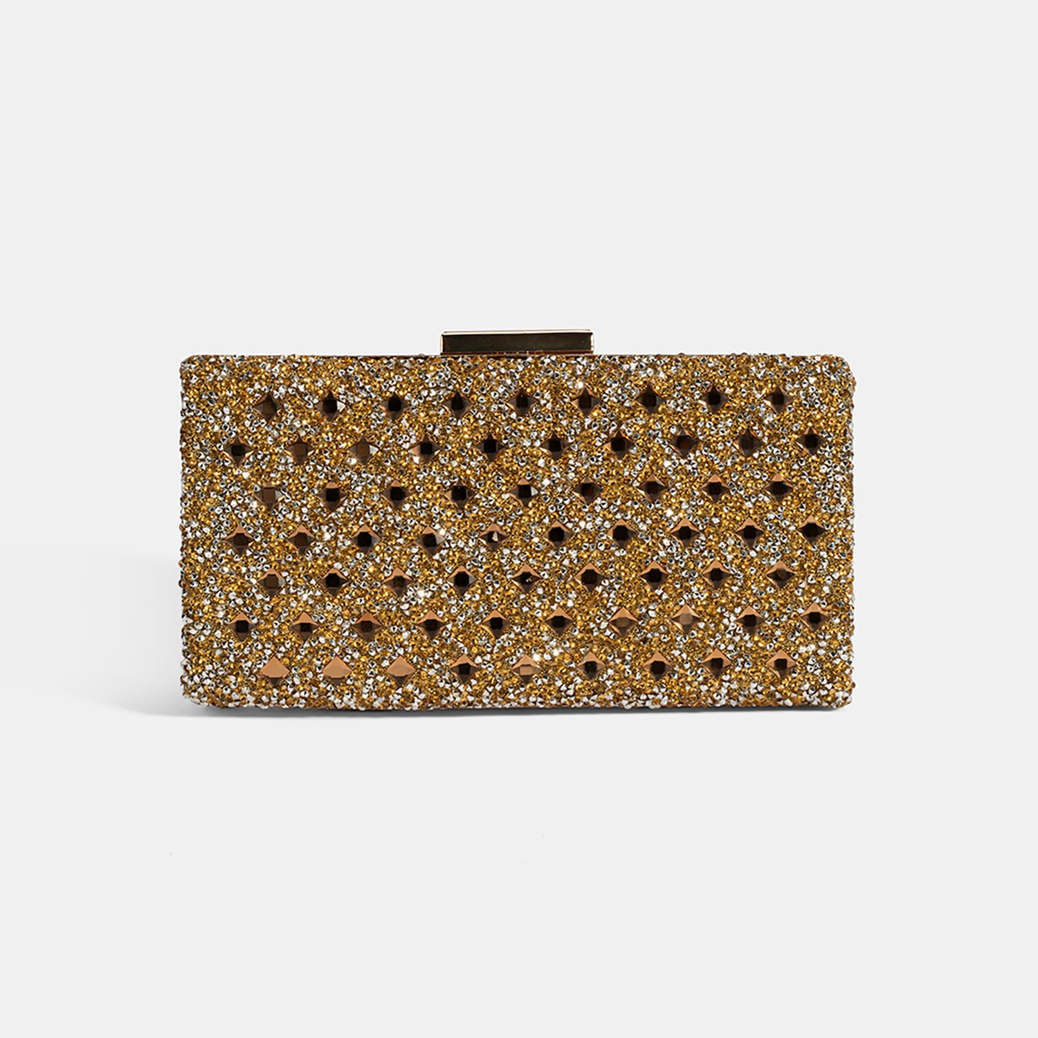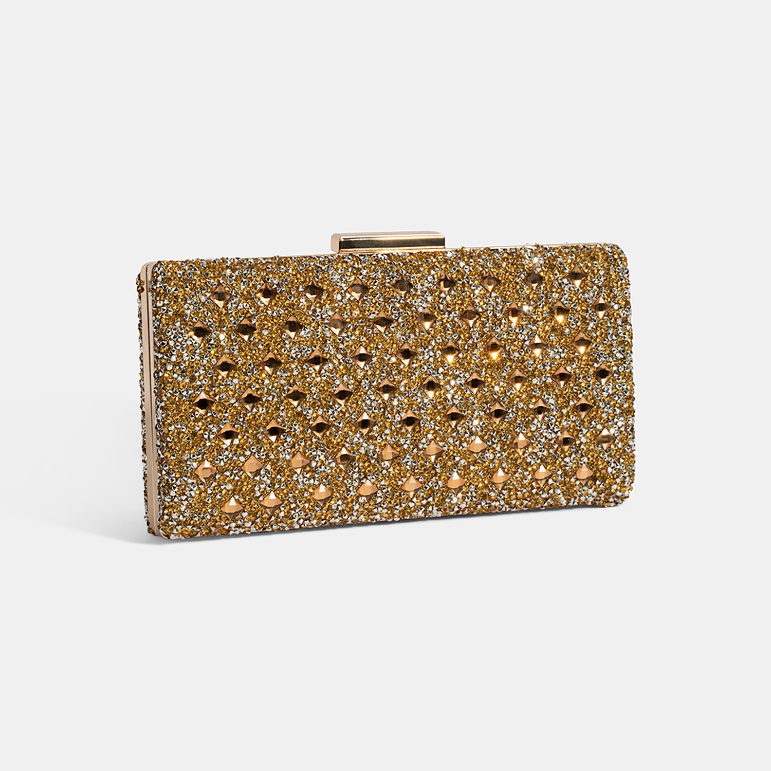 Işıltılı taşlarla kaplanmış bu gold clutch, gece davetlerinde tüm dikkatleri üzerinize çeker.