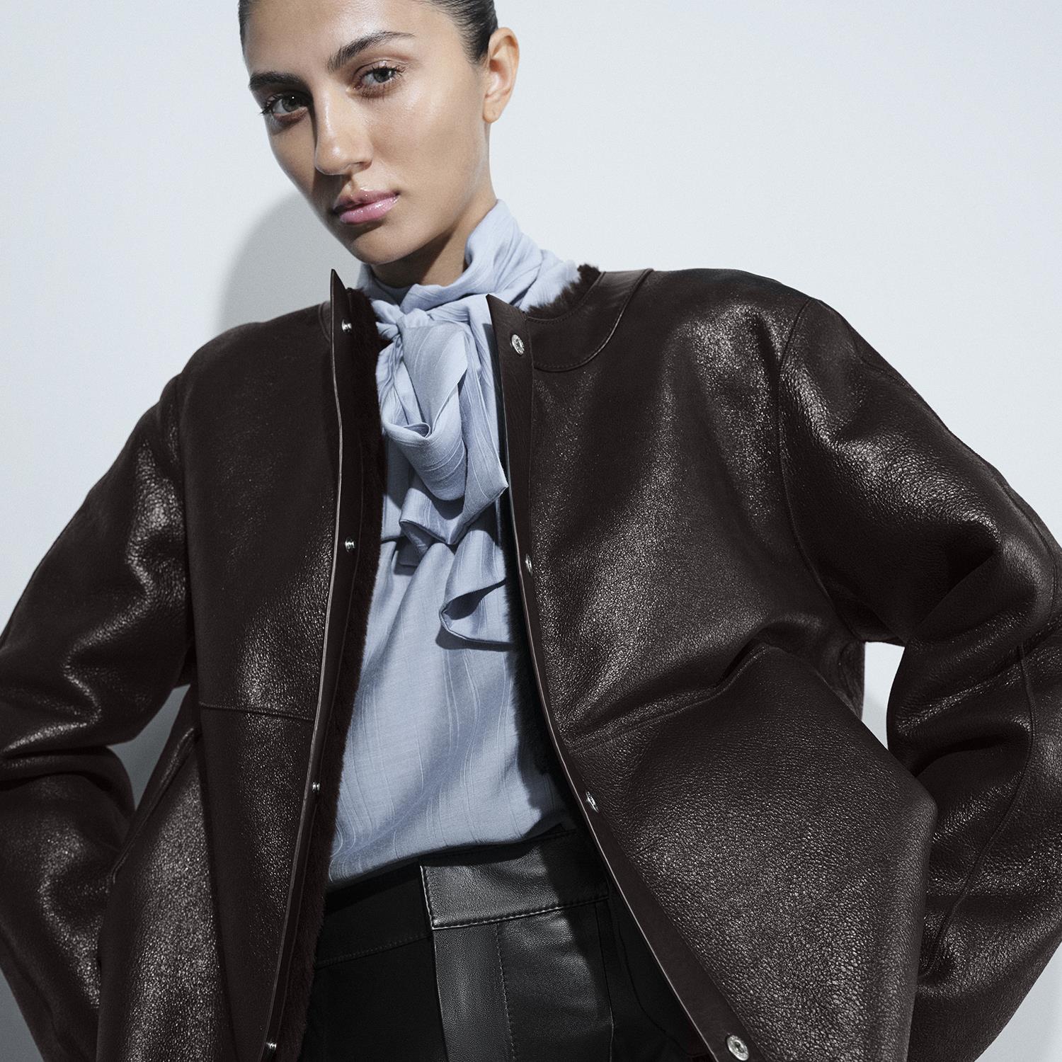 Yuvarlak yakalı çift tarafllı kürk ceket.