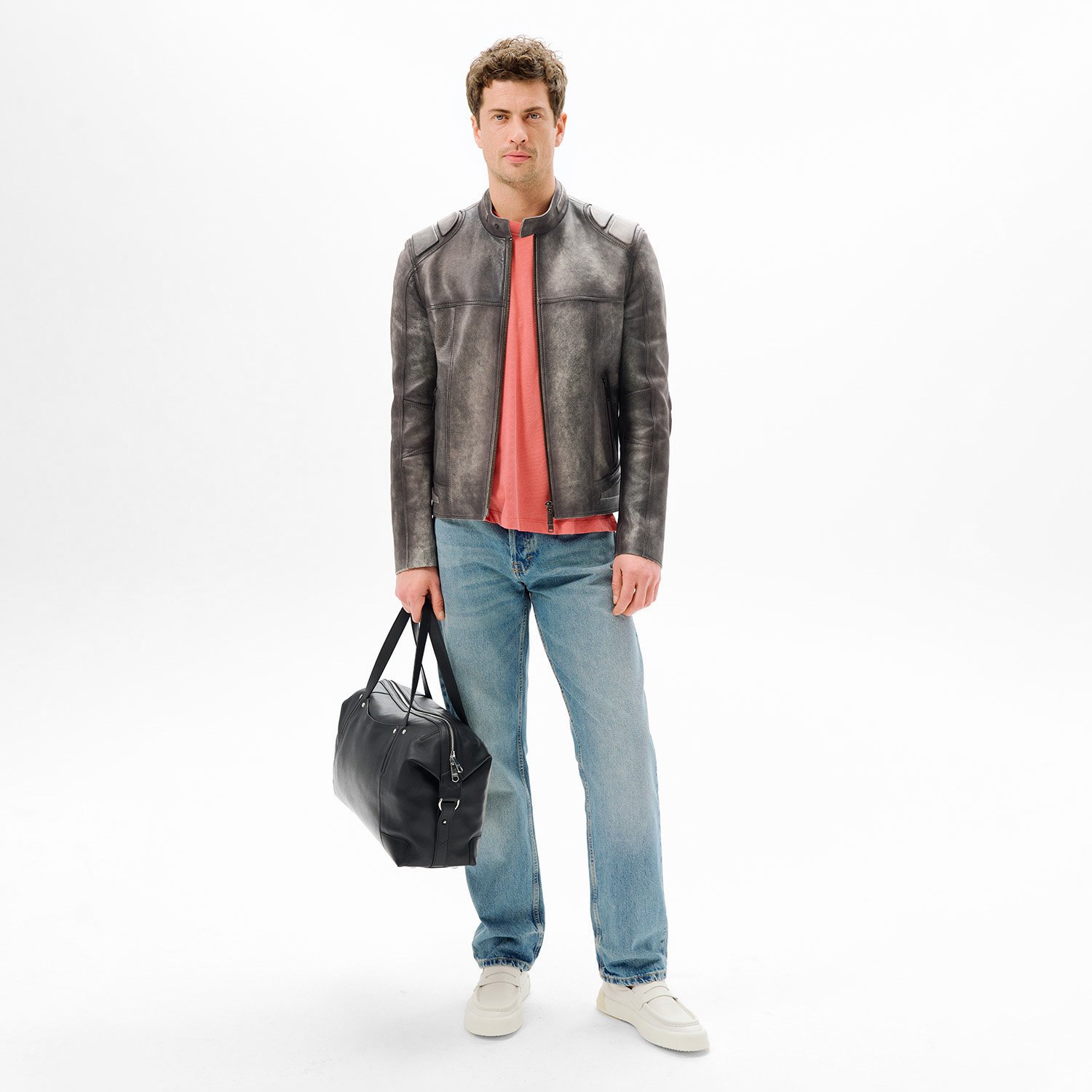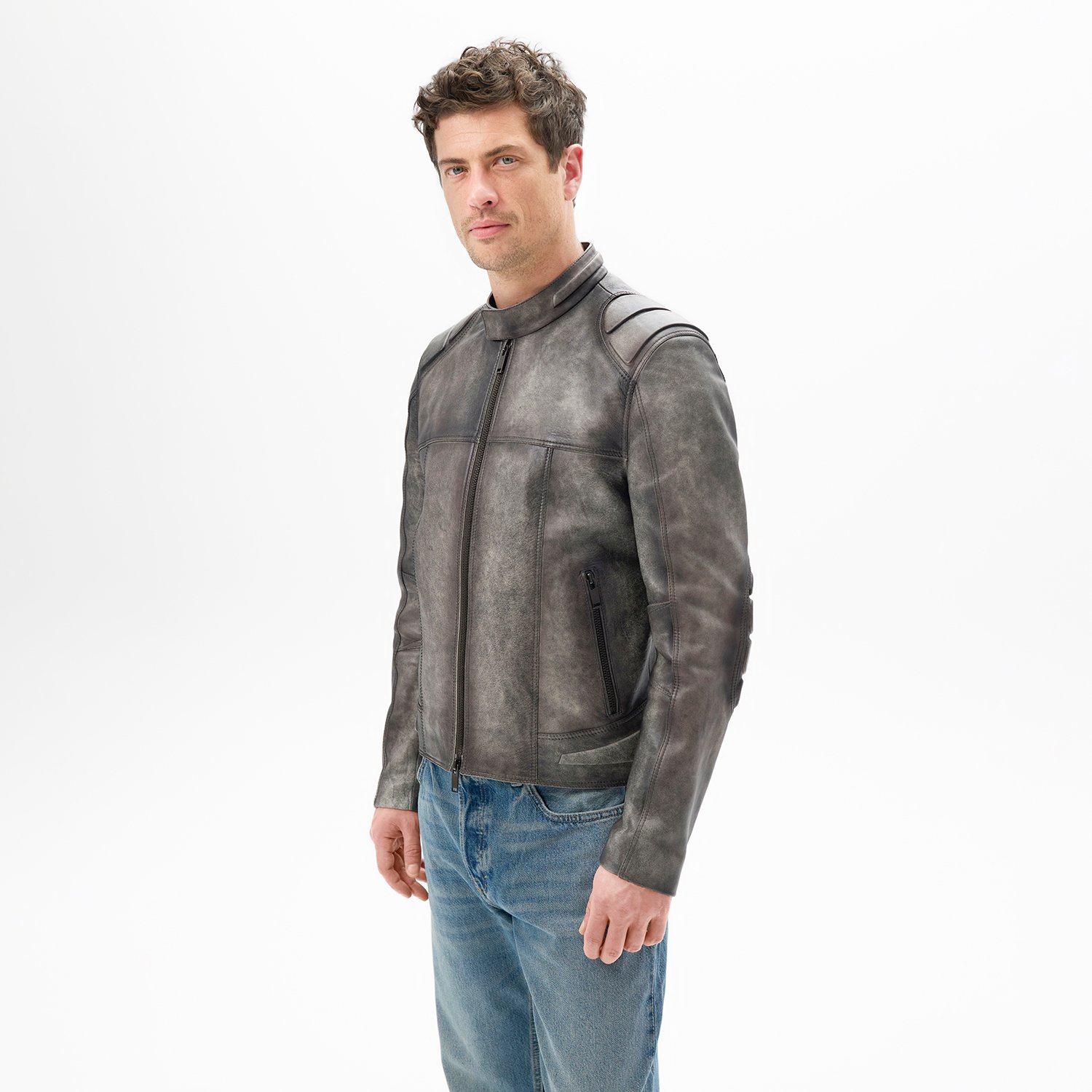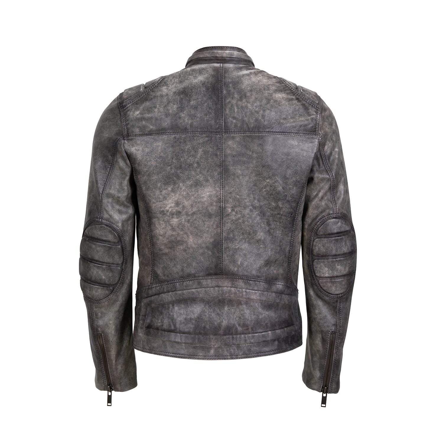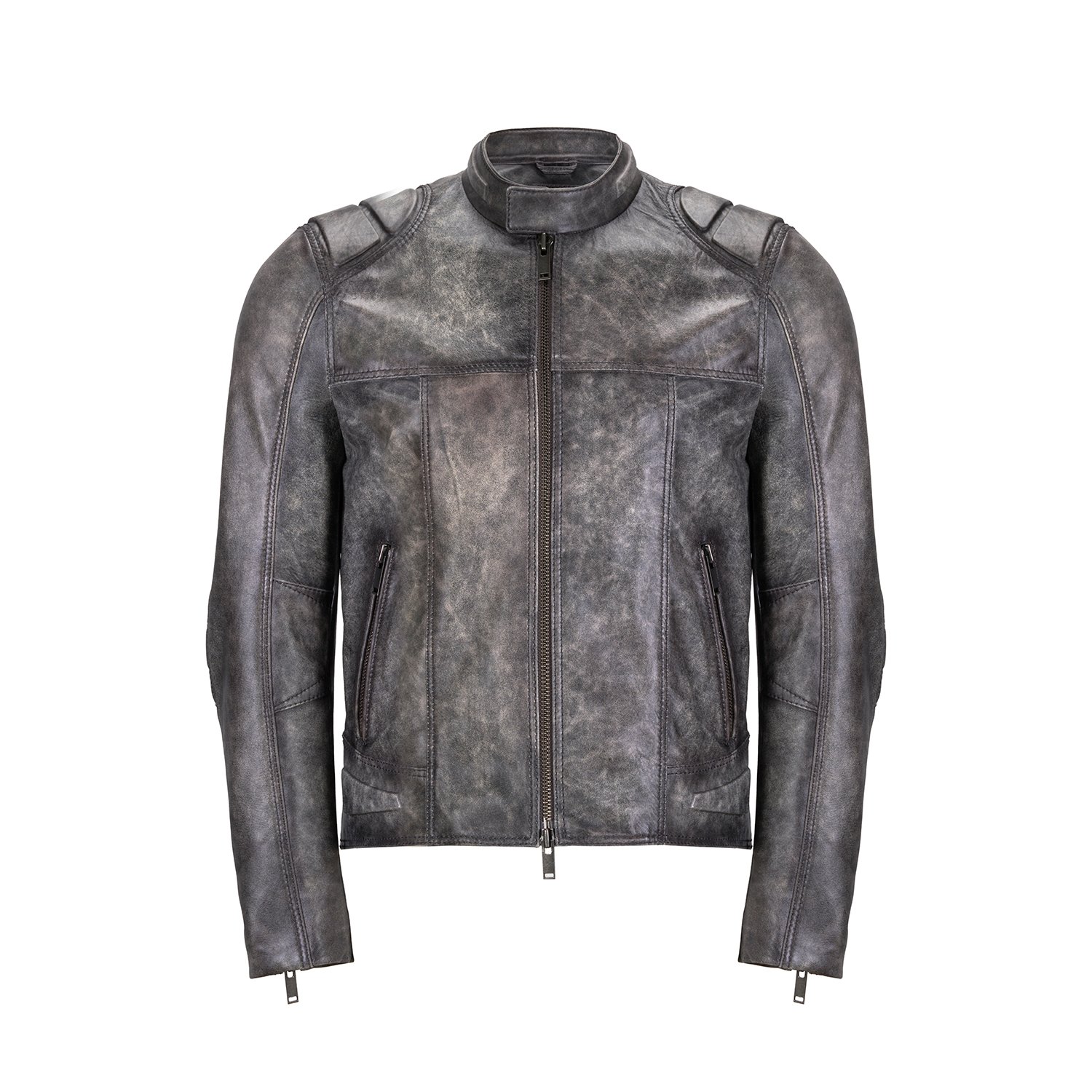Erkek hakim yakalı vintage deri ceket, önden metal fermuar kapamalıdır.