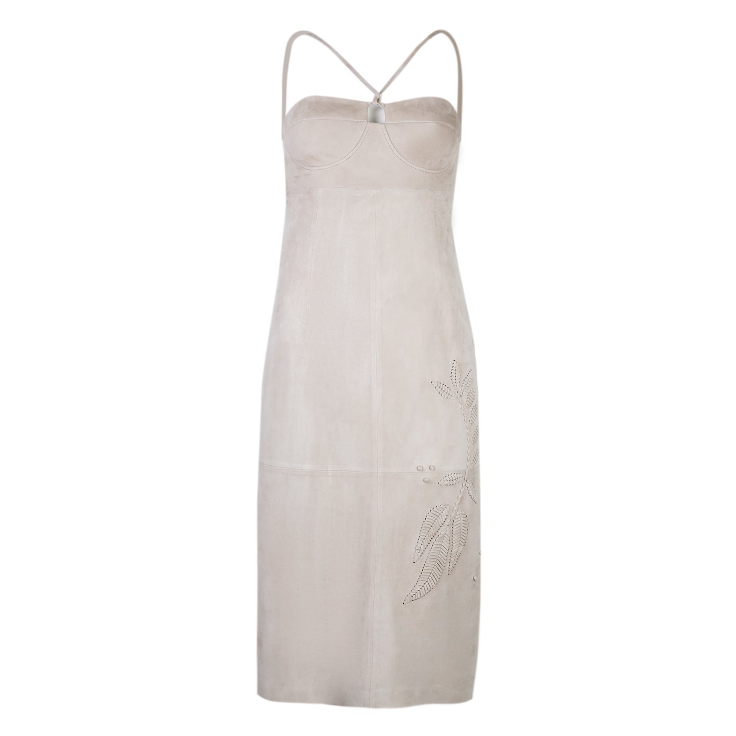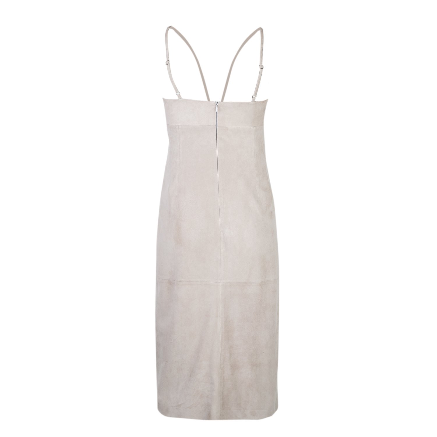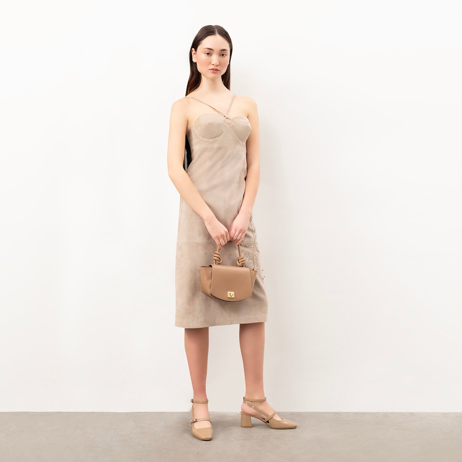 Kadın ince askılı işleme detaylı midi süet deri elbise.