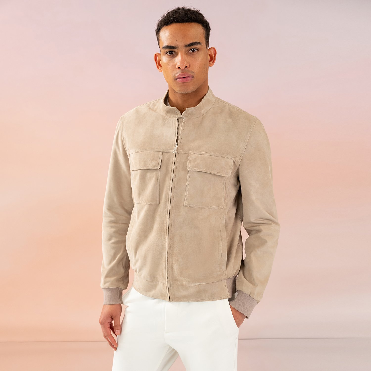 %100 Keçi derisi erkek hakim yakalı süet bomber ceket.