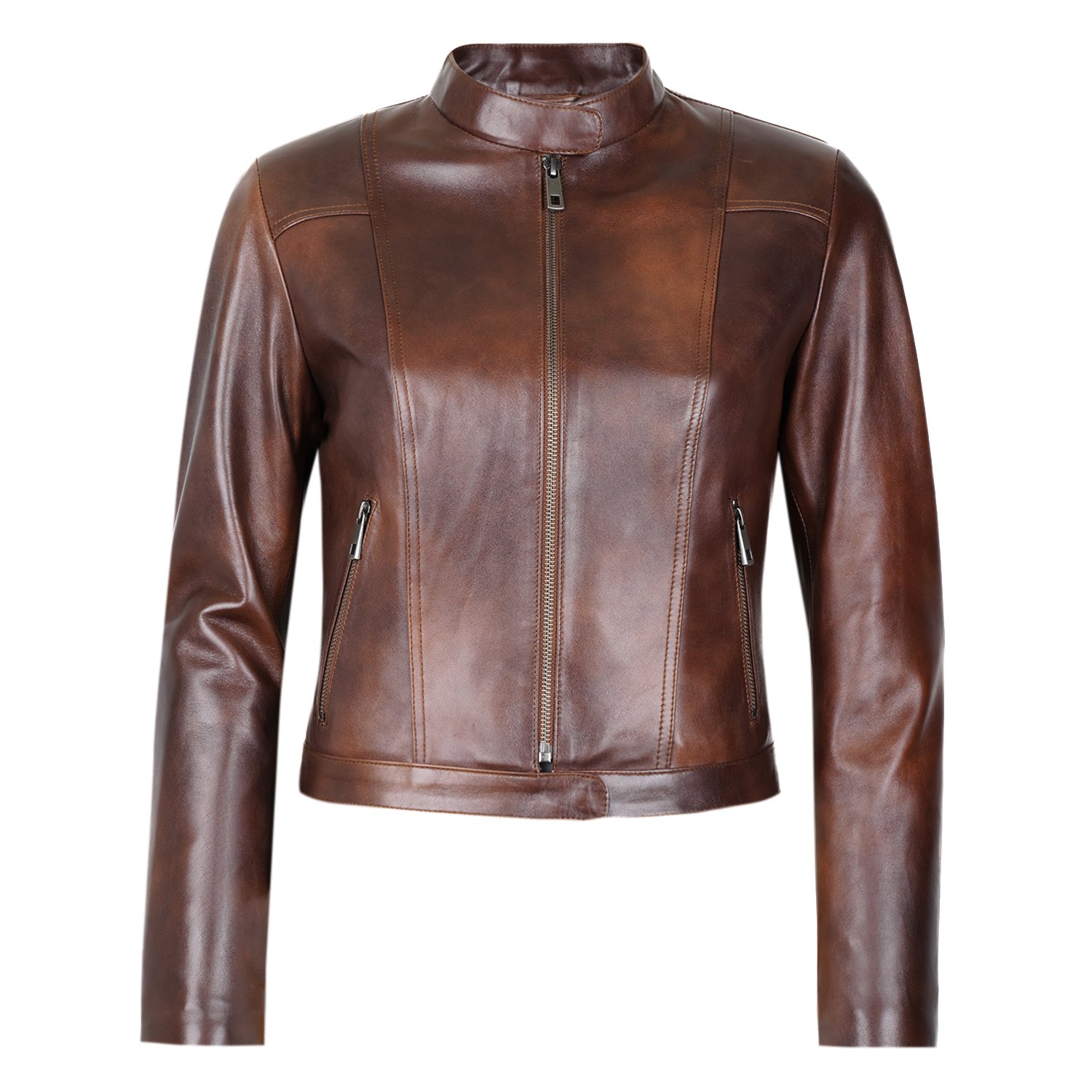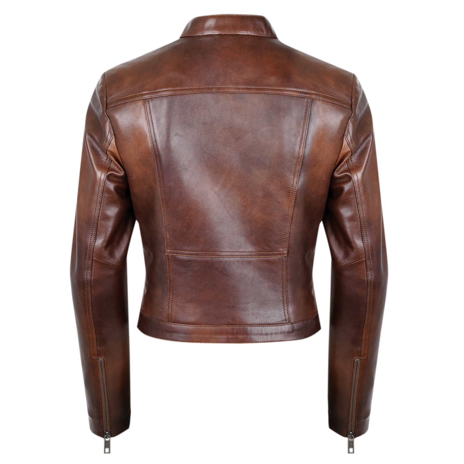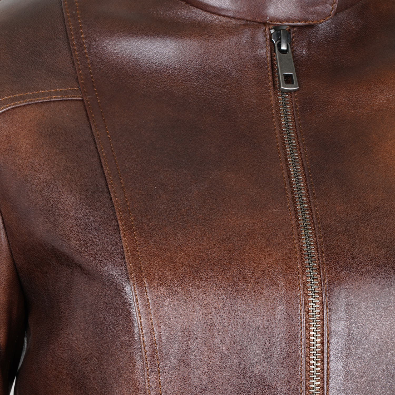 Kadın hakim yakalı vintage deri ceketi, %100 koyun derisinden üretilmiştir ve sağlıklı, modern ve uzun ömürlü bir üründür. Önden metal fermuar kapama ve iki adet metal fermuarlı yandan girişli cep, ceketin kullanışlılığını arttırırken, kollarda bulunan metal fermuar detayları da cekete hareketlilik kazandırır. Özel olarak uygulanan vintage efekt, deri cekete benzersiz bir tarz ve karakter kazandırır. %100 koyun derisinden üretilen bu ceket, astarlı çalışması sayesinde konforlu bir kullanım sunar. Kadınların gardırobunda vazgeçilmez bir parça olan bu ceket, sağlıklı ve modern bir seçimdir.