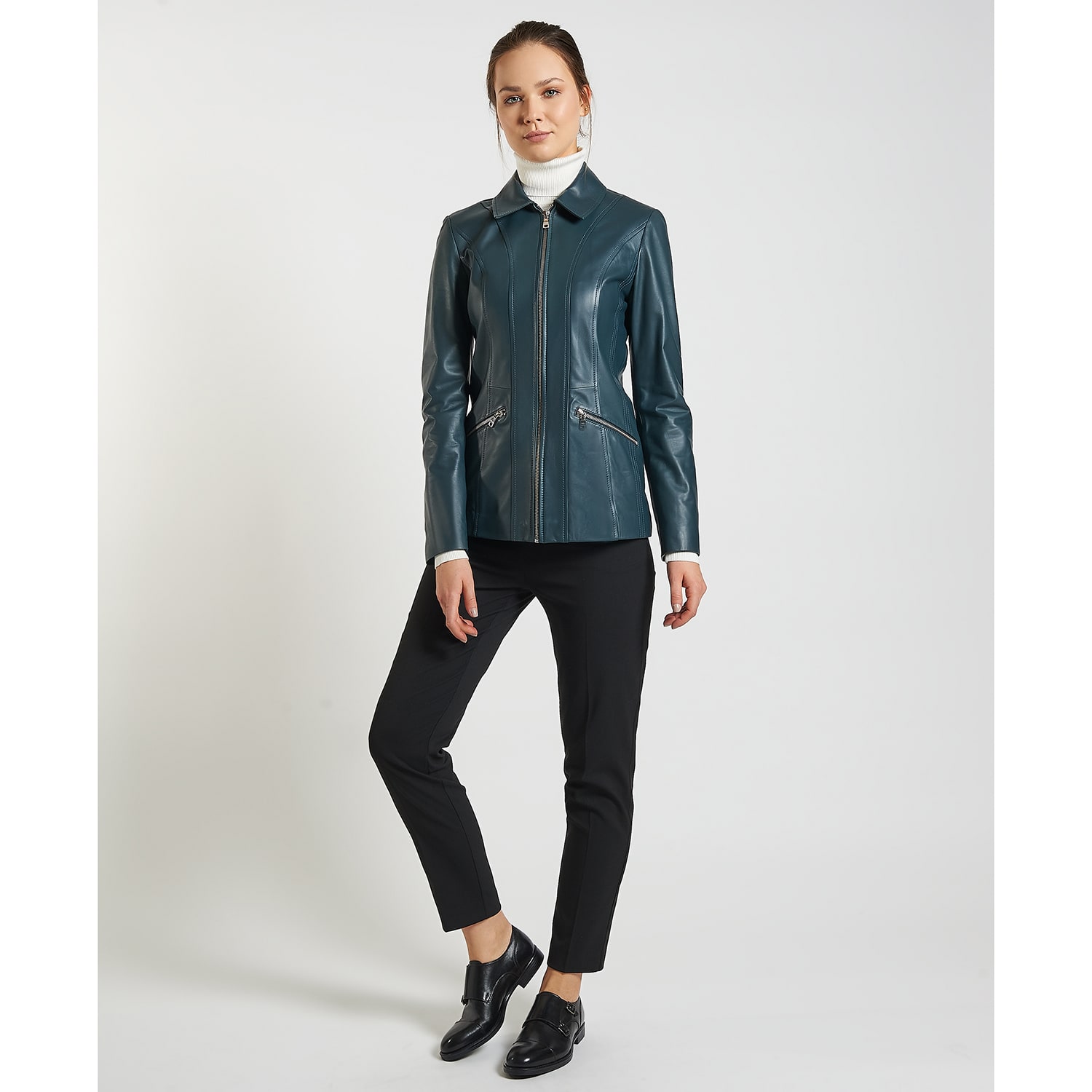 Gömlek yakalı, önden metal fermuar kapamalı.