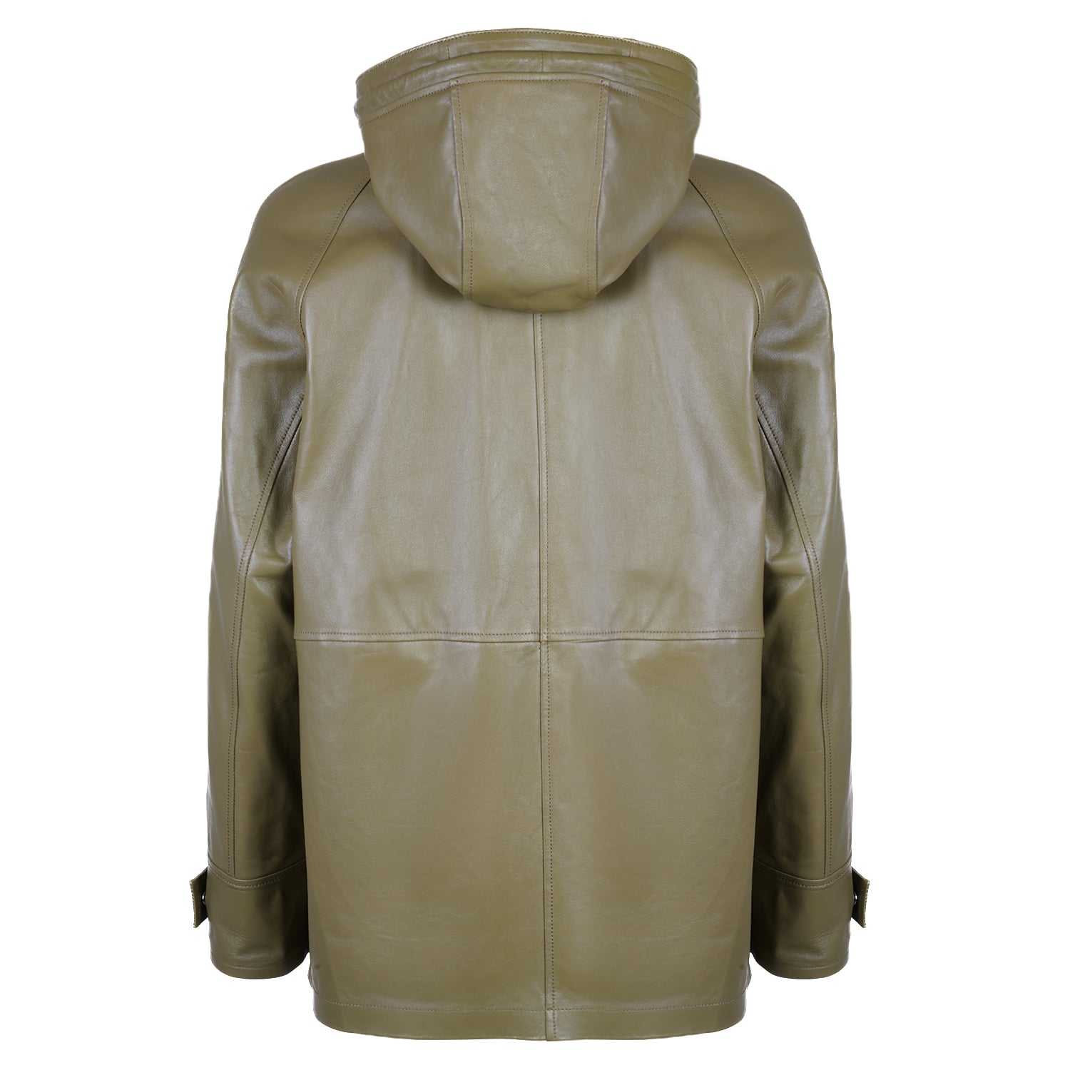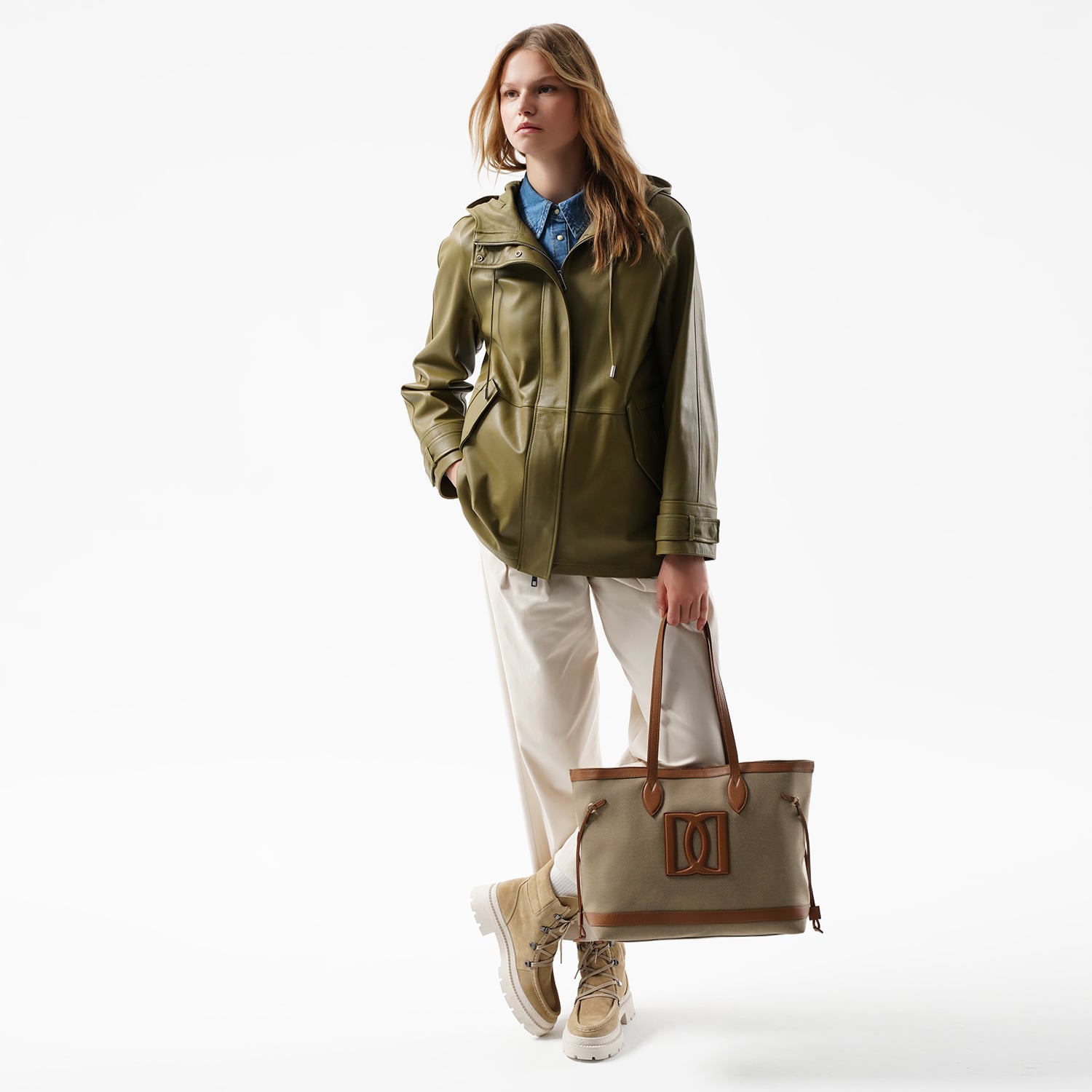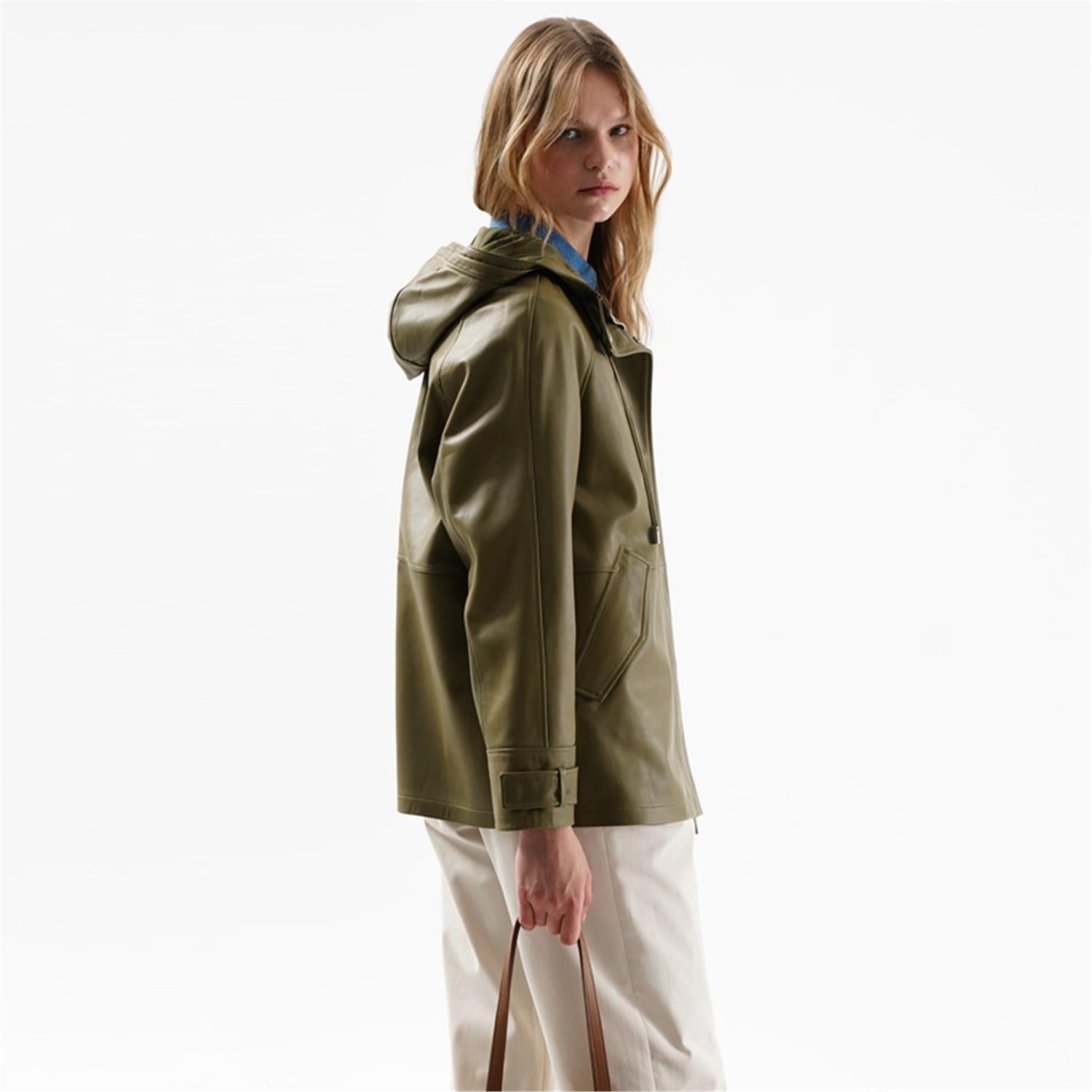 Kadın kapüşonlu deri pardösü.